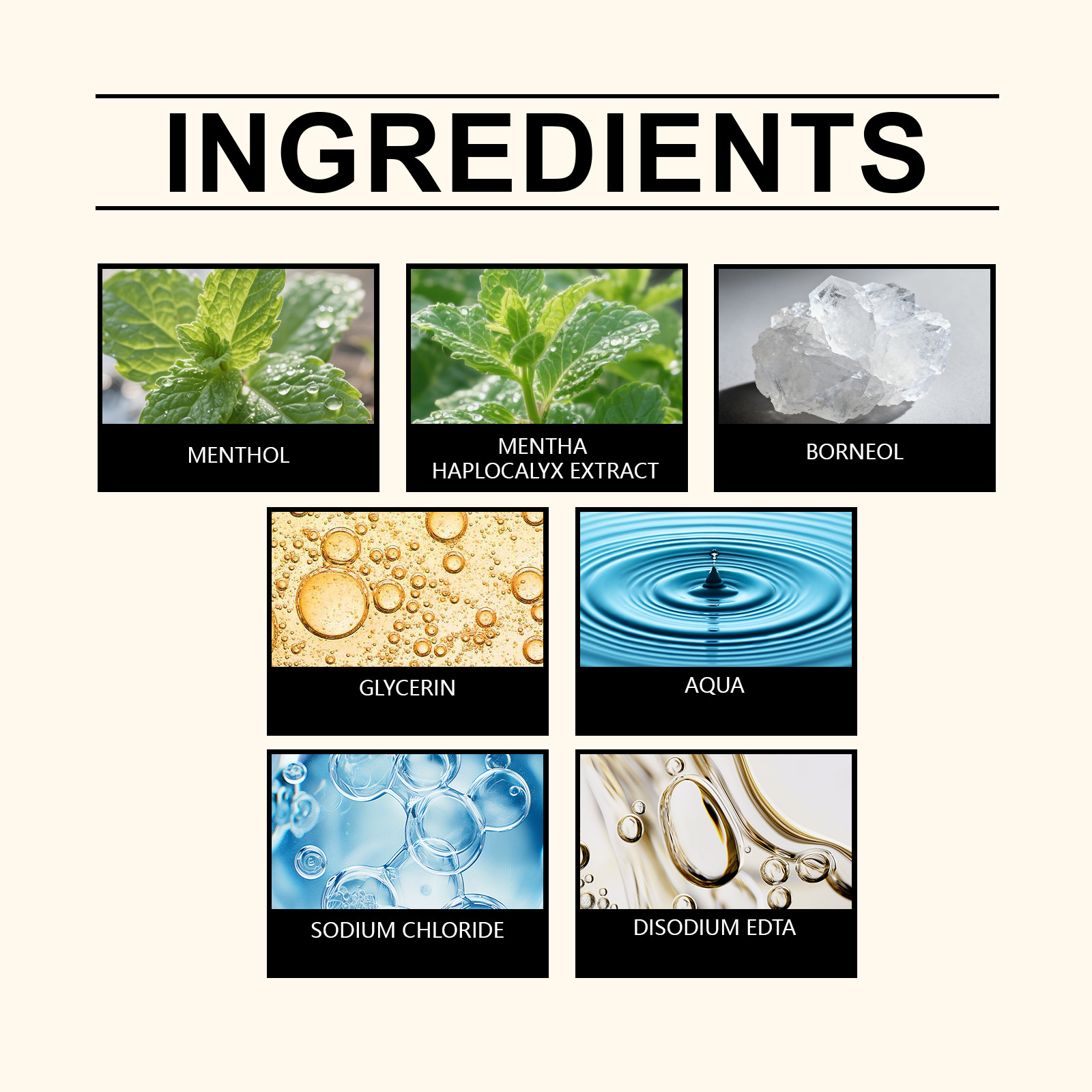 Product information:Ingredients: water, glycerin, sodium chloride, menthol, mint extract, borneol, disodium EDTA.
