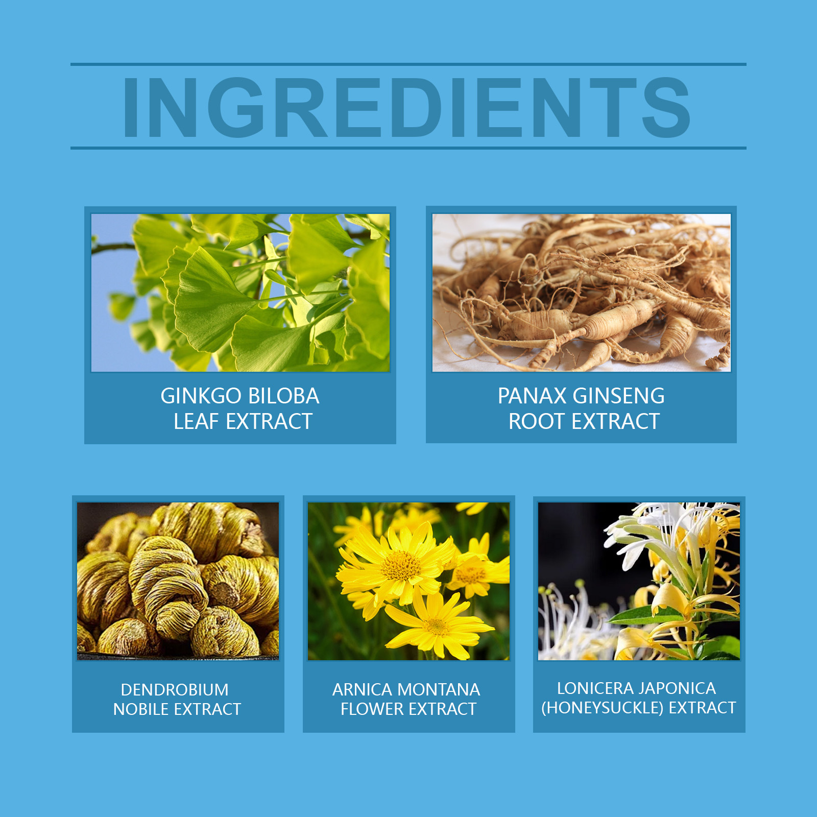 Ingredients: ginkgo leaf extract, extractive of ginseng's root, Dendrobium extract, arnica extract, honeysuchle flowers extract
