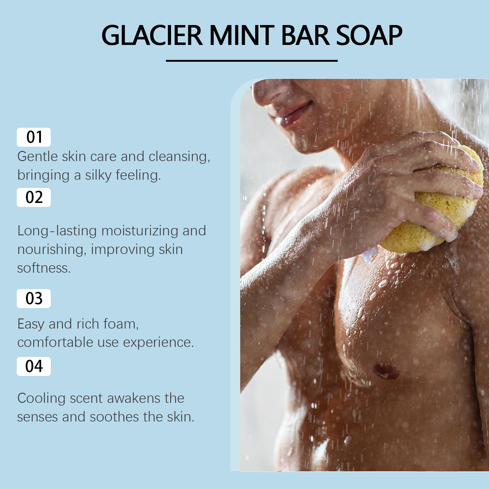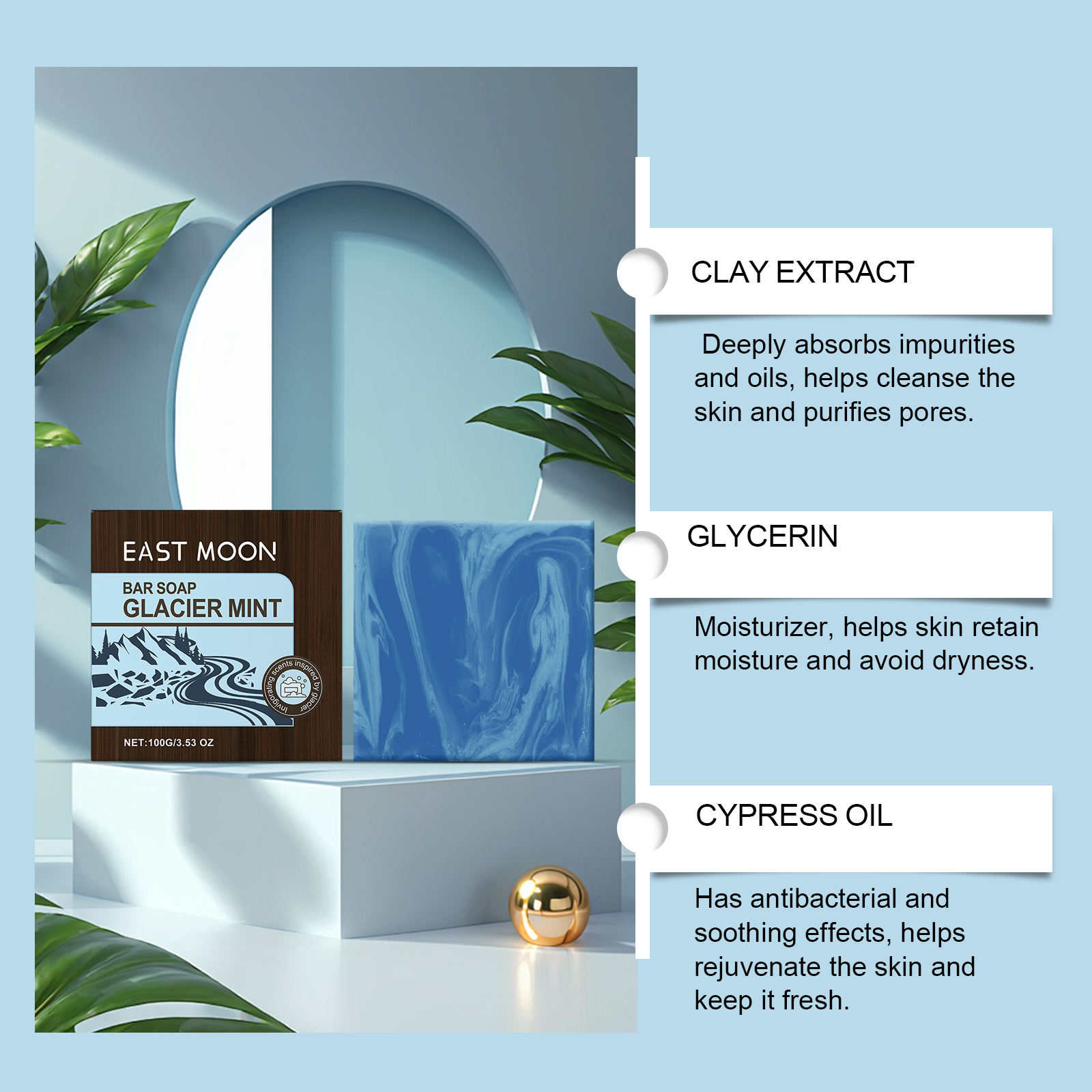 Our Glacier Mint bath soap contains peppermint oil, cypress oil, clay extract. It can make the skin have a sense of moisture, long-term dry. Its use is simple: Wet the soap and gently rub your hands together to create a rich foam. Apply the foam evenly to the skin and massage gently to clean. Rinse thoroughly with clean water to ensure no foam remains. After use, keep the soap in a dry place and avoid soaking in water. And can be fresh smell, comfortable experience, refreshing skin.
