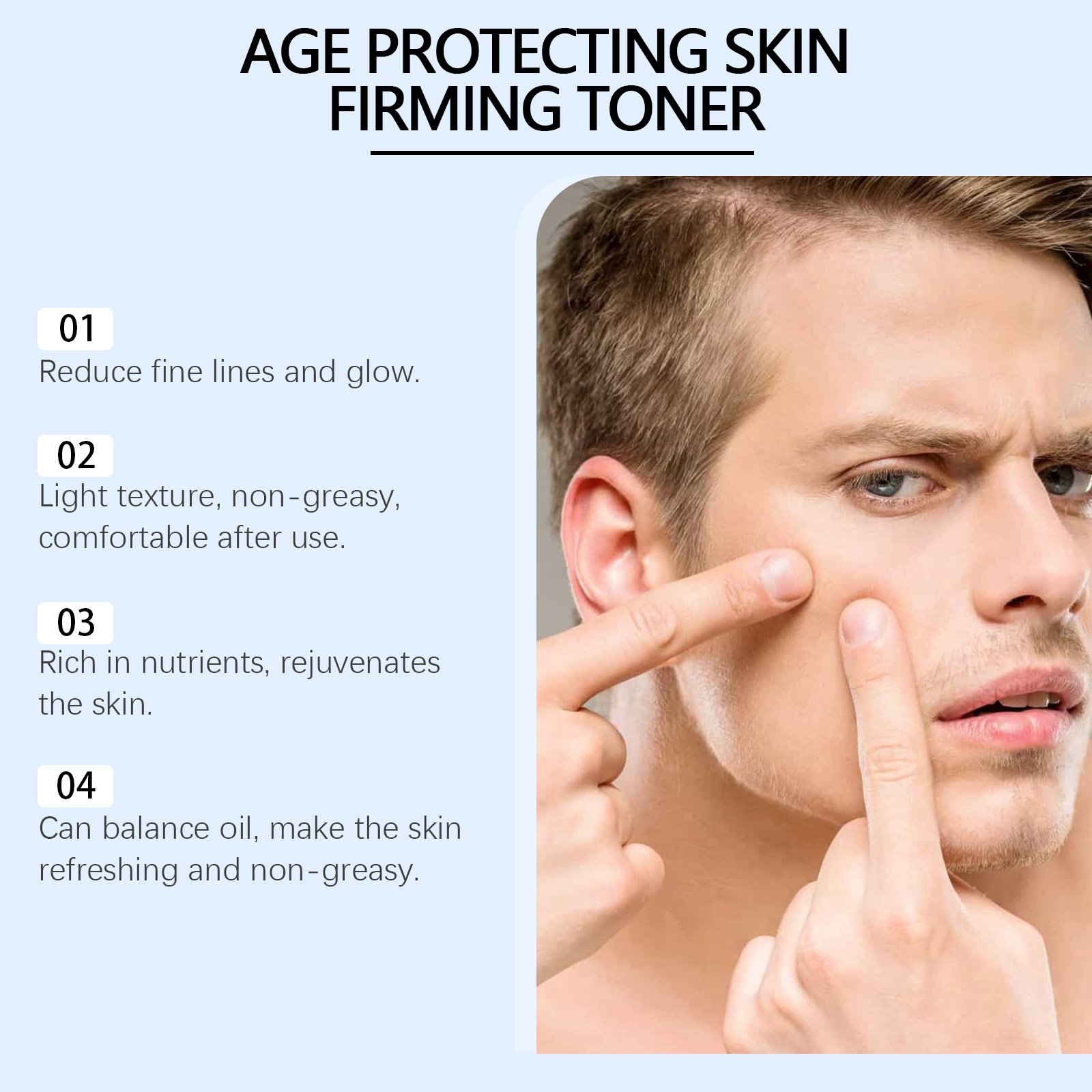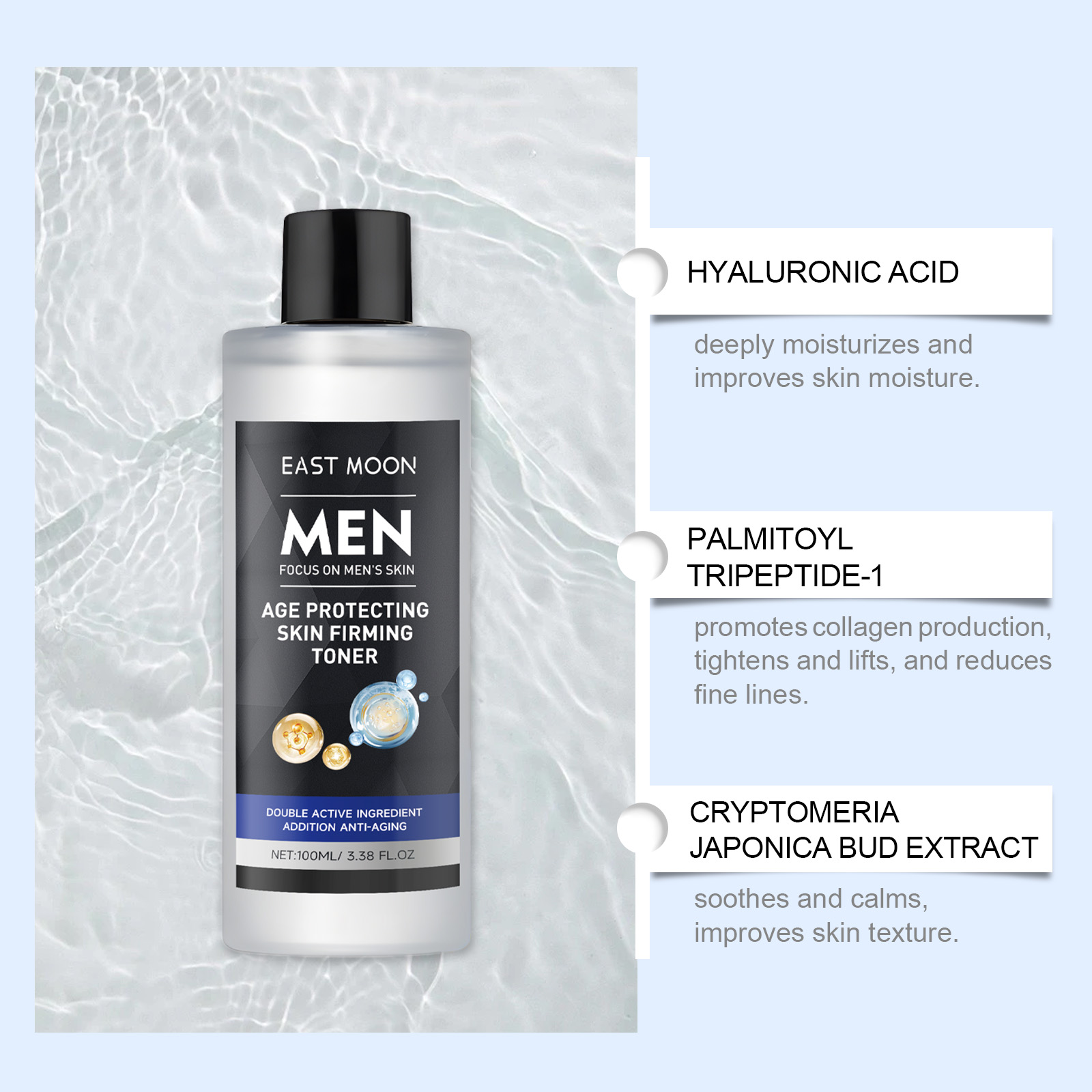 Our Men's firming toner contains palmitoyl tetrapeptide-7, sweet almond oil and cryptomeria bud extract. It can deeply nourish and improve skin moisture. The way to use it is simple: clean dry facial skin. Apply appropriate amount of product to face evenly. Dab until absorbed. And can tighten the skin, improve elasticity, reduce relaxation.