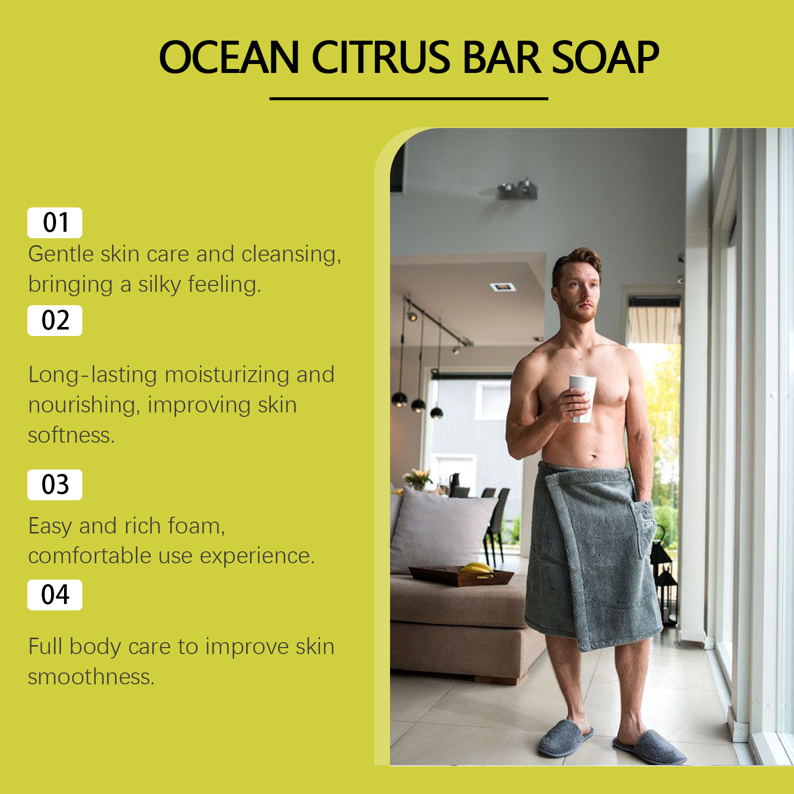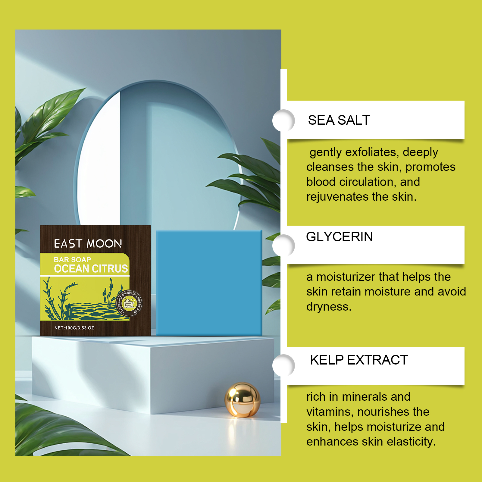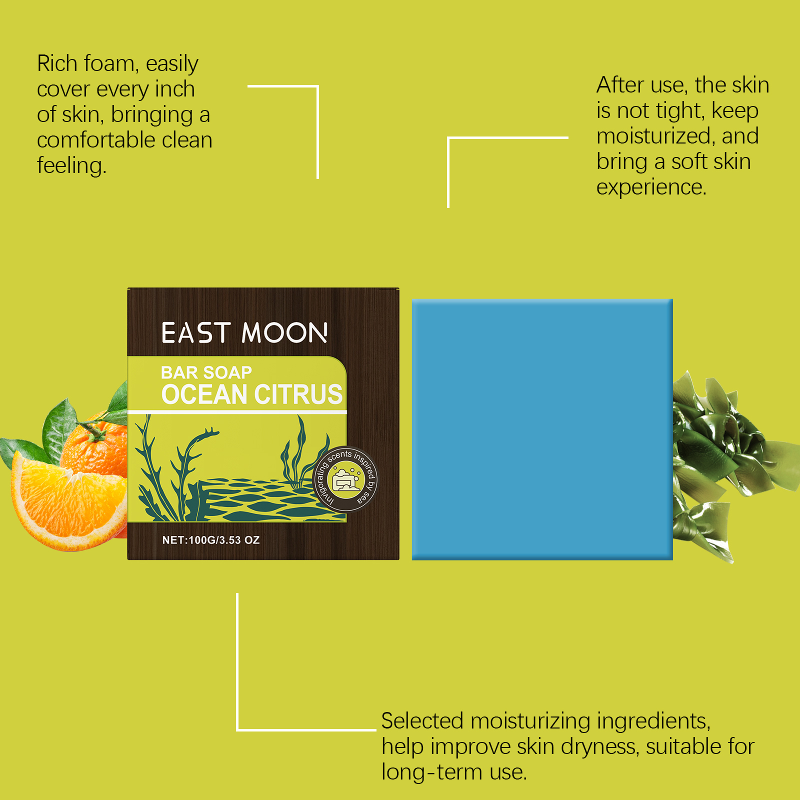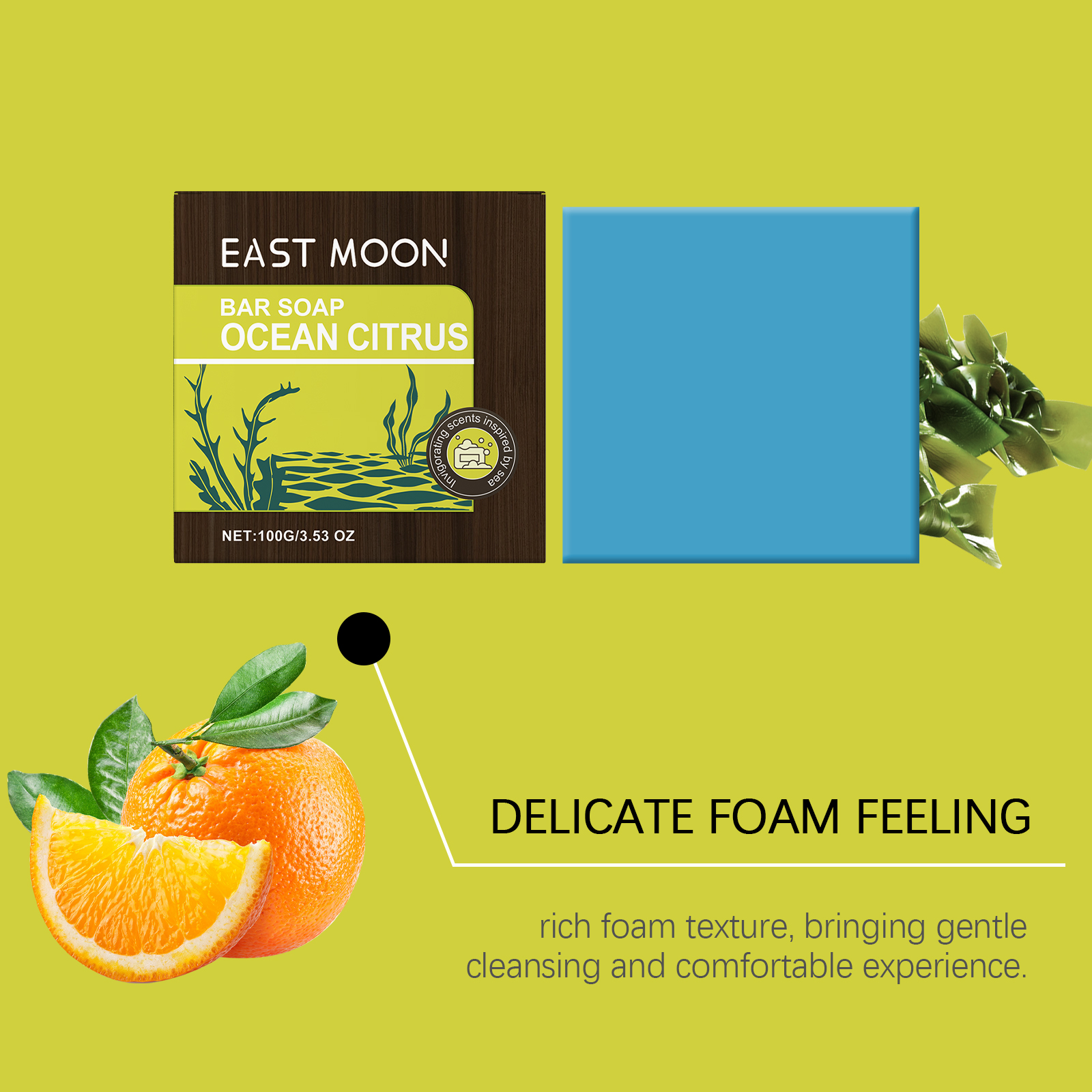 Our Marine citrus bath soap contains sea salt, citrus extract, kelp extract. It can make the skin have a sense of moisture, long-term dry. Its use is simple: Wet the soap and gently rub your hands together to create a rich foam. Apply the foam evenly to the skin and massage gently to clean. Rinse thoroughly with clean water to ensure no foam remains. After use, keep the soap in a dry place and avoid soaking in water. And can be fresh smell, comfortable experience, refreshing skin.