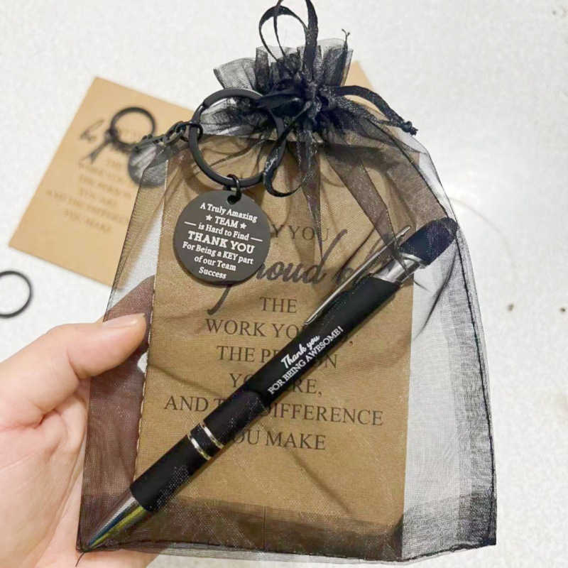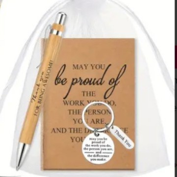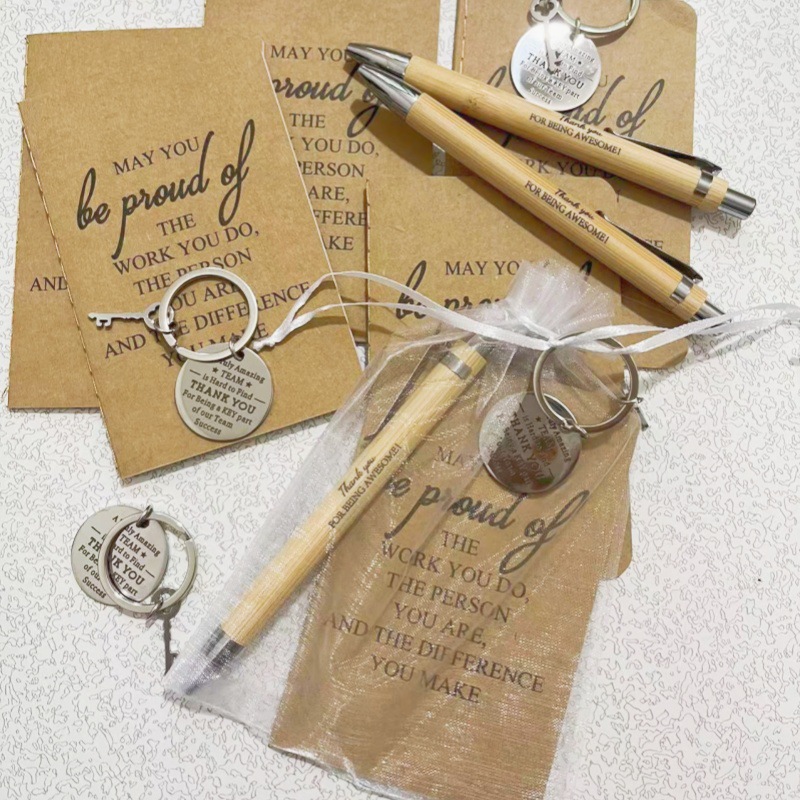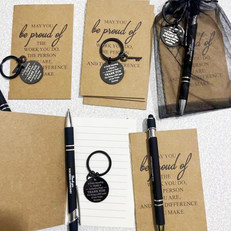 Sets: 1 notebook + 1 pen + 1 key ring (round) + 1 bag set, 1 notebook + 1 pen + 1 key ring (key) + 1 bag set, 1 notebook + 1 pen + 1 key ring (black keychain) + 1 bag set