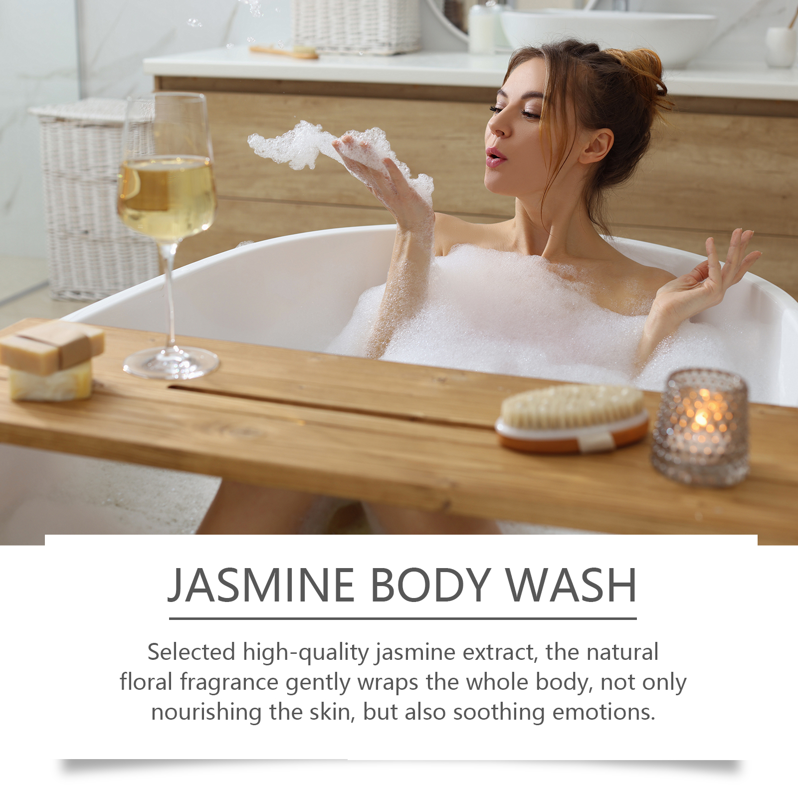 Our Jasmine Moisturizing Body wash contains cocoyl betaine and propylene glycol. It nourishes the skin and soothes the mood. Its use method is very simple: clean and dry skin, take an appropriate amount of body wash, knead into a foam, evenly apply on the body, gently massage until thoroughly clean, and finally rinse off with water. And it can easily wash away dirt and keep your skin clean.
