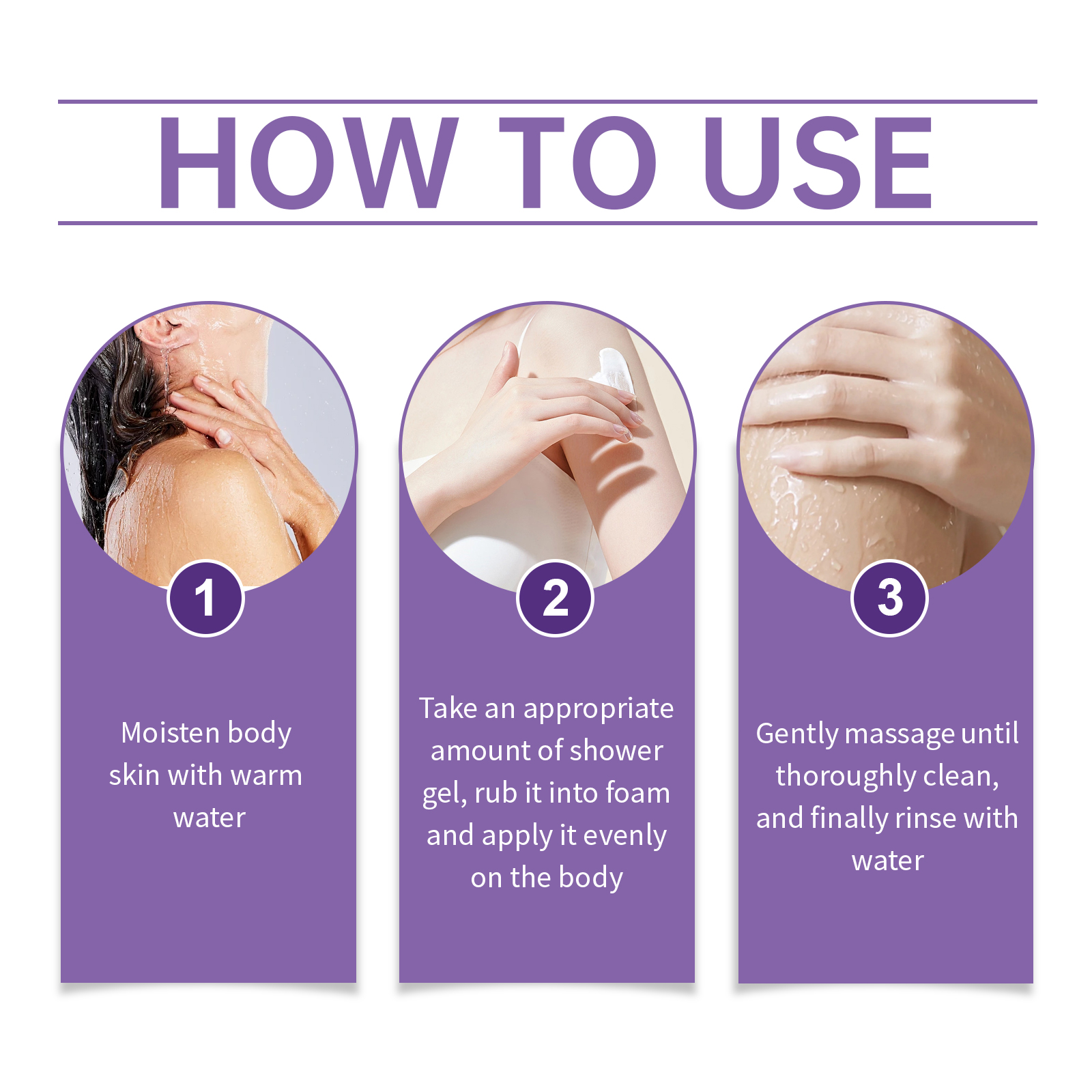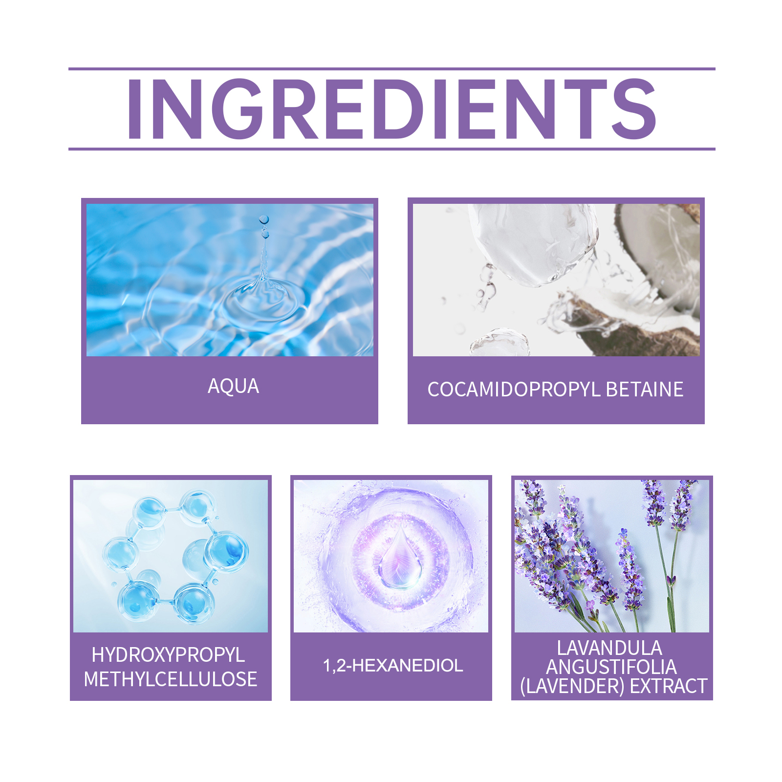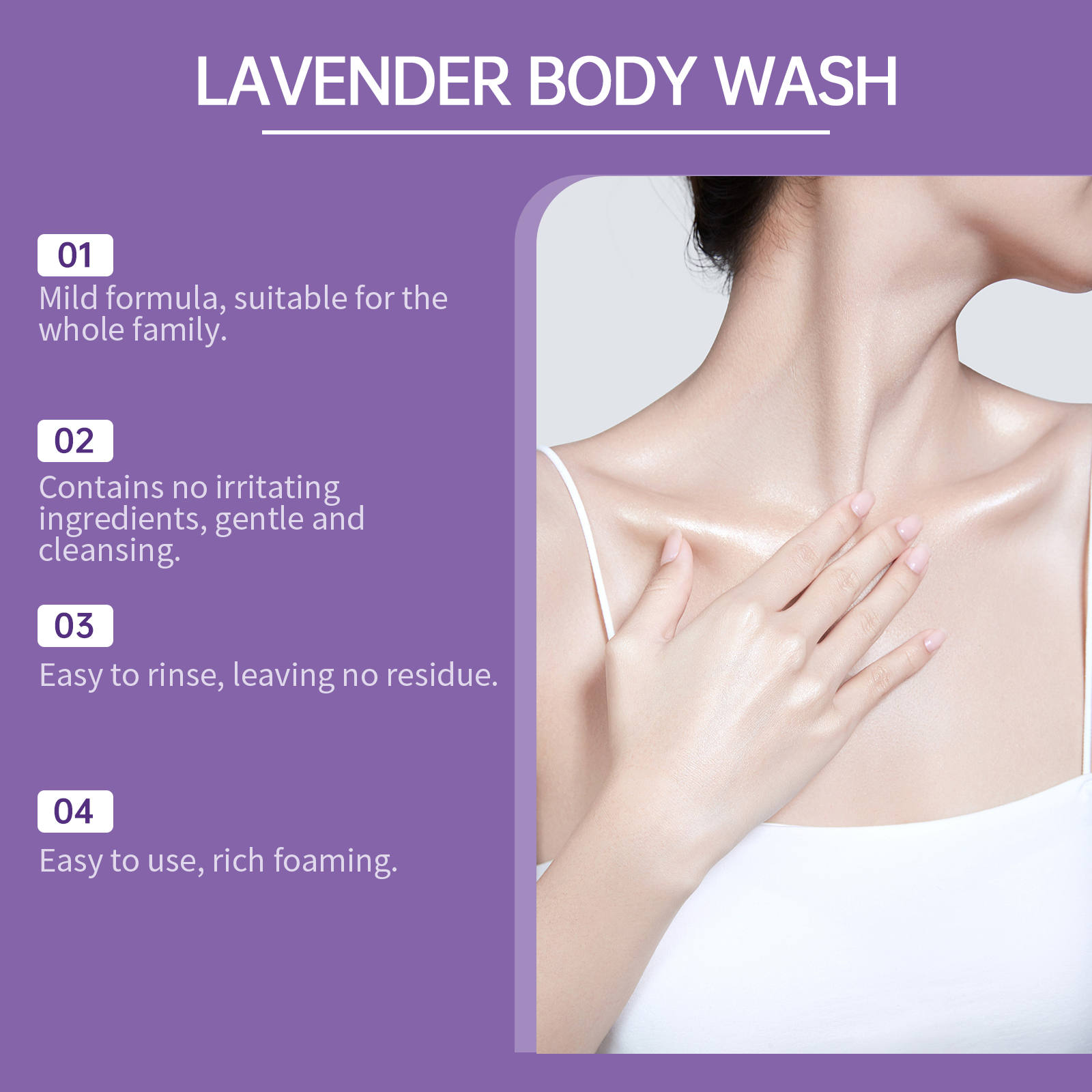 Our lavender moisturizing body wash contains cocamidopropyl betaine and hydroxypropyl methylcellulose. It can help relieve tension and soothe sensitive skin. Its usage is very simple: moisten your skin with warm water, take an appropriate amount of body wash, knead it into foam, apply it evenly on your body, gently massage until it is completely clean, and finally rinse it off with clean water. And it can deeply nourish, lock in moisture and prevent dryness.