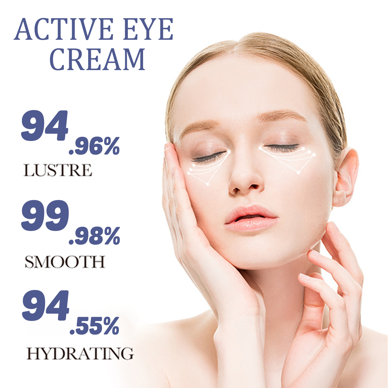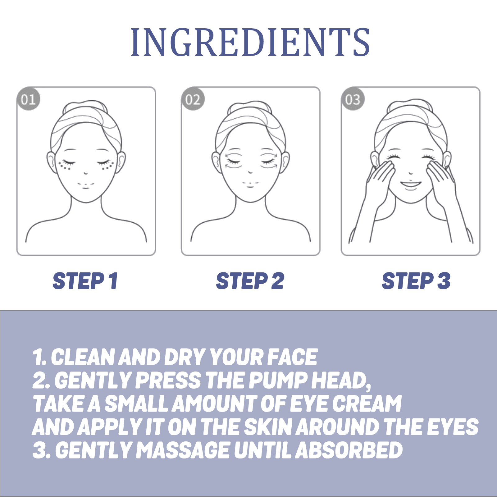 Our Active Eye Cream contains Hyaluronic Acid, Squalane, Ascorbic Acid. It can effectively lighten dark circles, reduce the appearance of bags under the eyes, make the eye skin brighter, reduce wrinkles and fine lines, reduce eye puffiness, and make the skin firmer and smoother. The method of application is simple: dry your face, gently press the pump head, take a small amount of eye cream, apply it to the skin around the eyes, and gently massage until absorbed. It can deeply moisturize the skin, enhance the elasticity of the skin around the eyes, and keep your skin hydrated and soft.