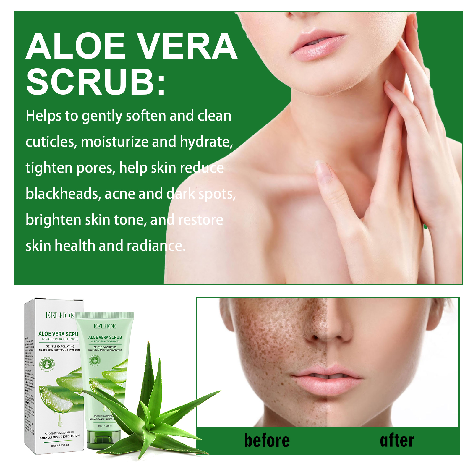 Our aloe scrub contains aloe extract, avocado oil, and sodium hyaluronate. It gently softens and cleanses cuticles, moisturizes and hydrates pores, helps skin reduce blackheads, acne and dark spots, brightens complexion and restores skin health and shine. The method of use is very simple: apply appropriate amount of this product directly on the face or body skin, gently massage with your hand in a circular motion for 30-60 seconds, and rinse off with clean water. Quickly clean dirt and excess oil in pores, remove dead skin, impurities and oil, adjust water and oil balance, and make skin softer and brighter.