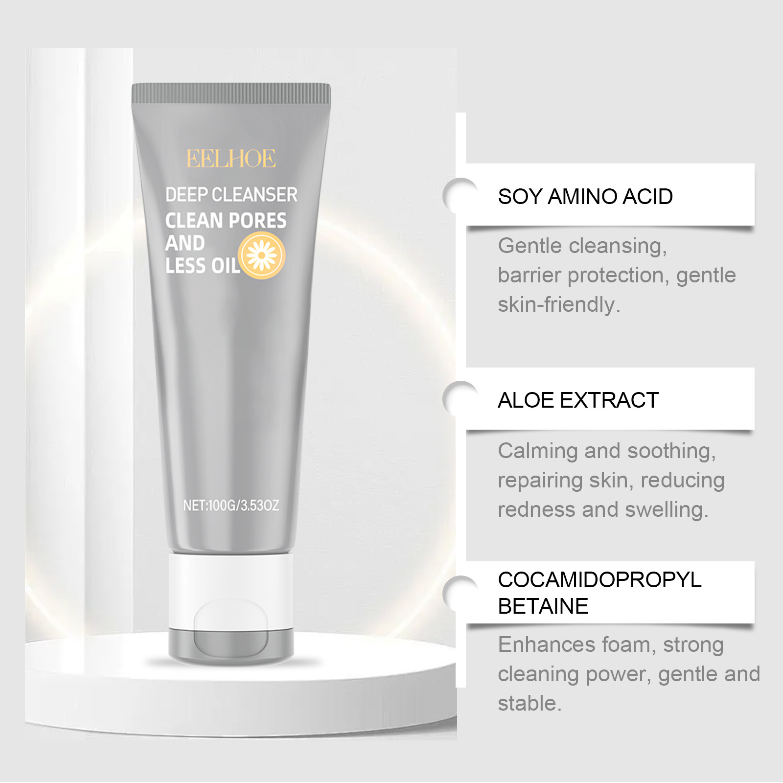 Our amino acid cleanser contains chamomile extract, cocamidopropyl betaine. It can provide a soothing effect and make cleansing more enjoyable. The way to use it is simple: cleanse and moisturize the facial skin. Squeeze out an appropriate amount of cleanser and gently massage your face. Wash your face with water until it is clean. It can deeply moisturize, relieve dryness and make skin soft.