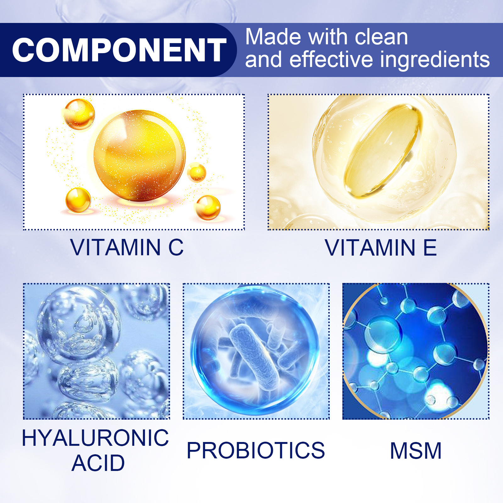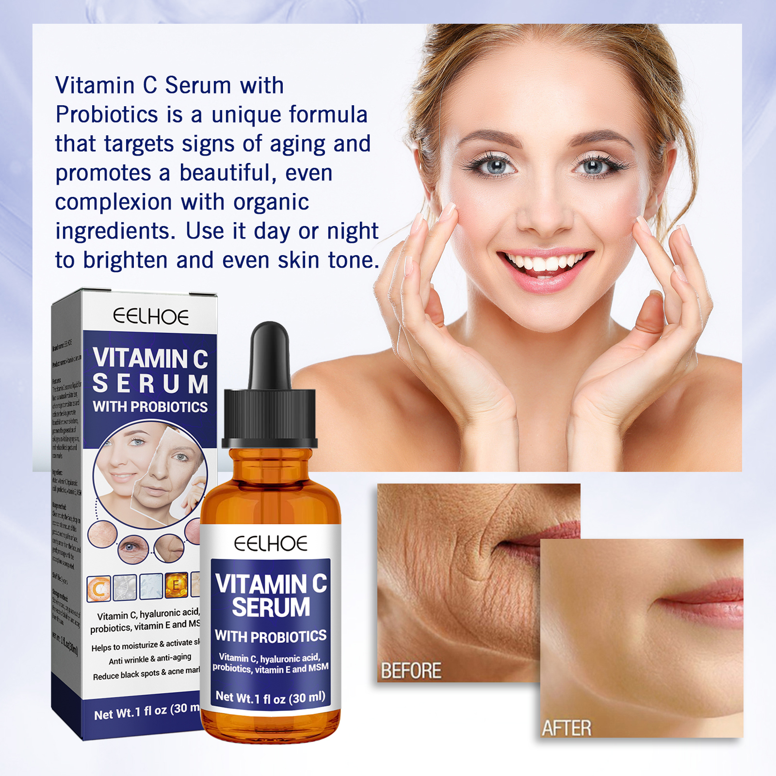 Our anti-aging vitamin C facial essence contains vitamin C, hyaluronic acid, probiotics. It can target signs of aging and promote beautiful and even skin color through organic ingredients, brighten and even the skin tone. Its application method is very simple: Take 3-5 drops of essence liquid, evenly smear it on the face, and massage until it is absorbed. For areas with severe skin problems, one drop can be dropped and continuously massaged to help absorb. Follow up skin care to promote the absorption of essence. Protect sensitive skin and strengthen skin protection barriers, restore even and bright skin, moisturize, quickly absorb, and bid farewell to wrinkles.