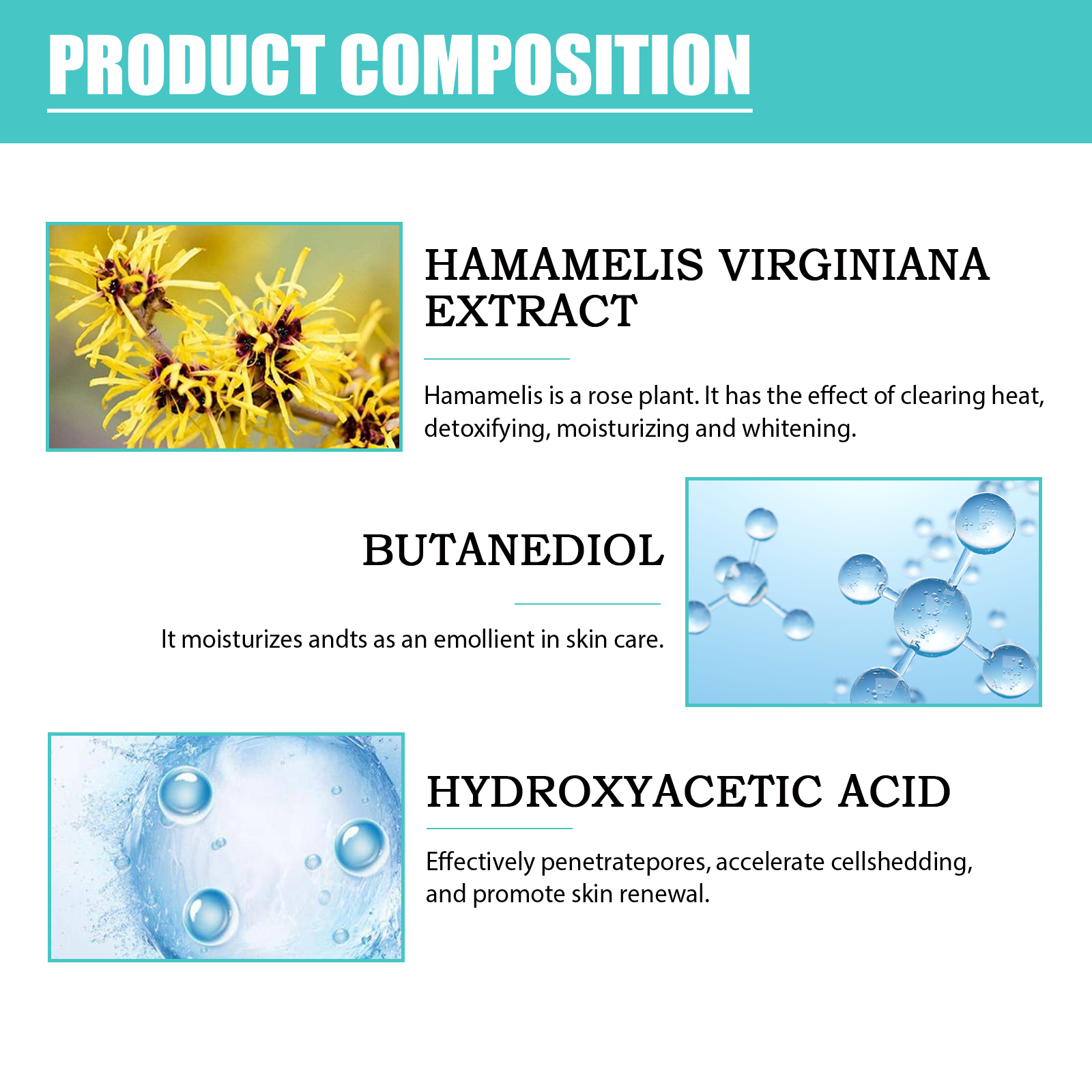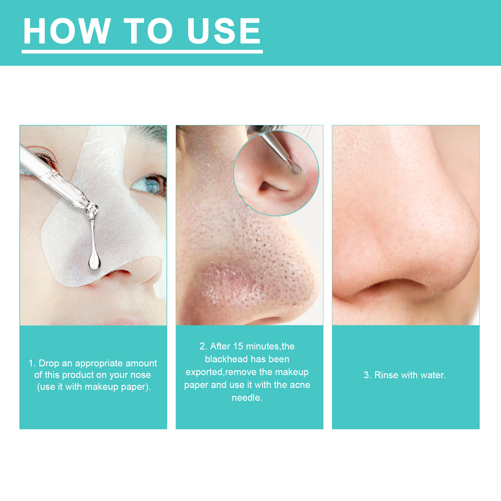 Our blackhead nasal mask liquid contains witch hazel extract, butanediol, and glycolic acid. It can effectively purify and smooth the skin, effectively remove blackheads, remove dirt and excess oil. Its application method is very simple: 1. Take an appropriate amount of this product and drop it on the nose (use with makeup paper). 2. After 15 minutes, the blackhead is exported, take off the makeup paper, and use with the acne needle. 3. Rinse with water. It acts as a moisturizer and emollient in skin care. Effectively permeate pores, accelerate cell shedding and promote skin renewal.