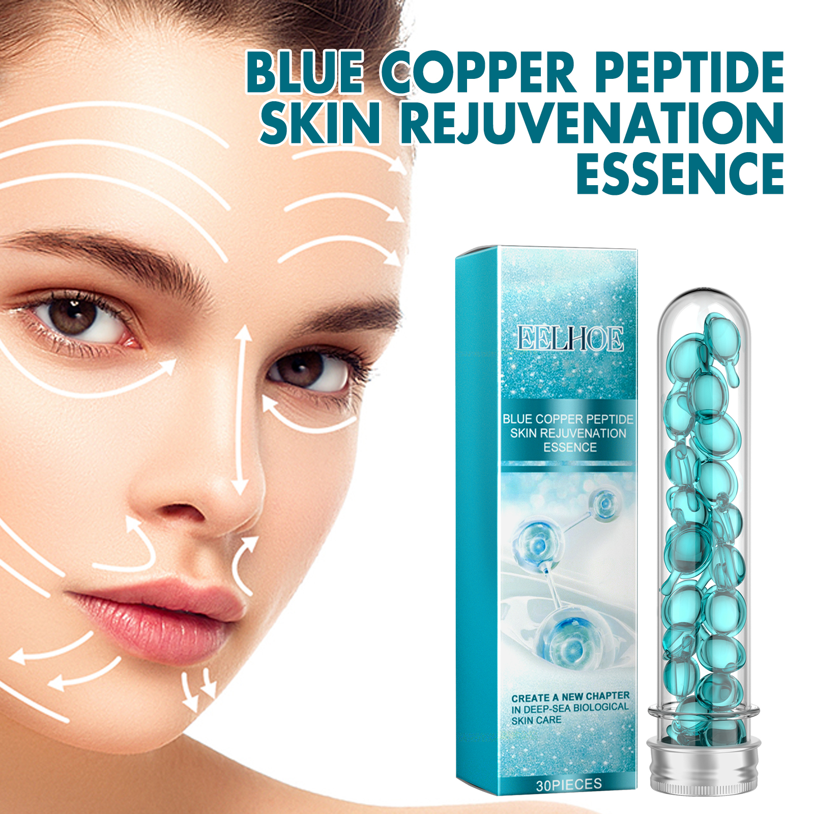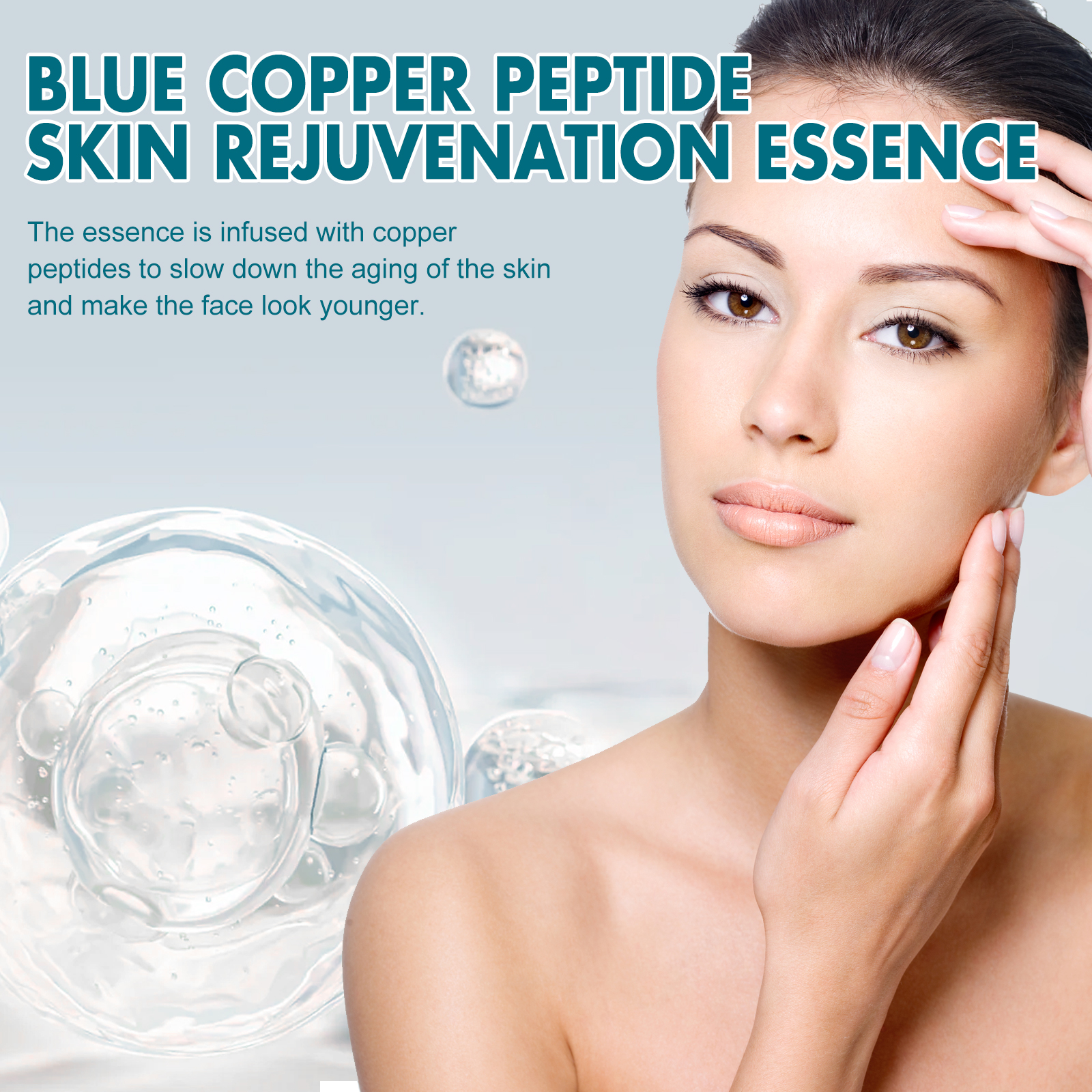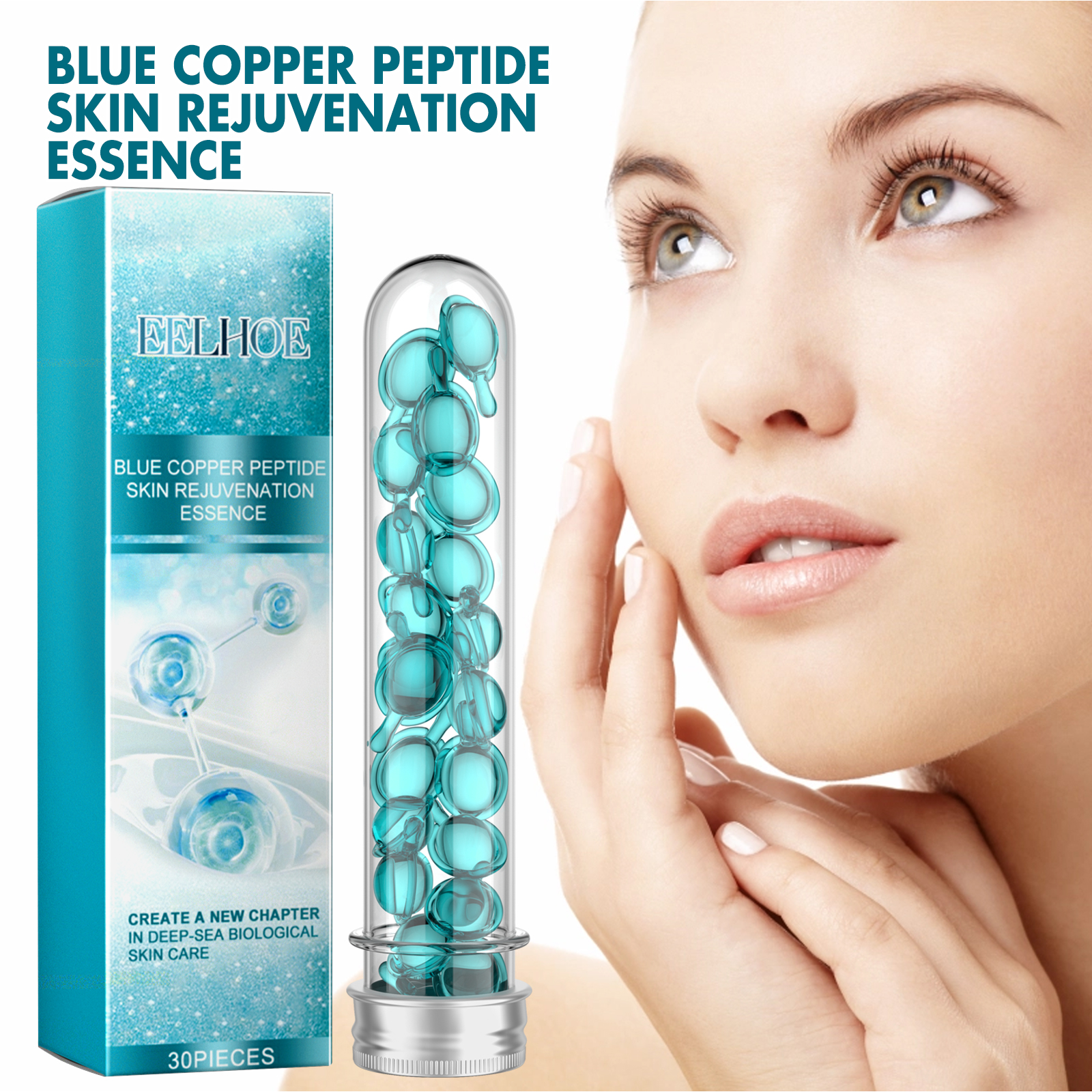 Our Blue Copper Peptide Skin Rejuvenation Essence contains Glycerin, Copper Tripeptide, Sodium Hyaluronate. It slows skin aging, makes the face look younger, helps restore skin elasticity, makes your skin look firmer and younger, locks in moisture, reduces dryness and keeps skin hydrated throughout the day. Its application is simple: clean and dry your face and hands, take out a capsule, squeeze it open, apply the serum evenly to your face, and gently massage with your hands in circular motions until absorbed. It can deeply moisturize the skin, reduce dryness and roughness, and keep the skin hydrated. The ingredients are mild and suitable for all skin types, including sensitive skin.