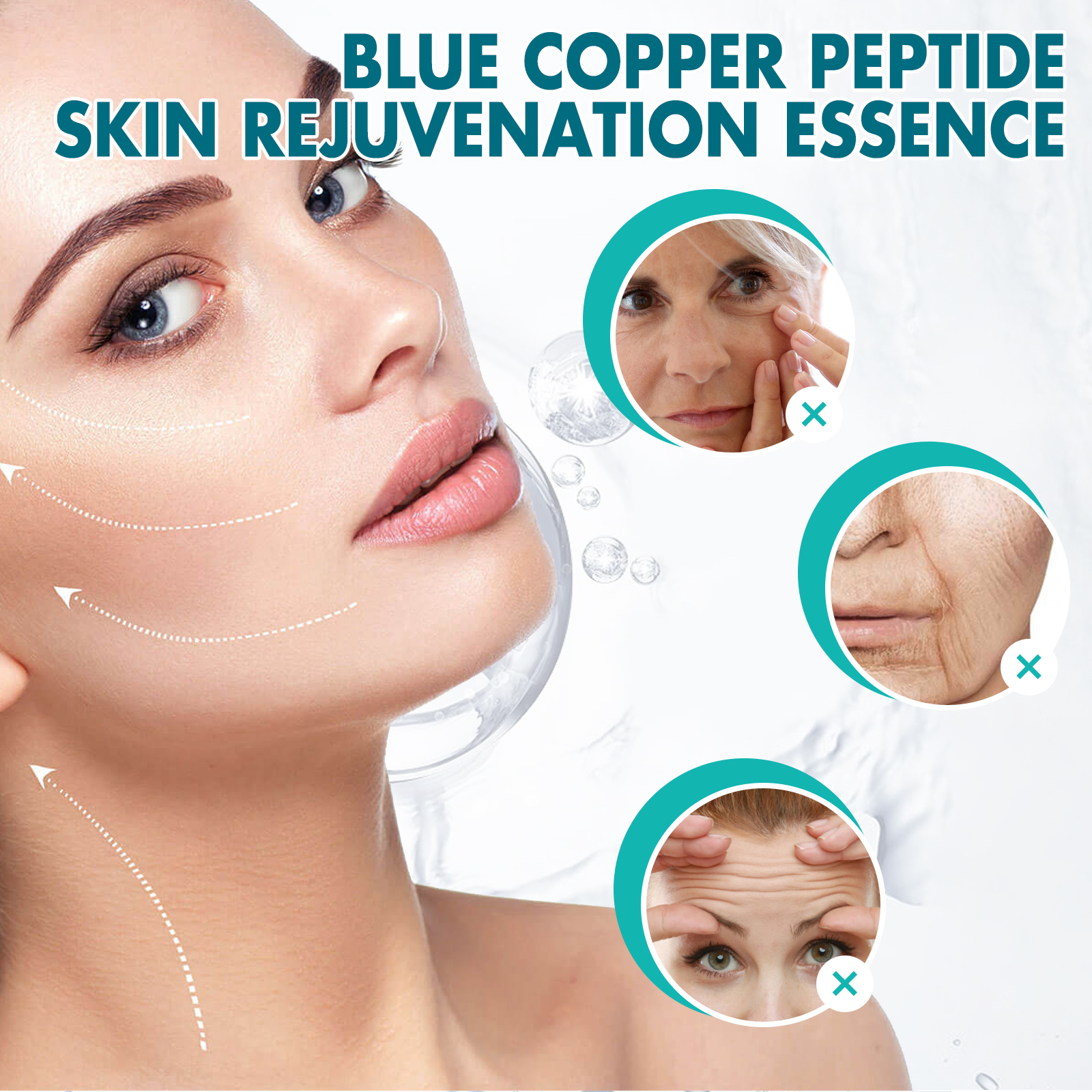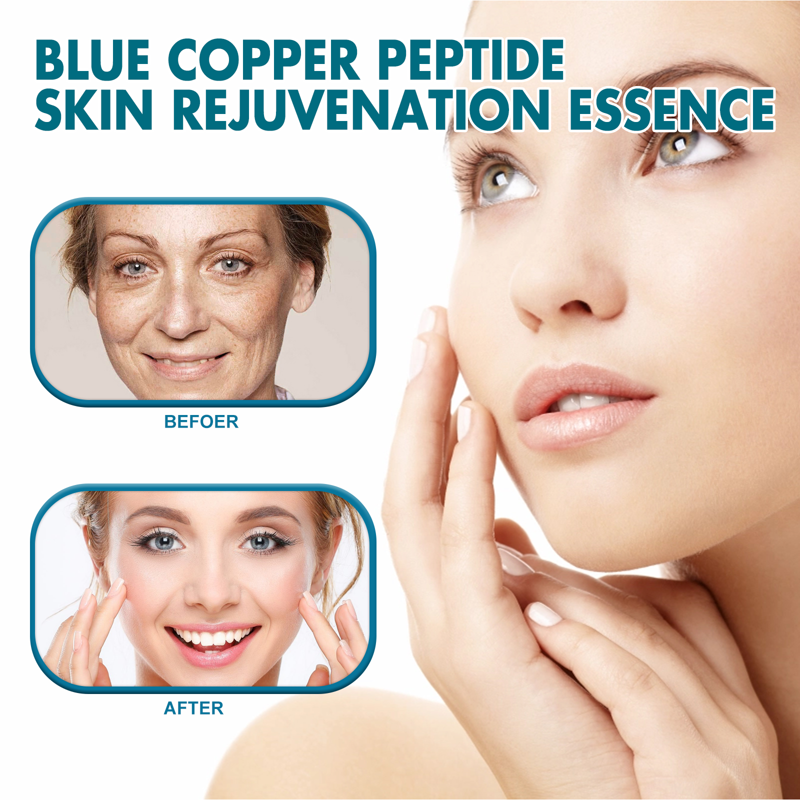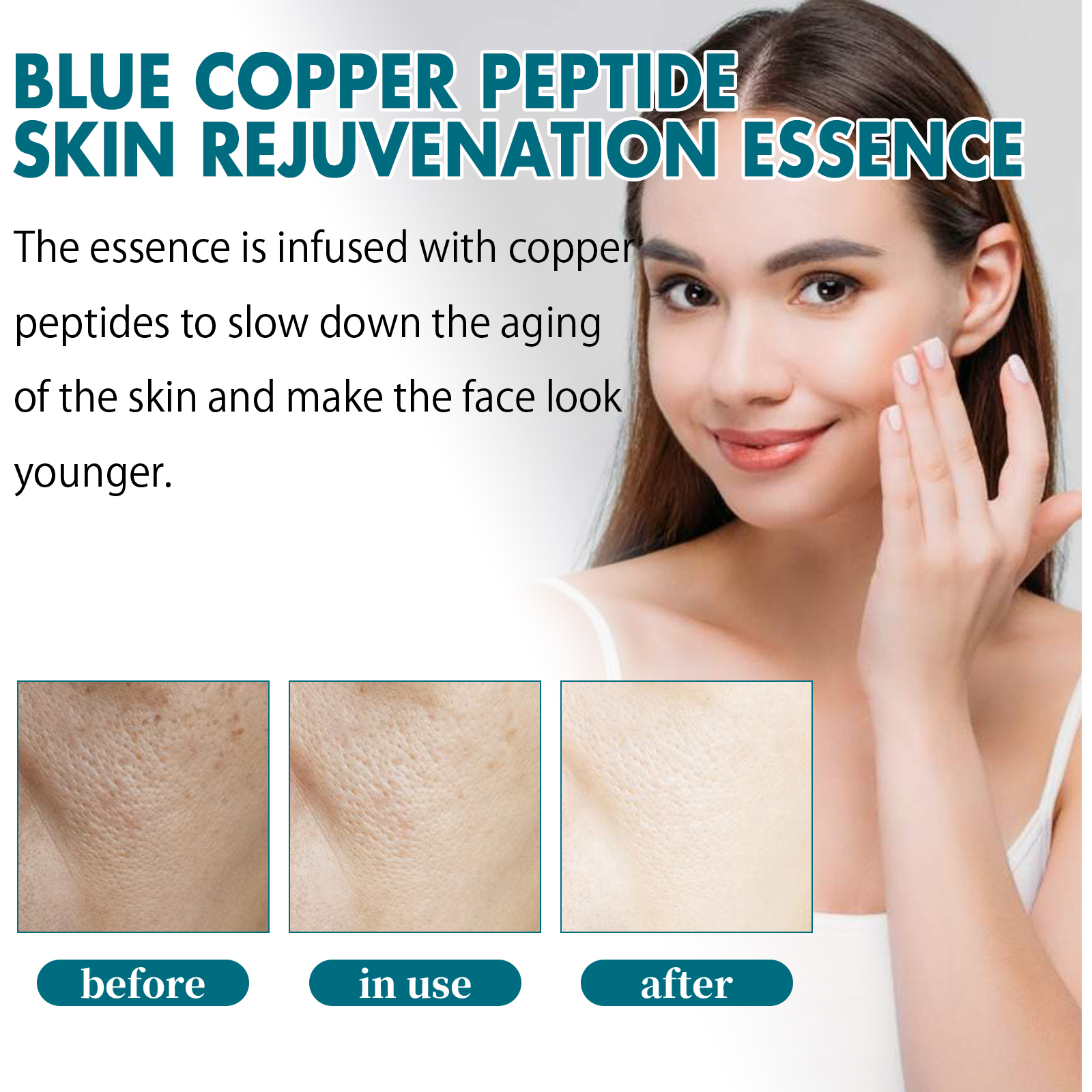Our Blue Copper Peptide Skin Rejuvenation Essence contains Glycerin, Copper Tripeptide, Sodium Hyaluronate. It slows skin aging, makes the face look younger, helps restore skin elasticity, makes your skin look firmer and younger, locks in moisture, reduces dryness and keeps skin hydrated throughout the day. Its application is simple: clean and dry your face and hands, take out a capsule, squeeze it open, apply the serum evenly to your face, and gently massage with your hands in circular motions until absorbed. It can deeply moisturize the skin, reduce dryness and roughness, and keep the skin hydrated. The ingredients are mild and suitable for all skin types, including sensitive skin.