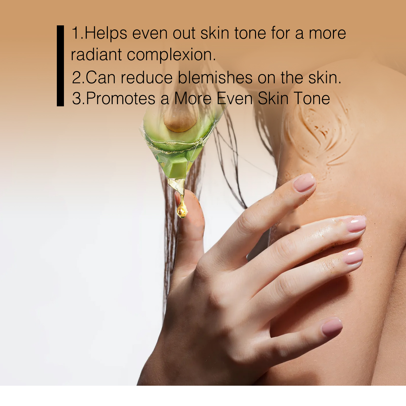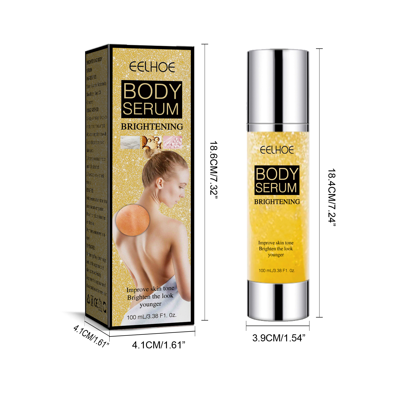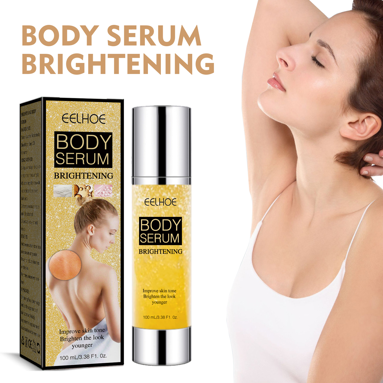 Our brightening body serum contains glycerin, nicotinamide and shea butter. It can help balance skin tone for a more radiant complexion, while reducing blemishes on the skin and promoting a more even complexion. Its application is simple: First apply a thin layer of body cream directly to the chest, knees, hands, armpits, elbows or any other area with significant discoloration and/or dark spots, massage in circular motions until fully absorbed, and for best results, apply twice a day. After use, it can make the skin more hydrated and full, penetrate deeply into the skin, reduce skin wrinkles and wrinkles, and make the skin tone more even.