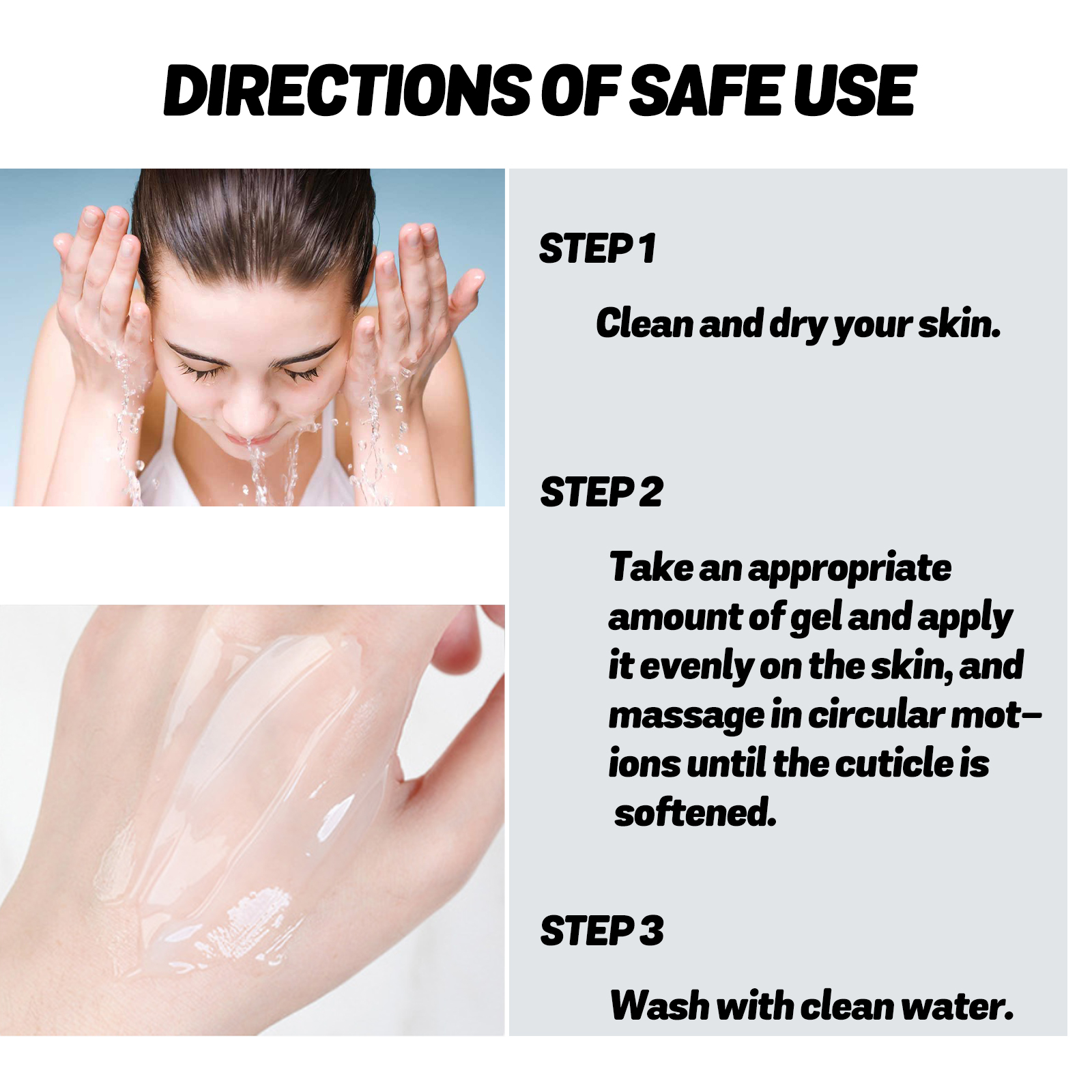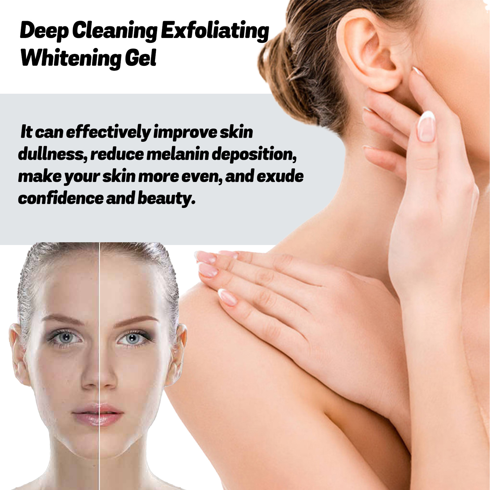 Our Deep Cleaning Exfoliating Whitening Gel contains Citrus Reticulata(Tangerine)Fruit Extract, Niacinamide, Ascorbic Acid. It gently and thoroughly removes dirt and dead skin cells, leaving your skin refreshed, effectively improving skin dullness, reducing melanin deposits, and leaving your skin more even, confident and beautiful. Its use method is very simple: clean and dry the skin, apply an appropriate amount of gel evenly on the skin, massage in circles until the cuticle softens, and finally rinse with clean water. It can deeply moisturize the skin, help repair damaged skin, and leave your skin supple and smooth.