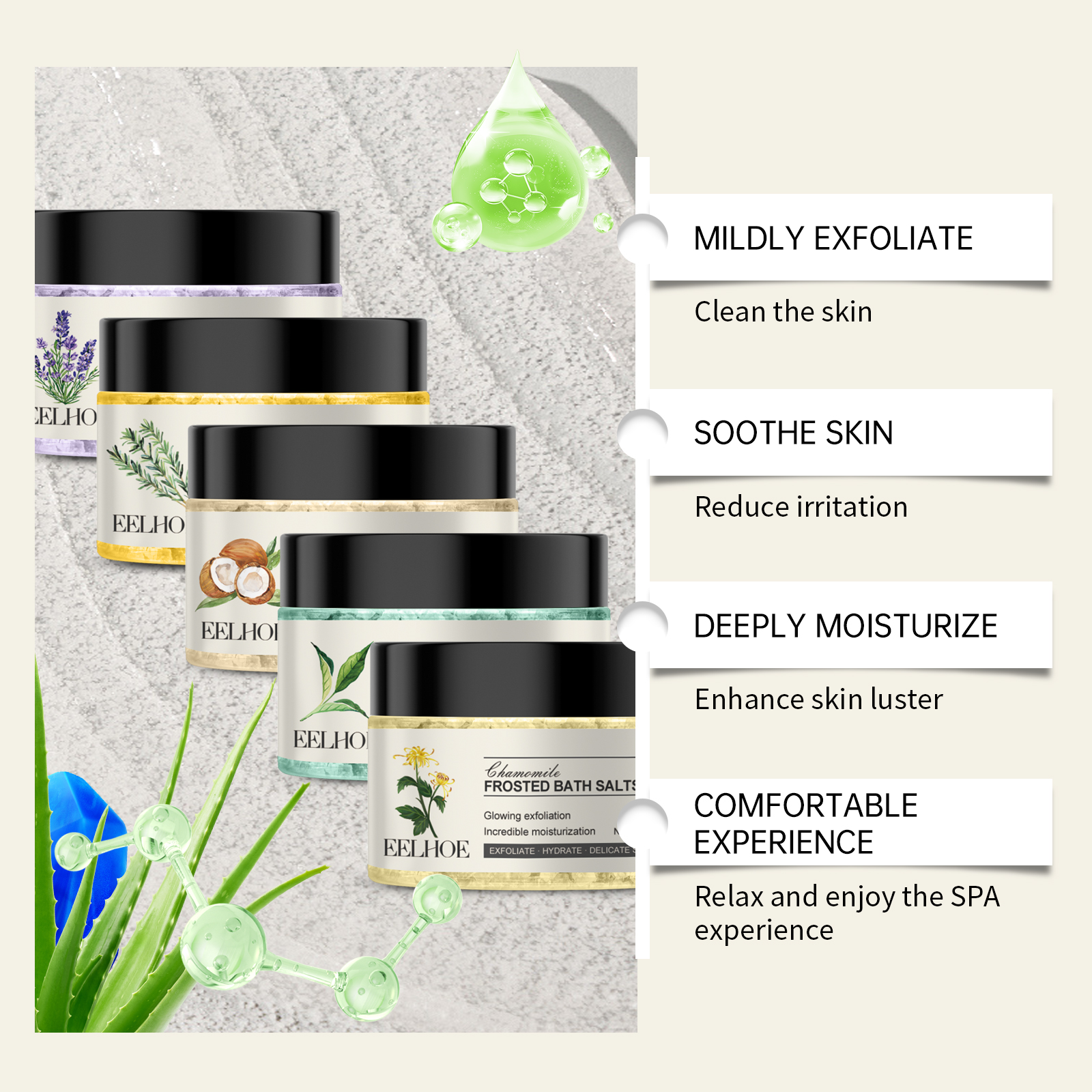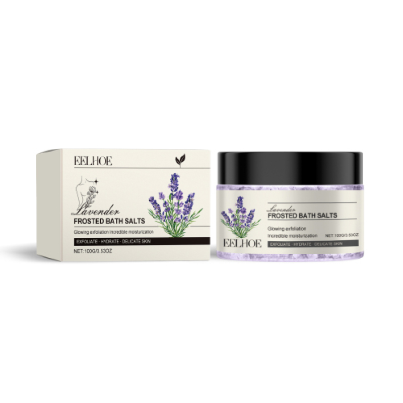 Our scrub bath salts contain glycerin, sea salt, lavender extract. It traps moisture and keeps skin soft and moist. Aloe vera leaf extract soothes the skin and reduces irritation. Its application method is very simple: 1. Moisturize the skin with warm water. 2. Apply appropriate amount of bath salts to the wet skin and gently massage in circular motions; 3. Rinse your body with warm water. Fine sea salt particles gently remove dead skin, revealing smooth skin. Sea salt particles can effectively remove dead skin on the surface of the skin and make the skin smooth.