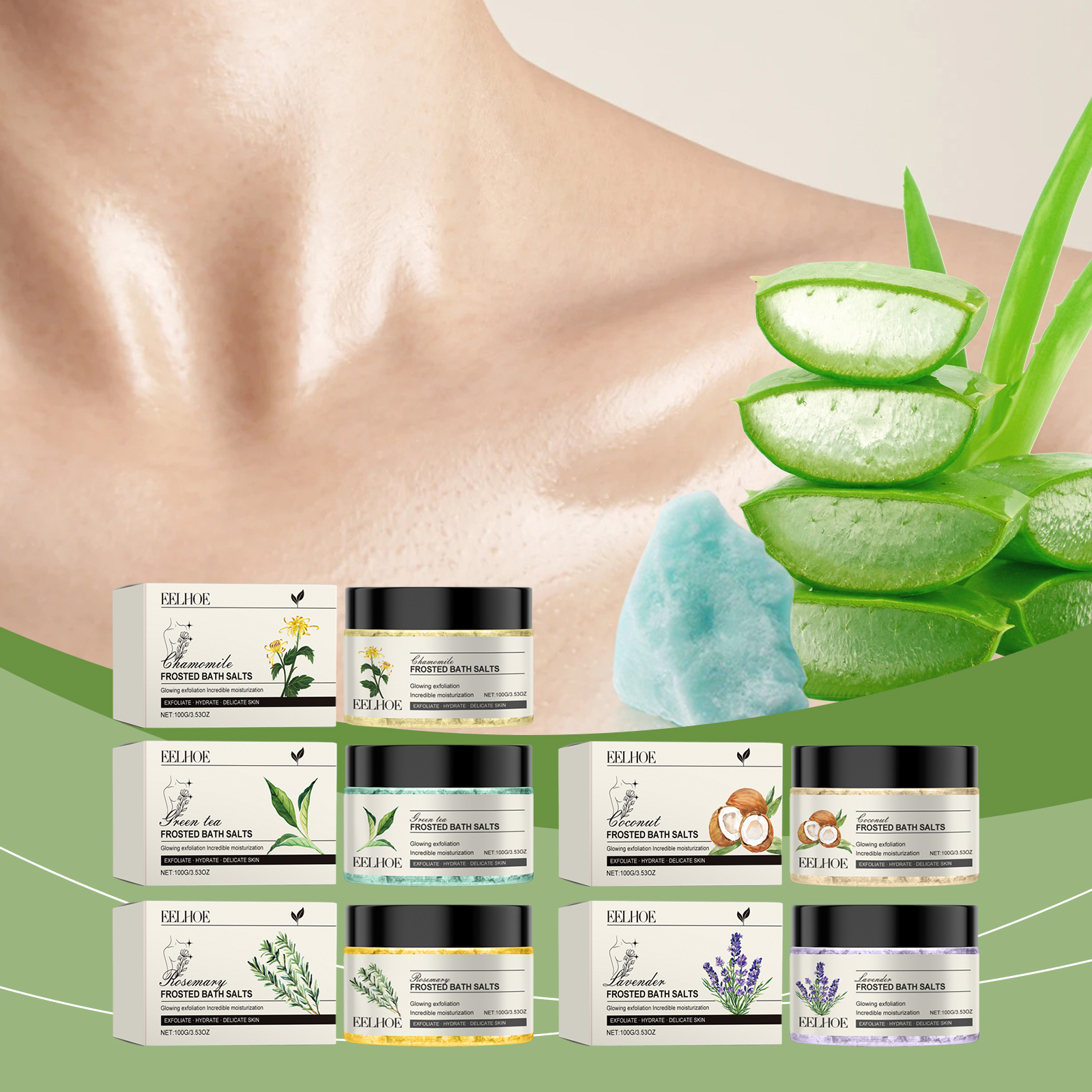 Our scrub bath salts contain glycerin, sea salt, rosemary extract. It traps moisture and keeps skin soft and moist. Aloe vera leaf extract soothes the skin and reduces irritation. Its application method is very simple: 1. Moisturize the skin with warm water. 2. Apply appropriate amount of bath salts to the wet skin and gently massage in circular motions; 3. Rinse your body with warm water. Fine sea salt particles gently remove dead skin, revealing smooth skin. Sea salt particles can effectively remove dead skin on the surface of the skin and make the skin smooth.