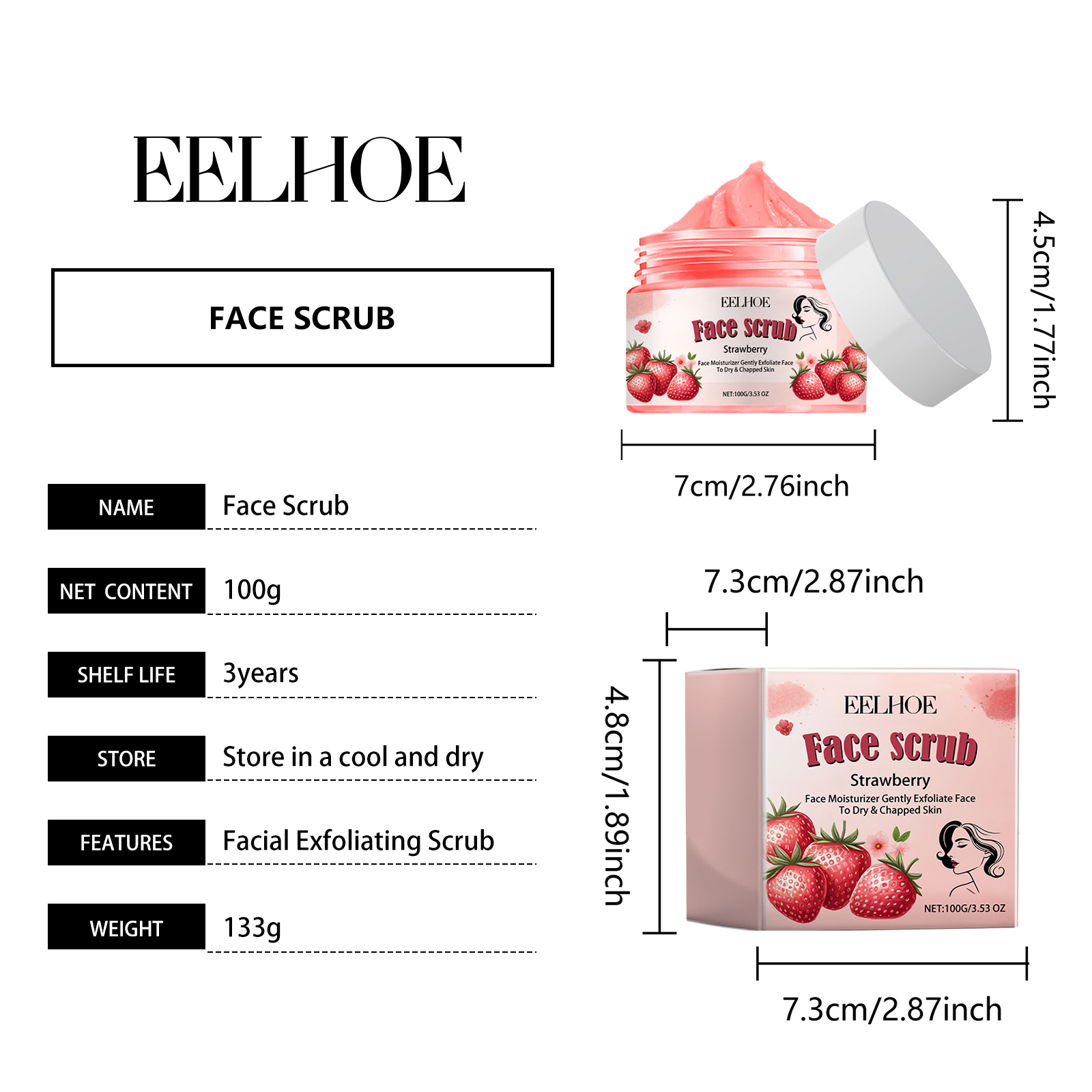 Our Face Scrub contains Simmondsia Chinensis (Jojoba) Seed Oil, Cocos Nucifera(Coconut)Oil, Persea Gratissima(Avocado)Oil. It can exfoliate the face and remove dead tissue caused by dryness and dehydration, leaving your skin smoother and more delicate. Its use method is very simple: wet the face with warm water, apply a layer of scrub, and massage in a circular way, rinse with water, use 1-2 times a week, preferably in the morning or evening. The use of plant extract can effectively reduce water loss, lock in water, and keep your skin hydrated and shiny for a long time. The product has a strawberry fragrance, so that you have a fresh and comfortable experience.