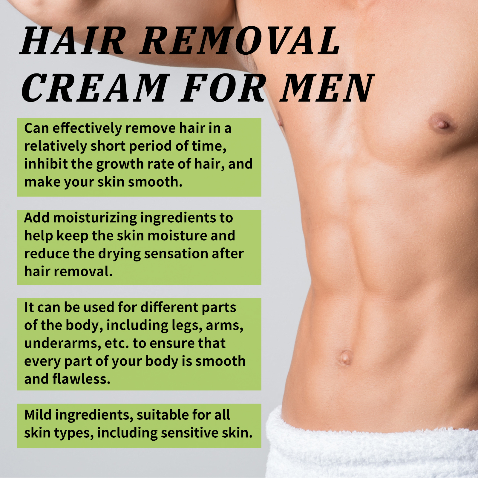 Our Hair Removal Cream For Men contains Glycerin, Glycyrrhiza Uralensis (Licorice) Root Extract, Camellia Sinensis Leaf Extract. It can effectively remove hair in a shorter period of time, inhibit the growth rate of hair, and make your skin smooth, help retain skin moisture, and reduce the dry feeling after hair removal. The way to use it is very simple: cover the part that needs to be removed with a hot wet towel, take an appropriate amount of hair removal cream, evenly apply it along the hair of the body, and wipe it off with a towel after five minutes. It can be used on different parts of the body, including legs, arms, underarms, etc. To ensure that every part of your body is smooth and flawless, the ingredients are gentle and suitable for all skin types, including sensitive skin. (When using for the first time, it is necessary to carry out a small area test, remove it thoroughly, wait 2 hours without any discomfort, and then use a large area; Do not use if there are pimples, red spots, incomplete heating, or depilatory areas on wounds.)