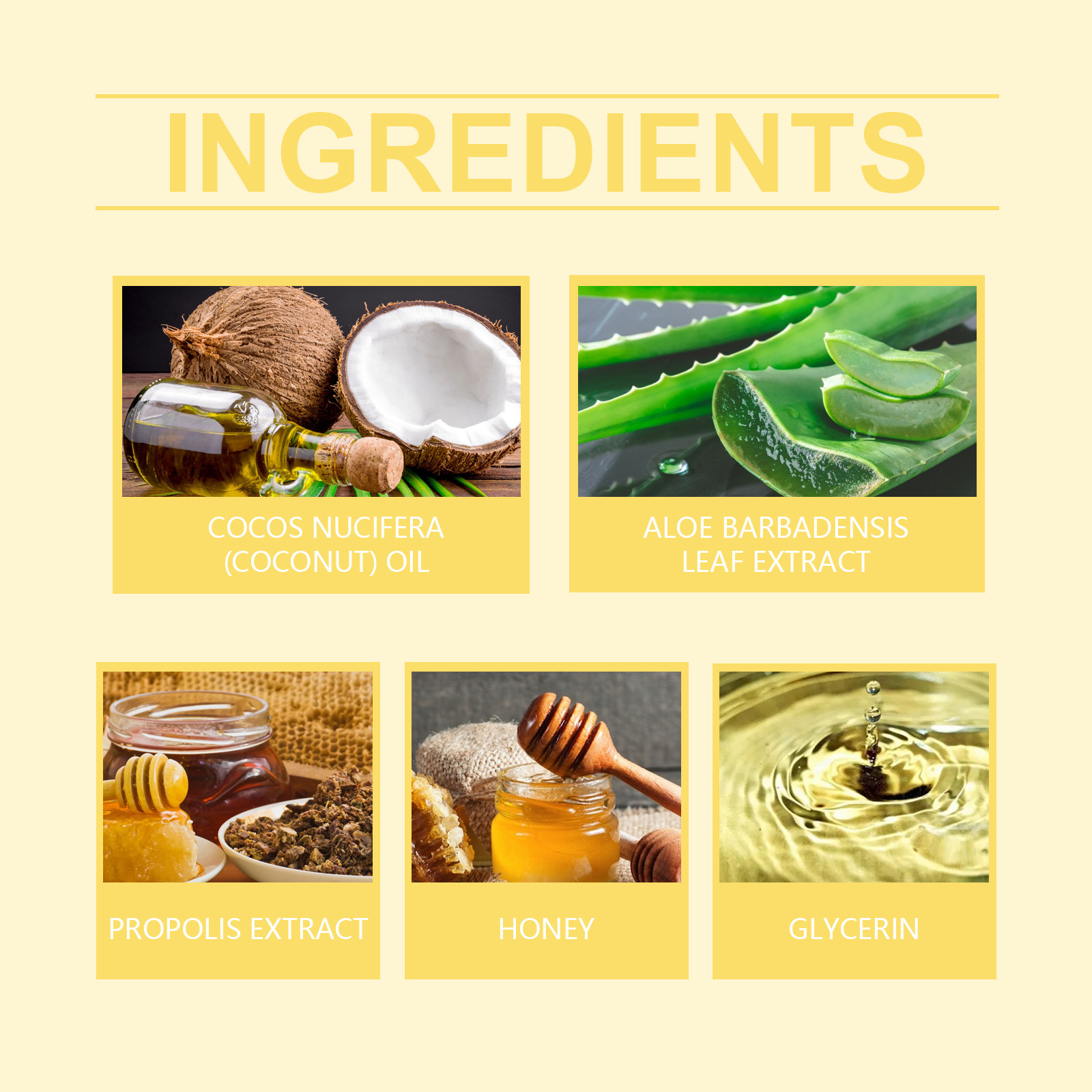 Product Ingredients: Propolis Extract, Honey, Aloe Vera Leaf Extract, Coconut Oil, Glycerol