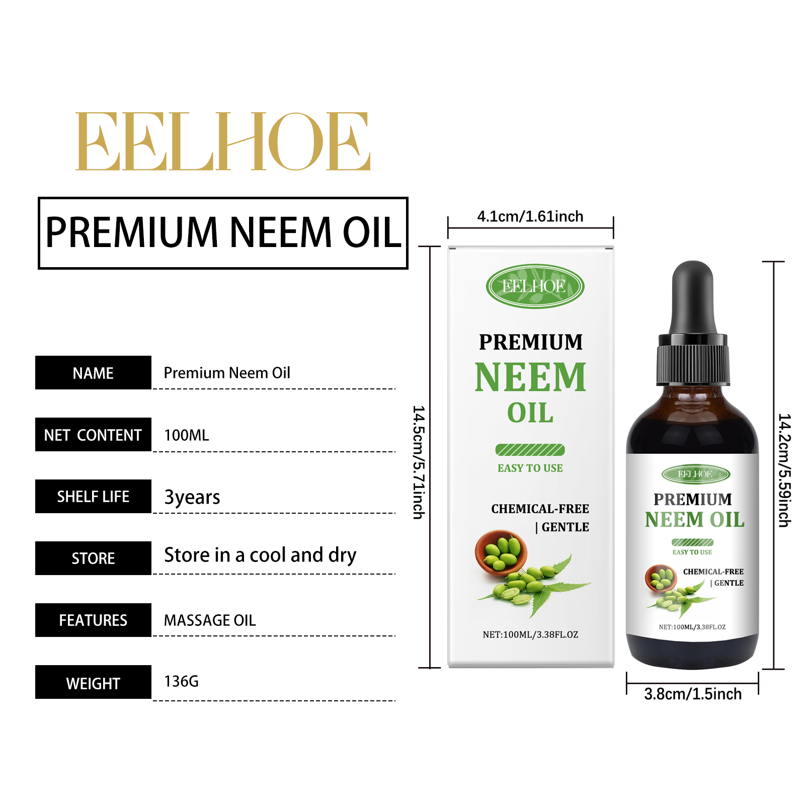 Our neem Oil treatment essential oil contains olive oil, sweet almond oil, tocopherol (vitamin E). It can be suitable for all skin types, long-lasting moisture without irritation. Its use is very simple: Use on hair: thoroughly clean dry scalp and hair, apply appropriate amount of this product evenly on scalp and hair, gently massage to promote complete absorption. Use on skin: completely clean dry skin, evenly apply appropriate amount of this product on hands, legs, neck and other skin, and gently massage to promote complete absorption. Use on nails: After cleaning the nail surface, apply appropriate amount of this product evenly on the nails and tongue skin until absorbed. And can effectively protect the nails, not easy to occur gray nails.