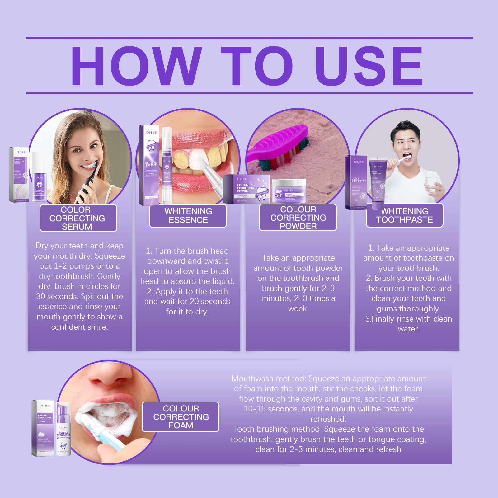 Our purple toned teeth set contains sodium bicarbonate, papain and silica hydrate. It can effectively remove stains and plaque and clean teeth. Long-term use to keep teeth whitening effect lasting. The way to use it is simple: Tooth care pen: dry your teeth and keep your mouth dry. Extrude 1-2 pumps onto a dry toothbrush. Brush gently in circular motion for 30 seconds. Spit out the essence, gargle gently, and smile confidently. 1. Turn the brush head down and twist it open so that the brush head absorbs the liquid. Apply it to your teeth and let it dry for 20 seconds. Mixing tooth powder: Take appropriate amount of tooth powder and gently brush on the toothbrush for 2-3 minutes, brush 2-3 times a week. Color toothpaste: 1. Apply an appropriate amount of toothpaste to your toothbrush. Brush your teeth properly and clean your teeth and gums thoroughly. Finally rinse with water. Toning mousse: Gargle: Squeeze the appropriate amount of foam out of the mouth, stir both cheeks, let the foam flow through the mouth and gums, 10-15 seconds later spit out, mouth is instantly clean; Refreshing brushing method: Squeeze the foam on the toothbrush, gently brush on the teeth or tongue coating, clean for 2-3 minutes, clean and refreshing. Mild ingredients, does not irritate teeth and mouth. Professional development, designed for whitening teeth.