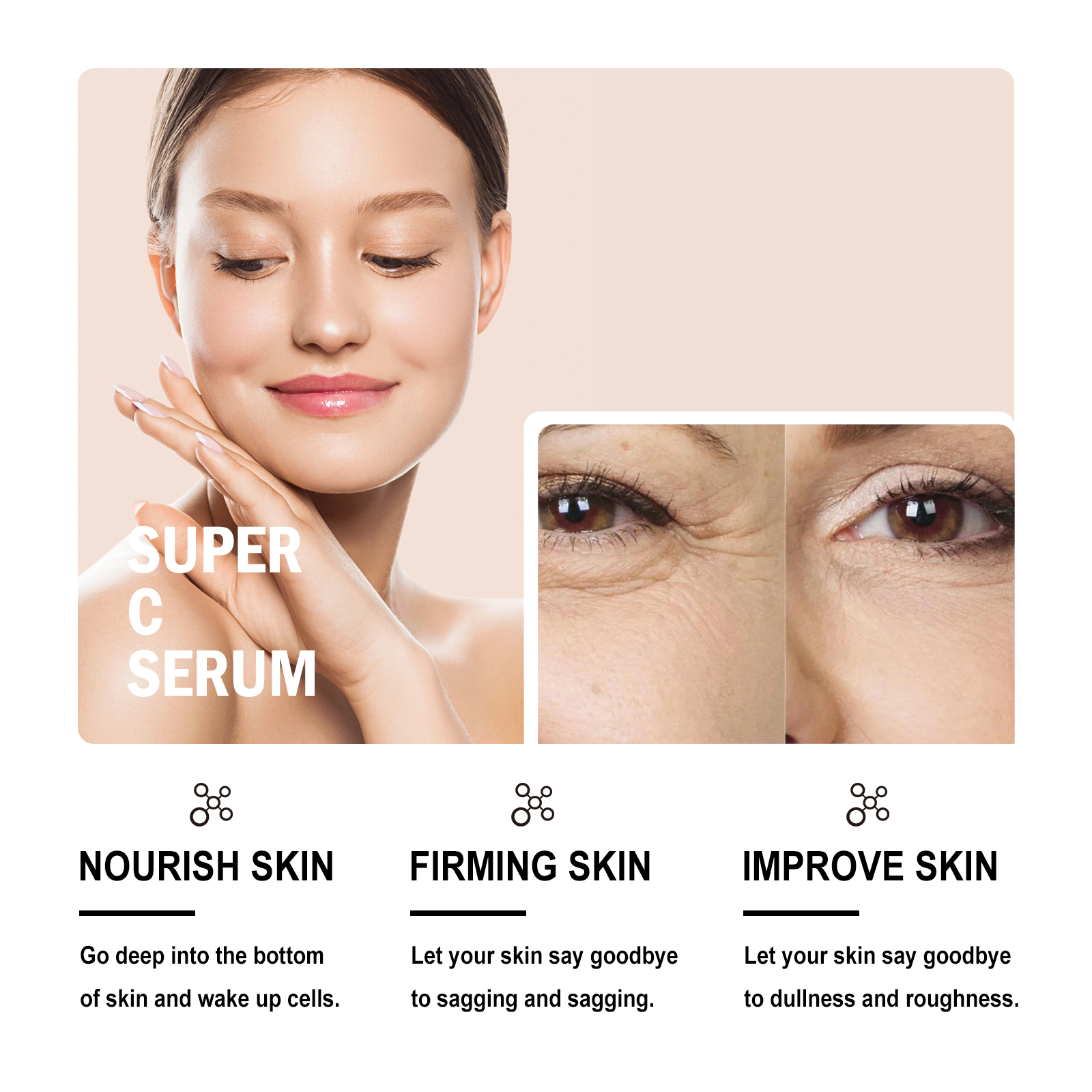 Our Super C Serum contains Ascorbic Acid, Niacinamide, Hyaluronic Acid. It nourishes and hydrates the skin, making your skin softer and more hydrated, reducing the appearance of wrinkles and fine lines, firming the skin and making you look younger. Its use method is very simple: clean facial skin and keep dry, apply appropriate amount of this product evenly on facial skin, gently massage until it is completely absorbed. Can lighten the skin tone, improve the skin texture, make your skin more bright and shiny, mild ingredients, skin irritation, suitable for all types of skin.