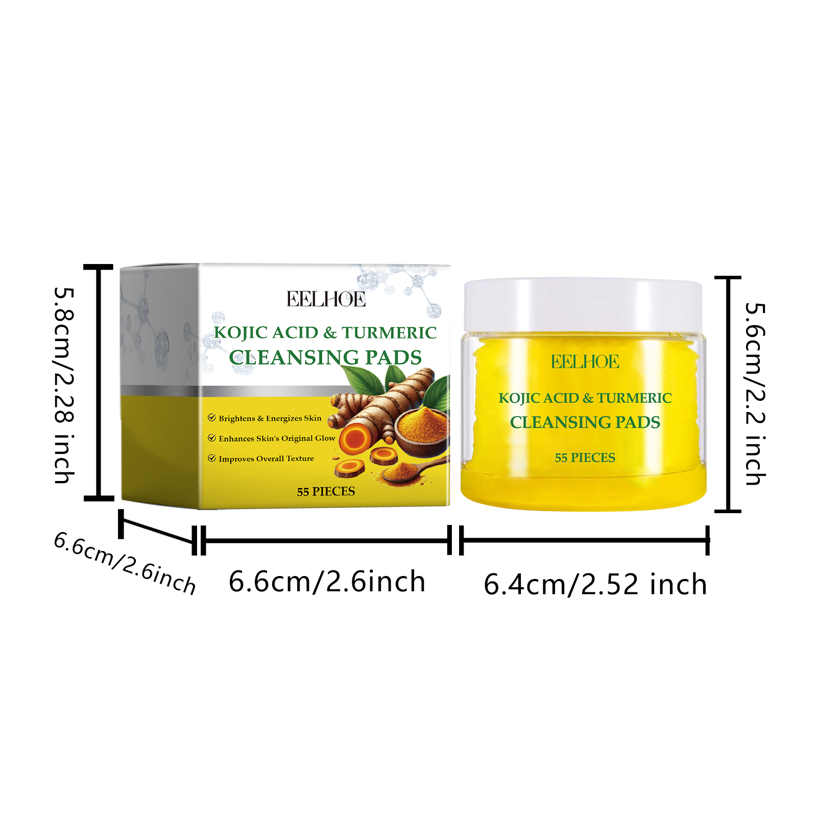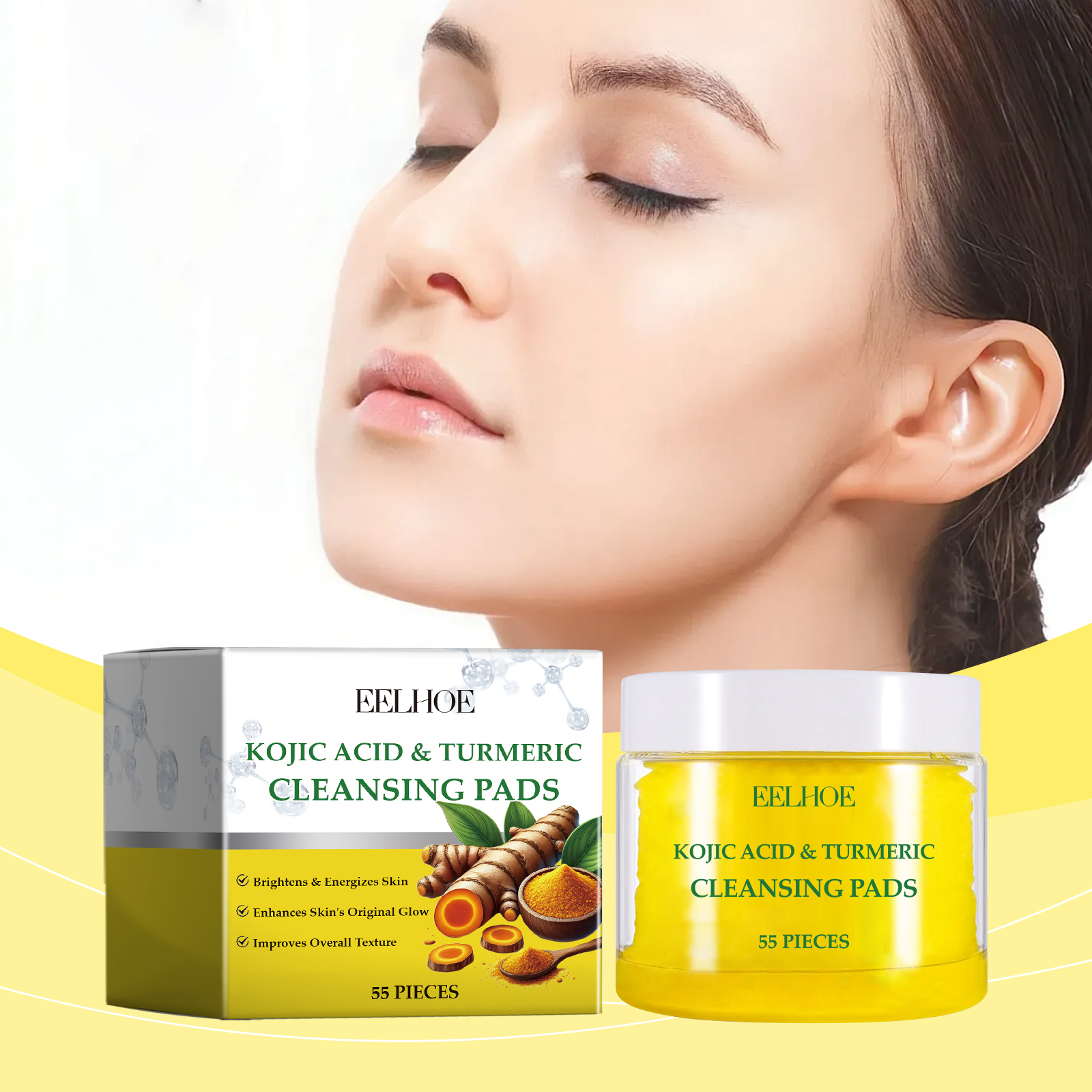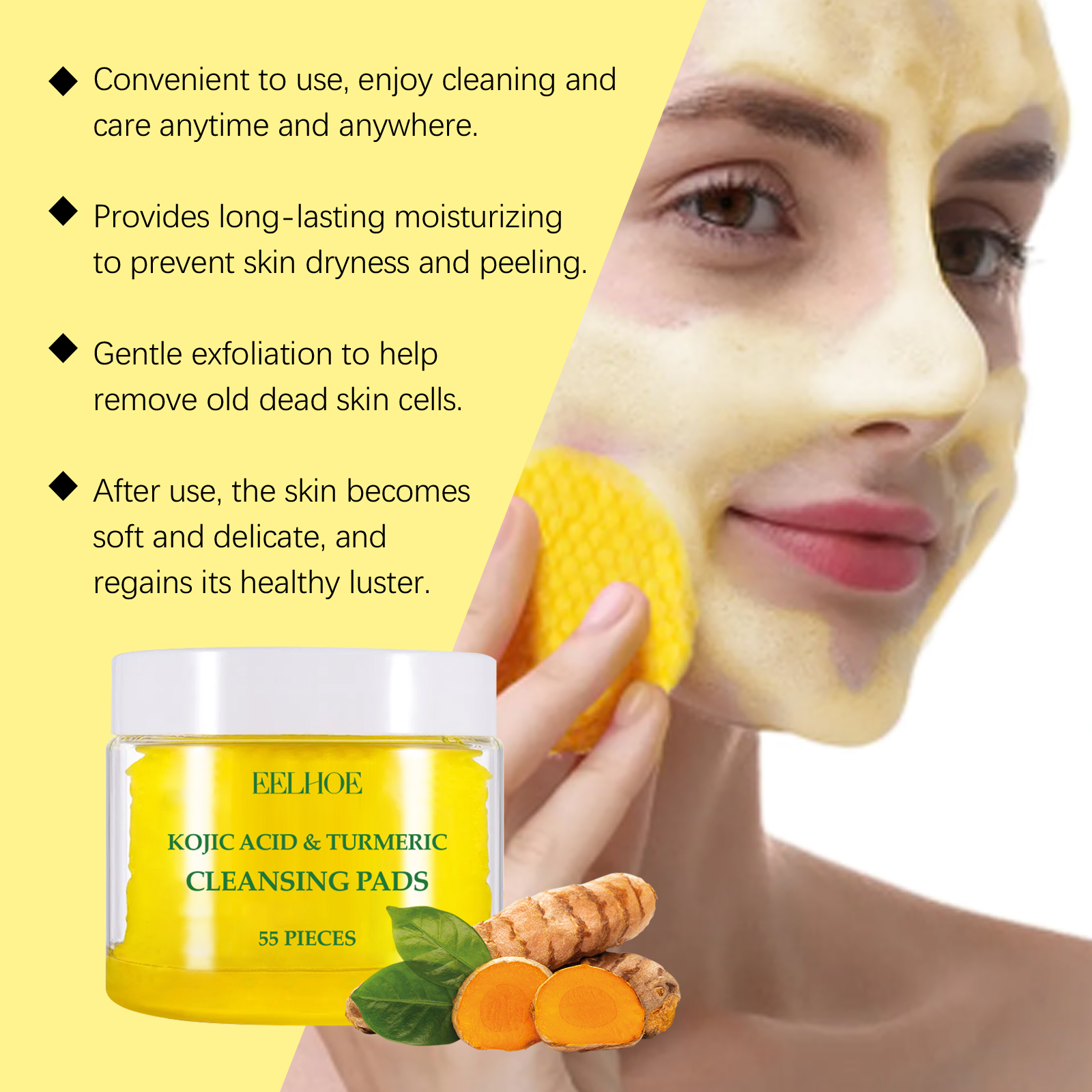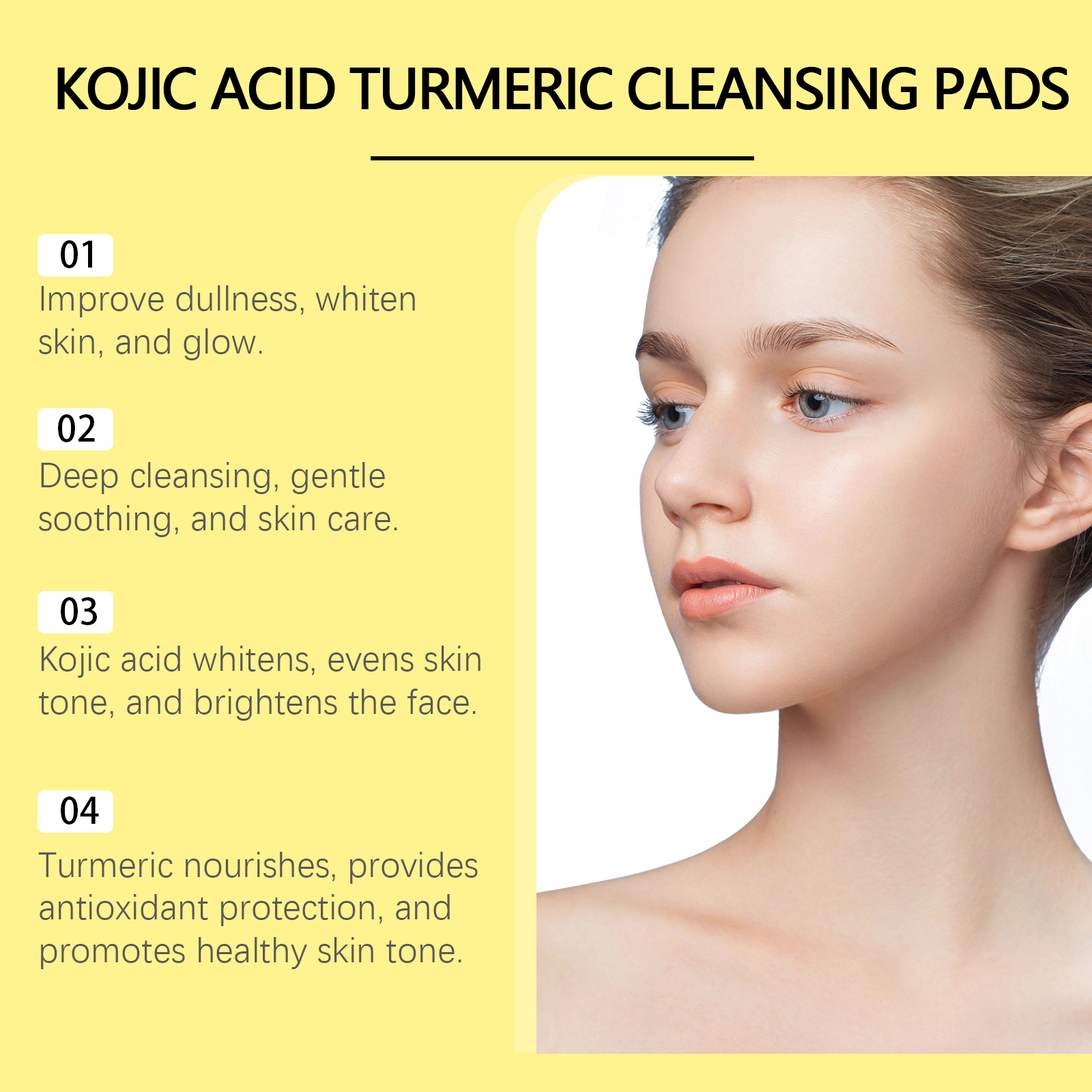 Our turmeric cleaning pads are carefully formulated with turmeric root extract, kojic acid and chamomile extract. Designed specifically for deep pore cleansing, removing dirt and excess oil. The usage method is extremely convenient: 1. First, moisturize the facial skin. 2. Take one tablet of this product, gently apply it to the face, and massage in circular motions to promote absorption. 3. Wait for 1 to 2 minutes and then rinse with clean water. It can also brighten the complexion, reduce facial dullness, effectively fade pigmentation, and make the skin more even and radiant.