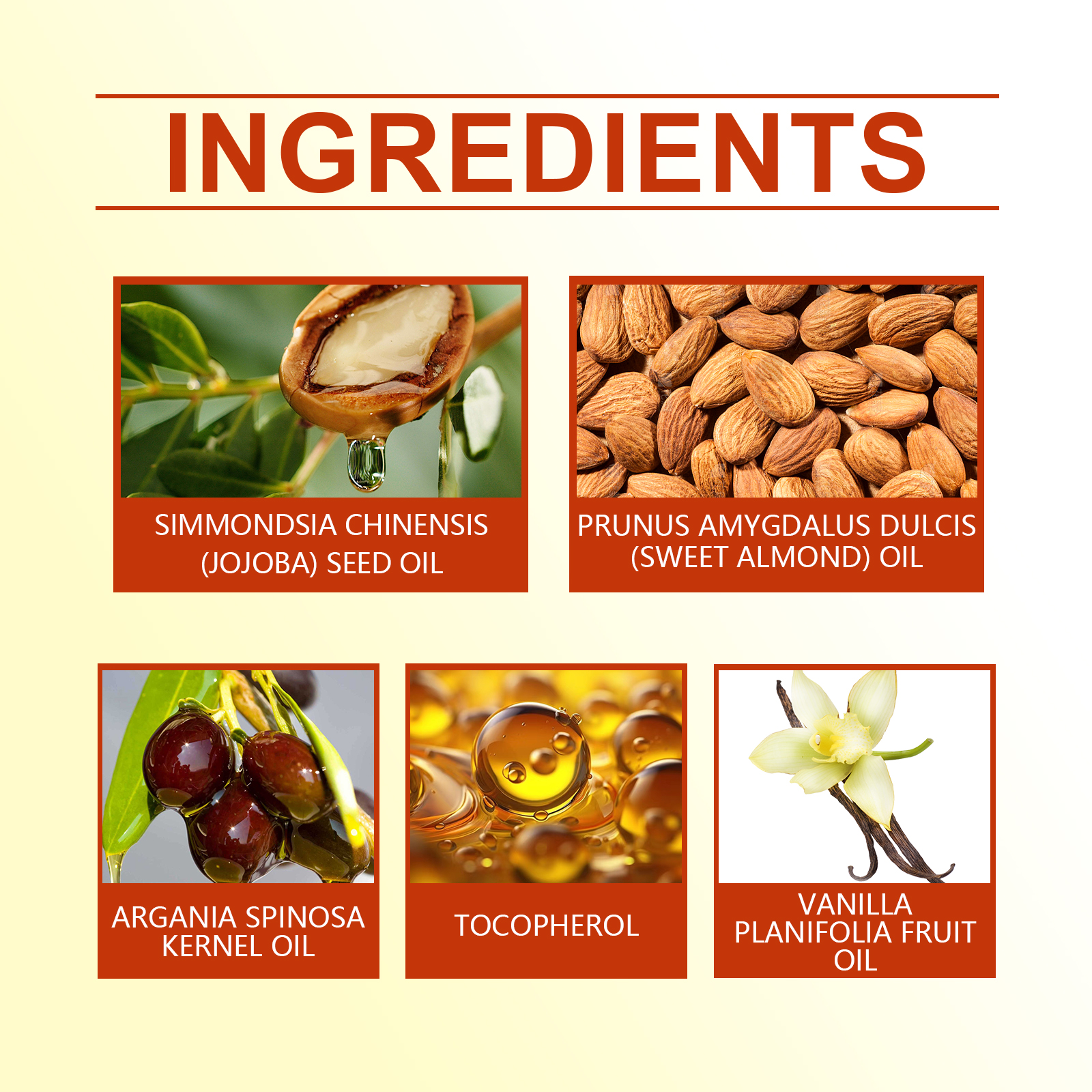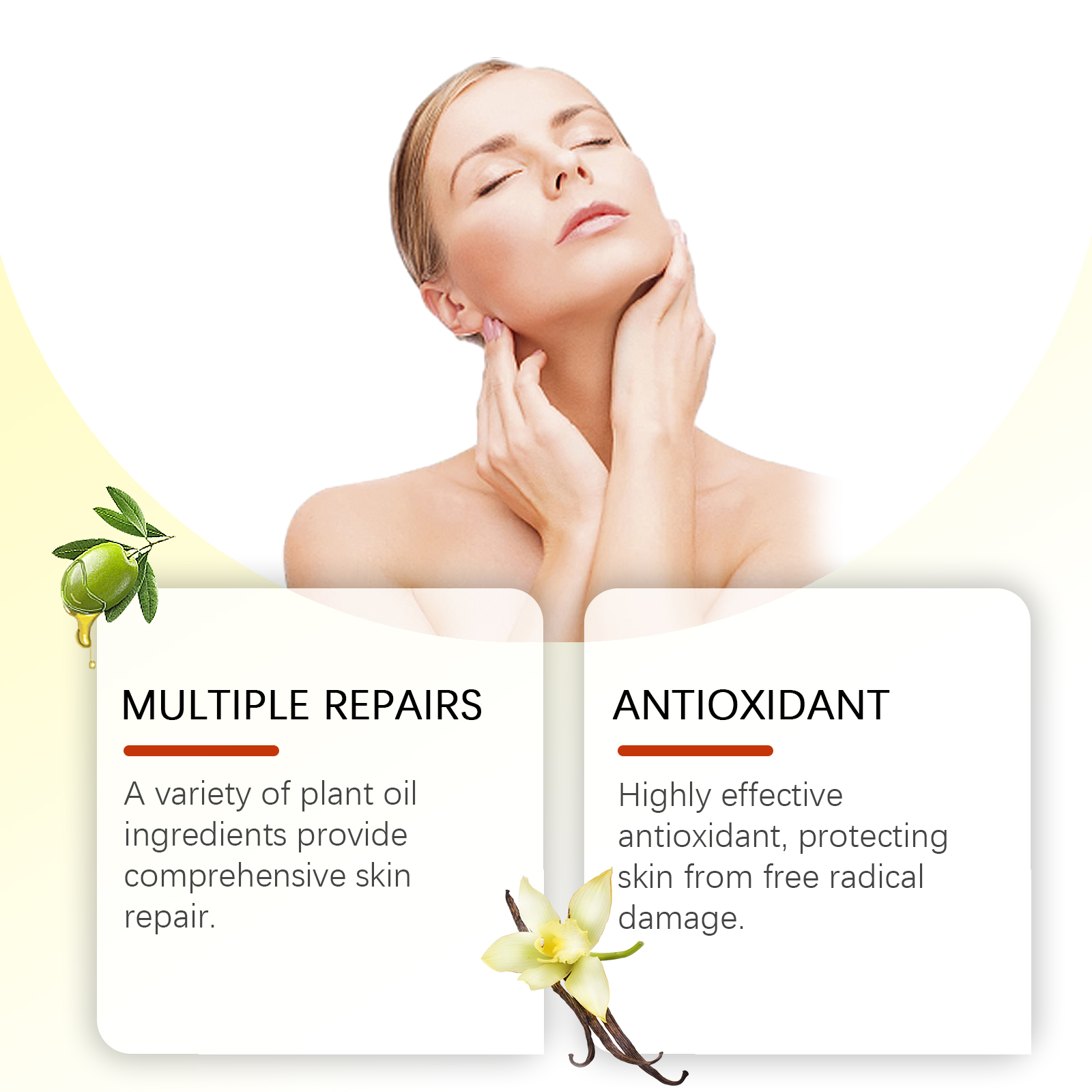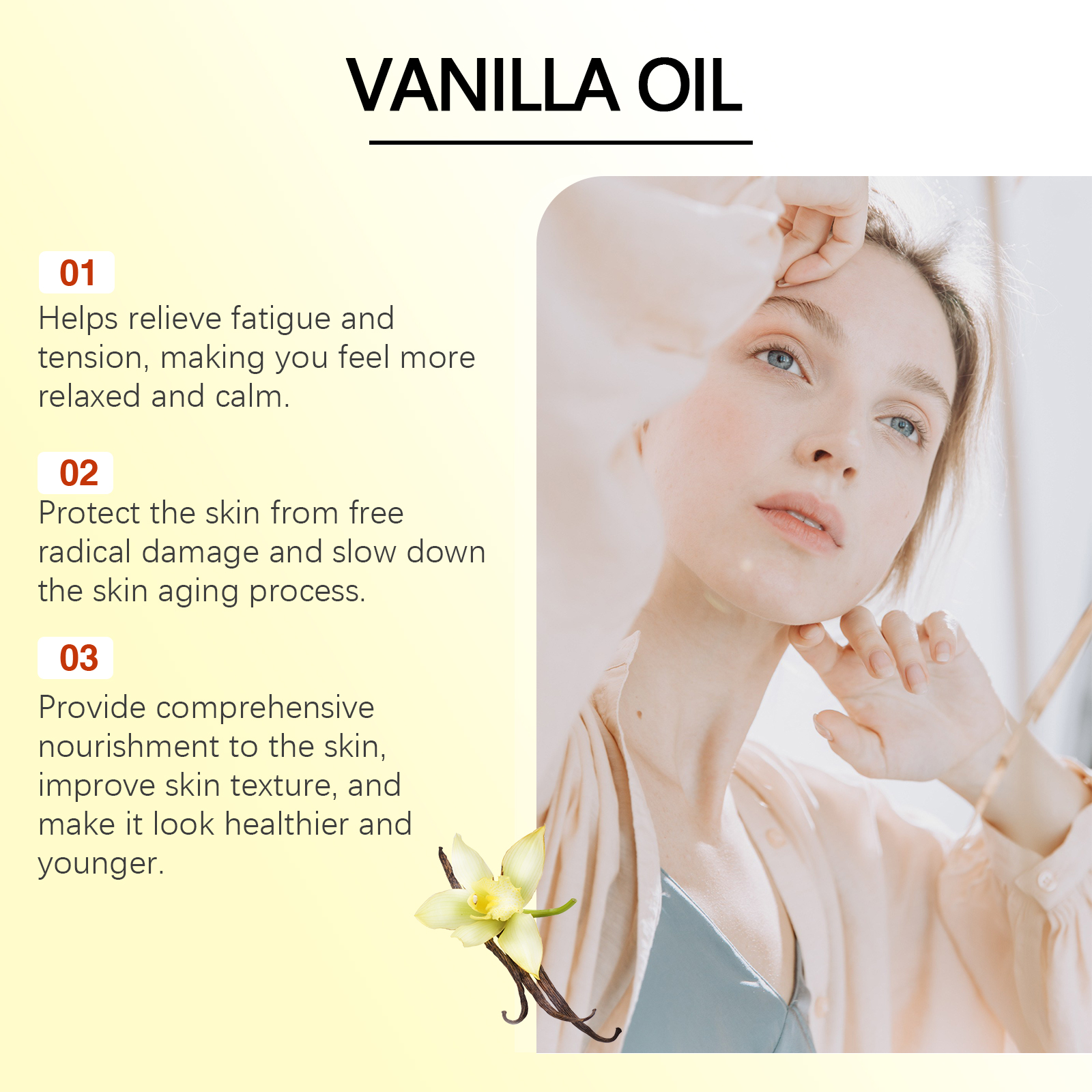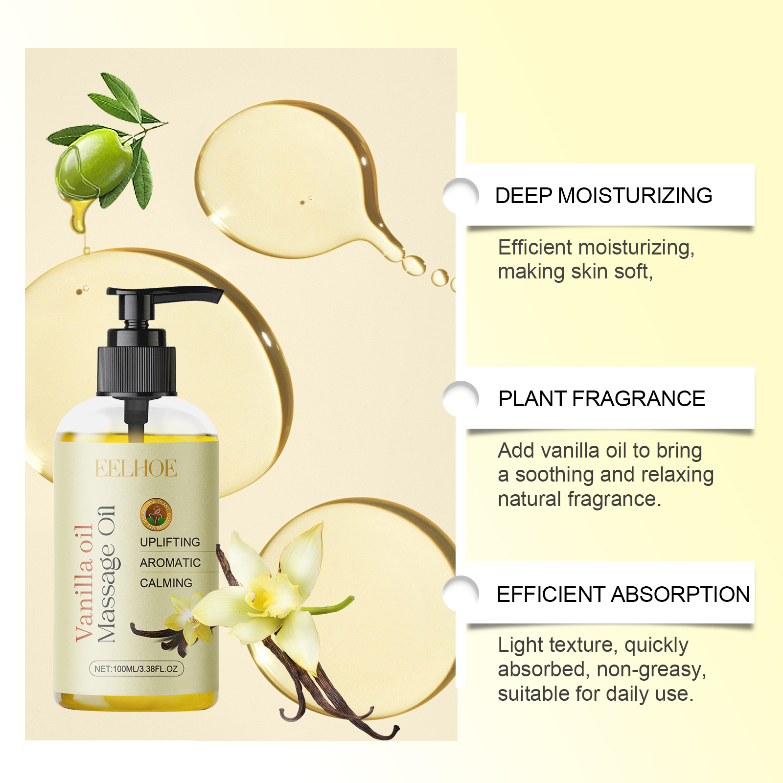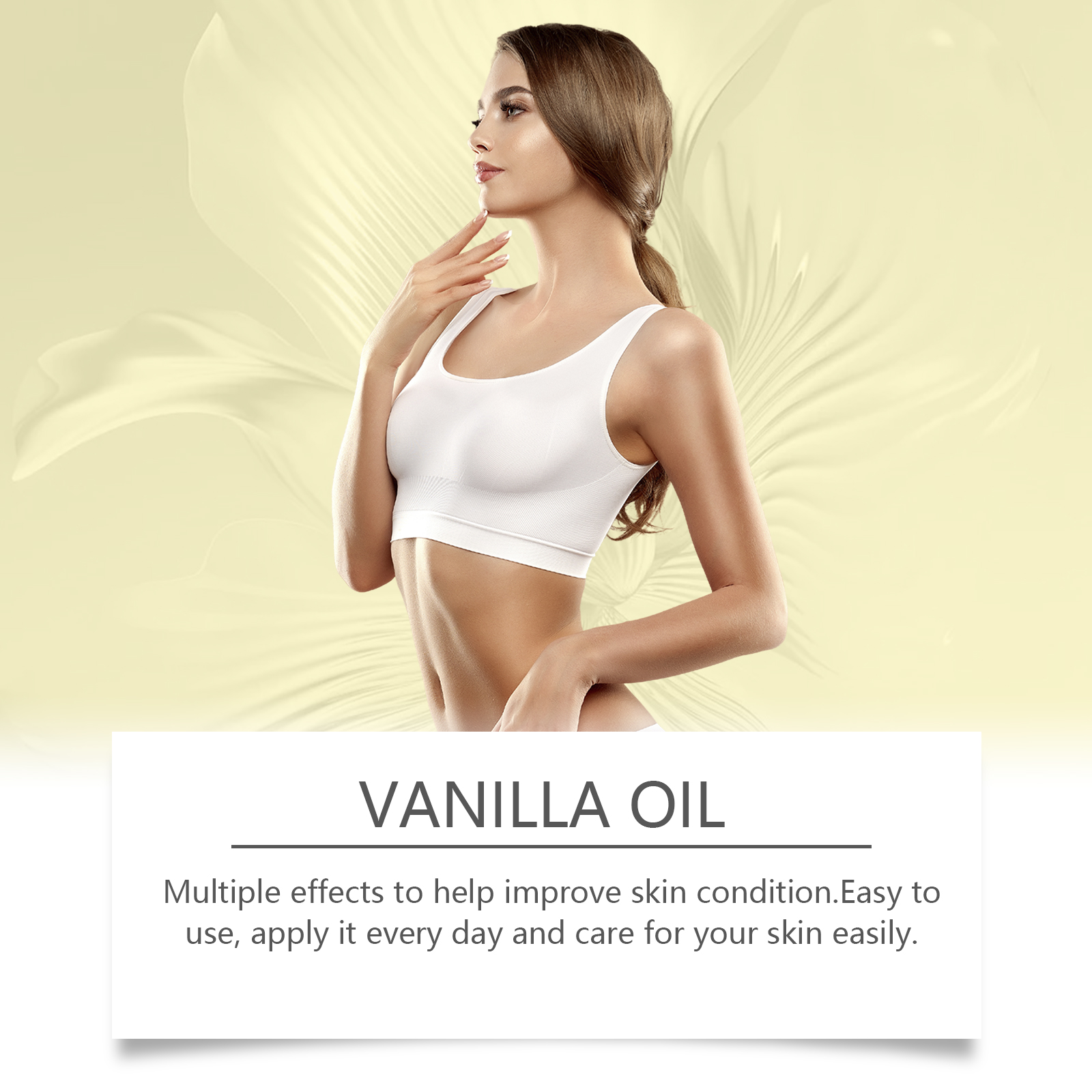 Our vanilla body oil contains argan oil, vitamin E, vanilla oil. It moisturizes efficiently. To soften the skin, add vanilla oil for a soothing and relaxing natural scent. Light texture, fast absorption, non-greasy, suitable for daily use. Its application method is simple: 1. Clean the skin and keep it dry. 2. Apply a few drops of massage oil to your shoulders, arms, thighs, and other areas. 3. Massage gently to promote absorption. A variety of vegetable oil ingredients provide a comprehensive skin repair. Highly effective antioxidant to protect skin from free radical damage.