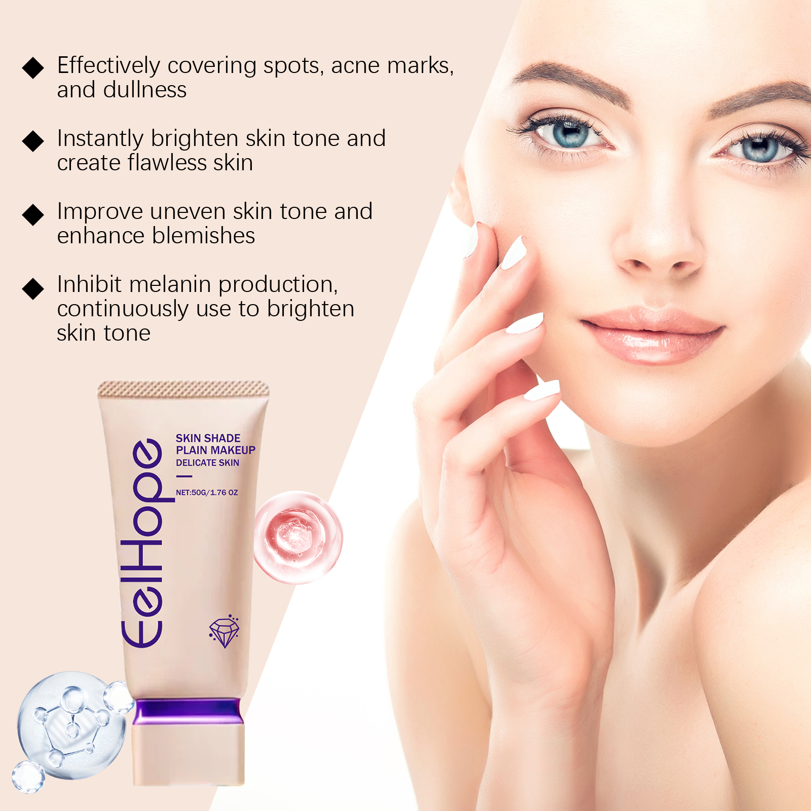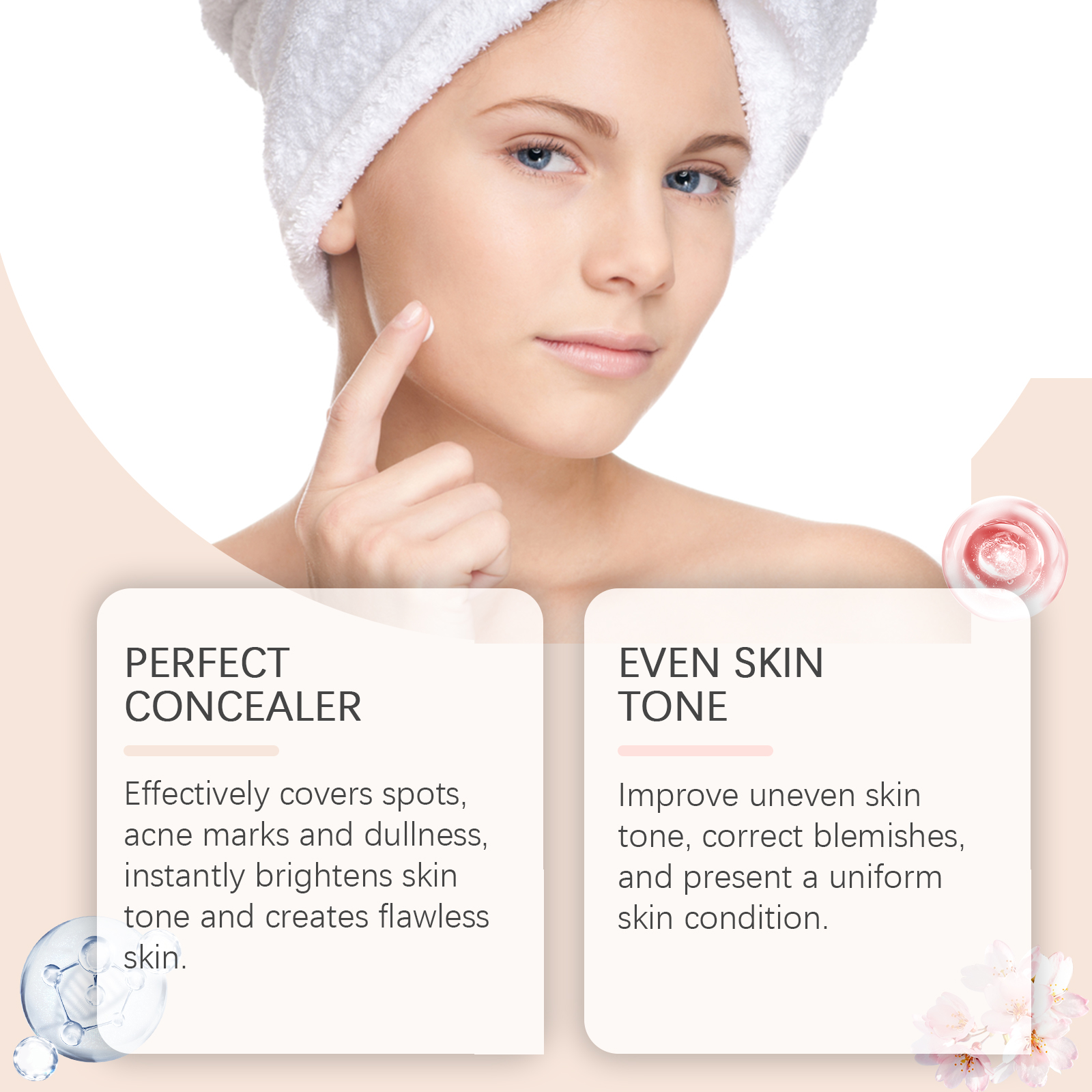 Our concealer cream contains bifidobacteria, hyaluronic acid, cherry blossom extract. It effectively covers spots, pimple marks and dullness, instantly brightening the complexion and creating flawless skin. Improves uneven skin, corrects blemishes and presents an even skin condition. The way to use it is very simple: 1. Thoroughly clean the skin and dry it first. 2. Apply an appropriate amount of this product evenly on the face, arms, legs, neck and other parts of the skin that you want to cover defects and brighten. 3. Gently massage until completely absorbed. It contains no irritating ingredients and is suitable for all skin types, including sensitive skin. Enhance skin elasticity, reduce fine lines and wrinkles, and keep skin firm and youthful.