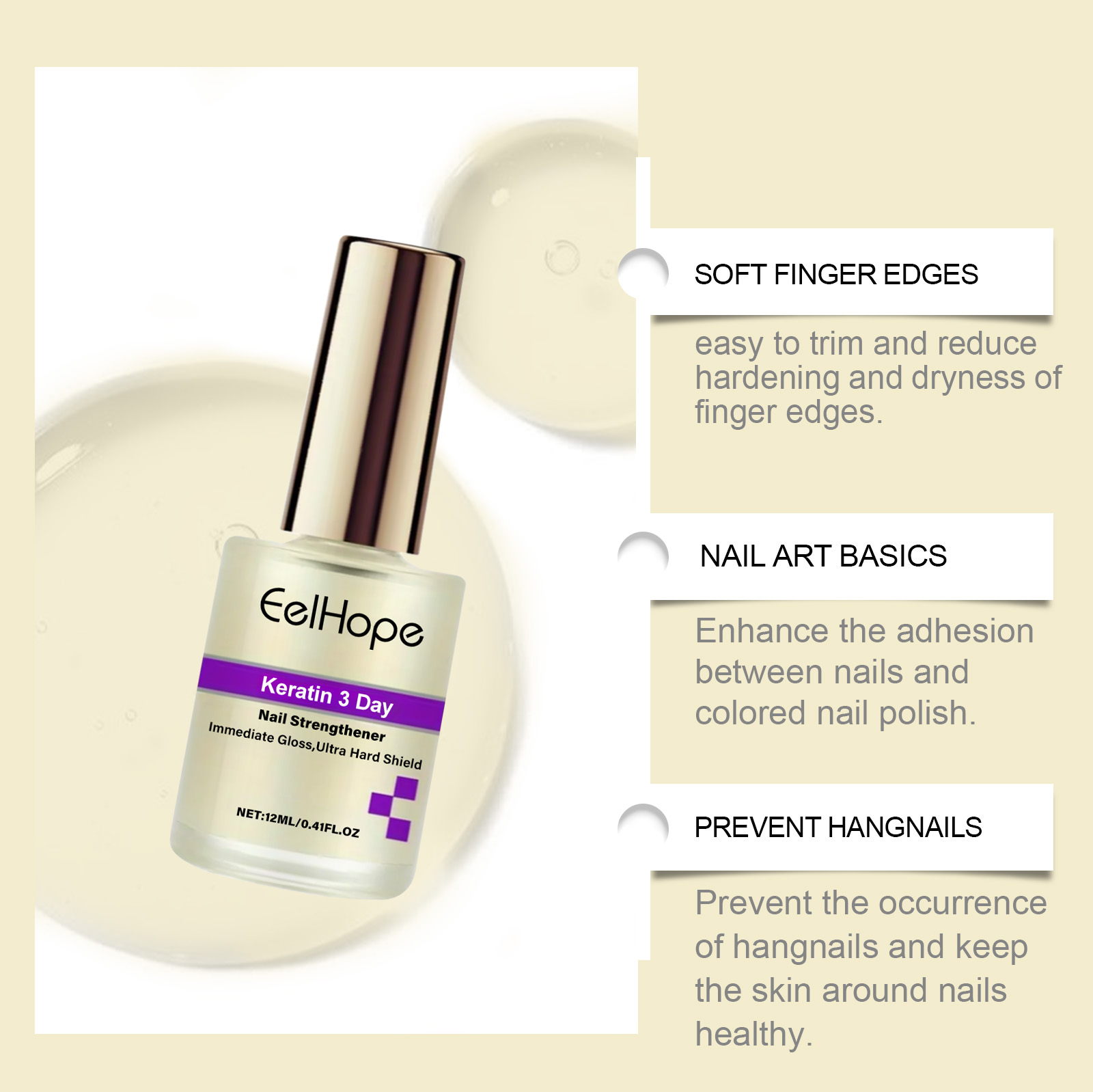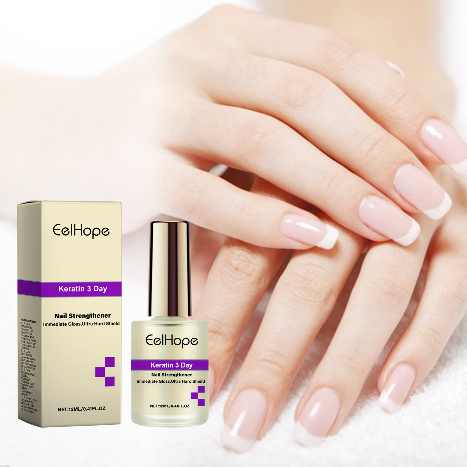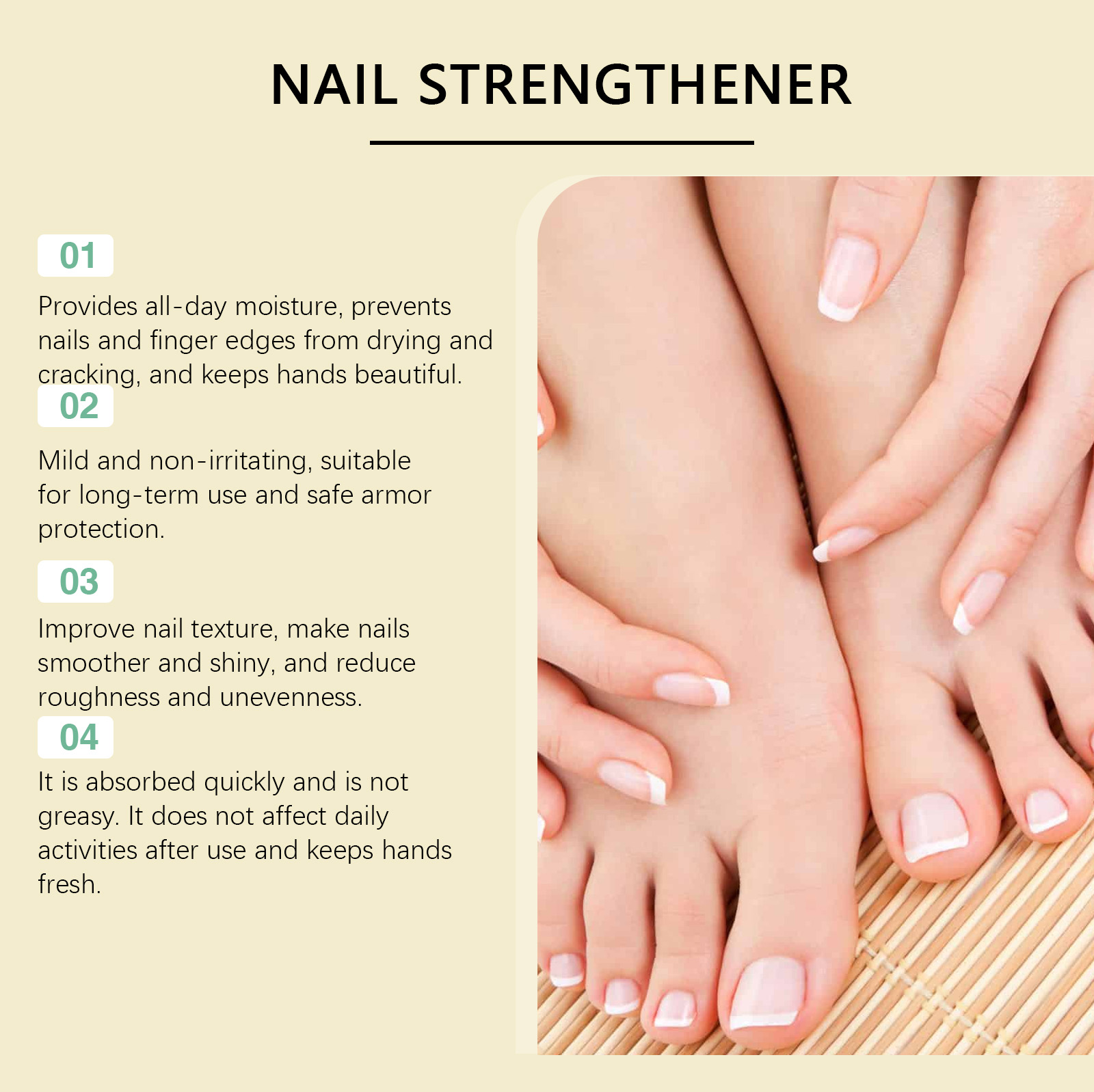 Our nail care solution contains keratin, grape seed extract, hydrolyzed wheat protein. It prevents the occurrence of barbs and keeps the skin around the nails healthy. Repair dry nails to make them stronger and less likely to break. Its application method is simple: 1. Clean and dry the nails and surrounding skin. 2. Apply proper amount of the product to the nails. 3. Gently massage with fingertips to promote absorption. Thickens and brightens nails for a healthier skin.