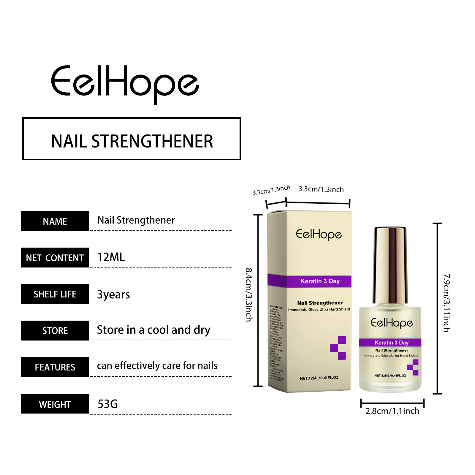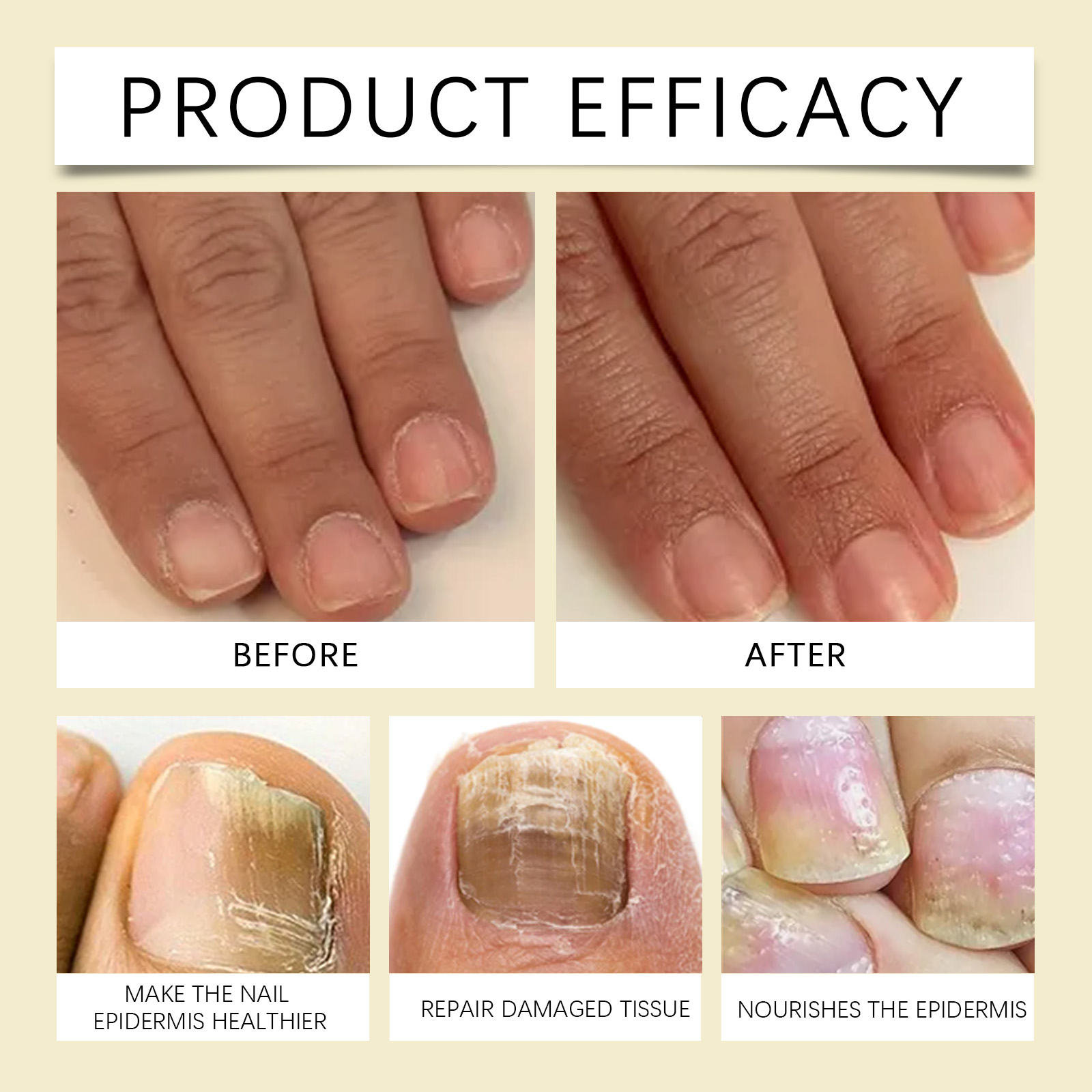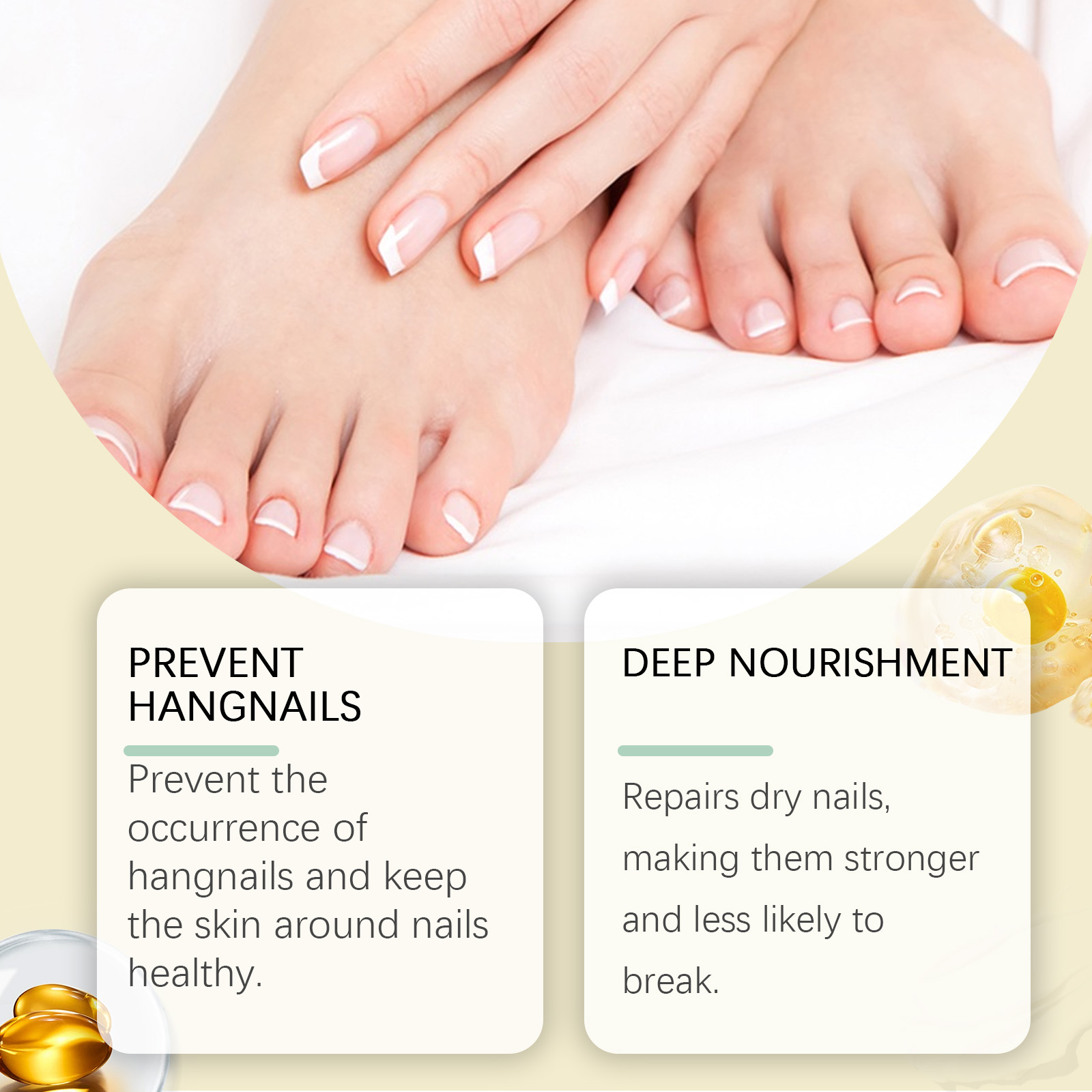 Our nail care solution contains keratin, grape seed extract, hydrolyzed wheat protein. It prevents the occurrence of barbs and keeps the skin around the nails healthy. Repair dry nails to make them stronger and less likely to break. Its application method is simple: 1. Clean and dry the nails and surrounding skin. 2. Apply proper amount of the product to the nails. 3. Gently massage with fingertips to promote absorption. Thickens and brightens nails for a healthier skin.