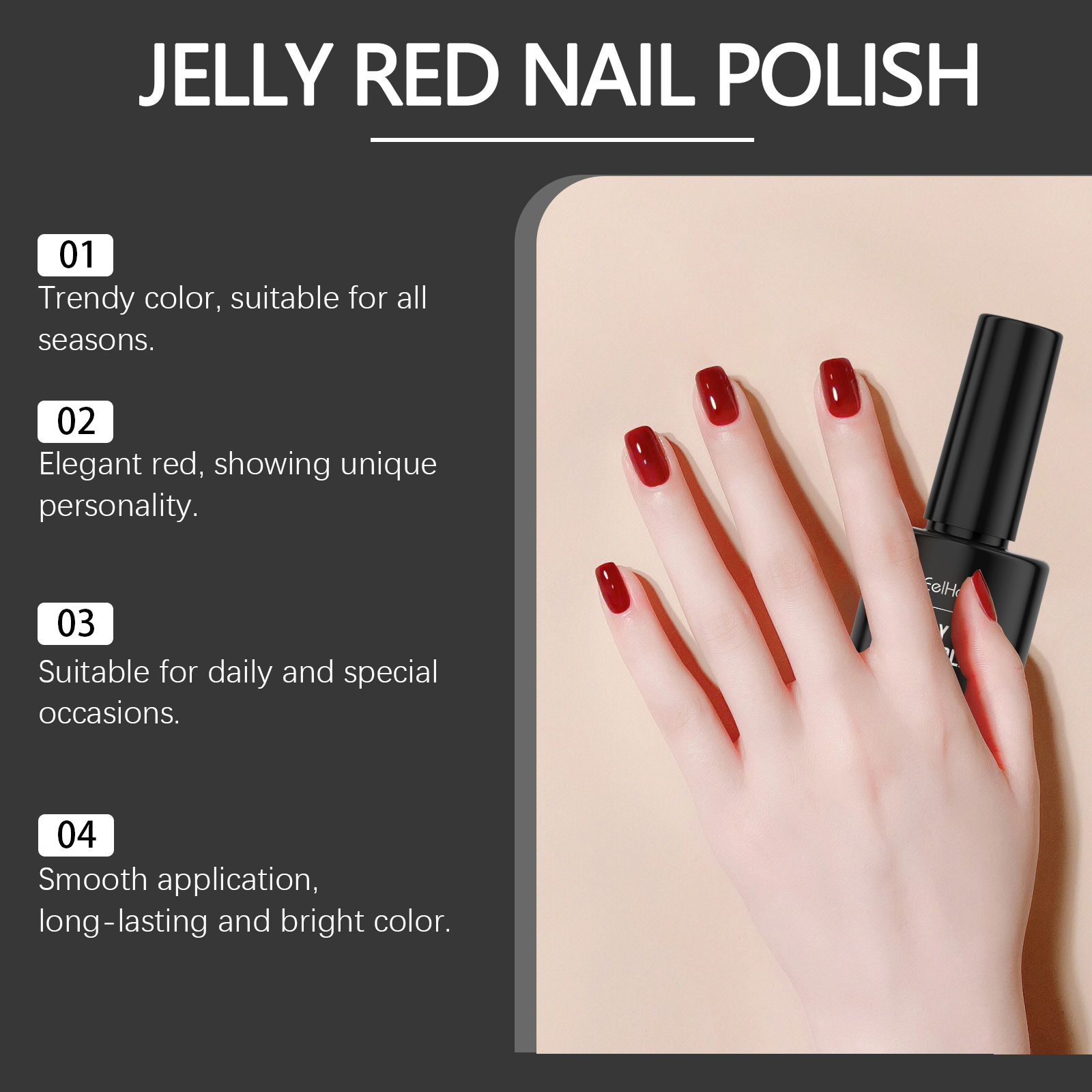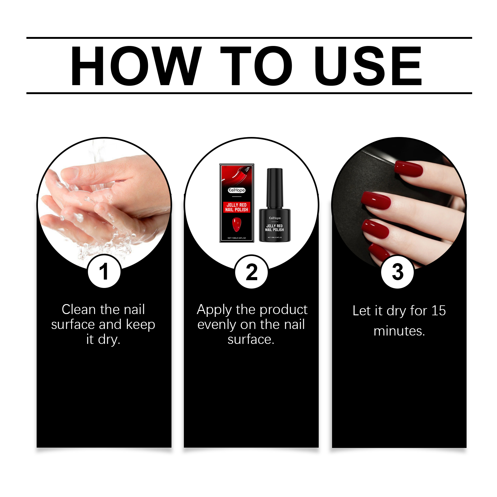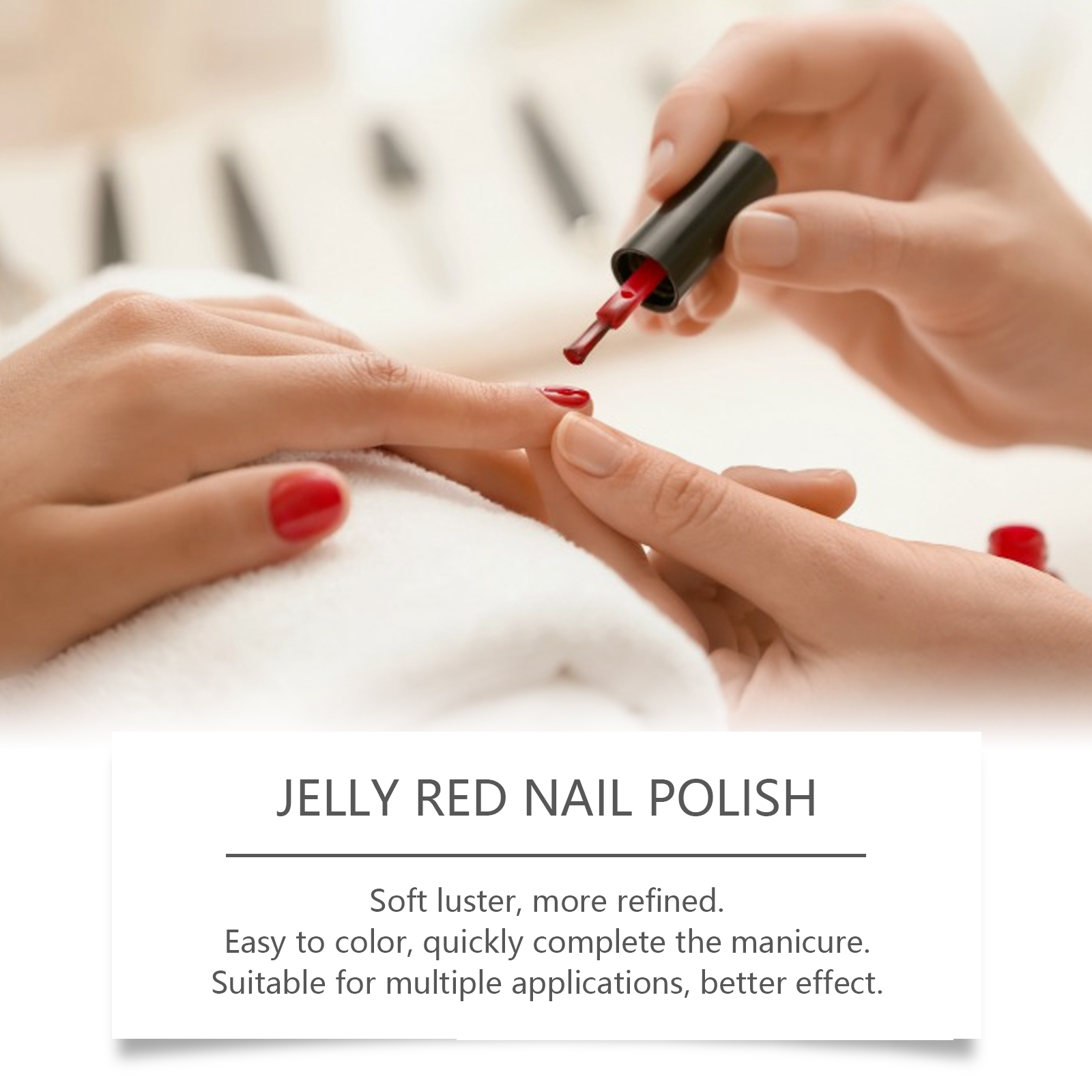 Our red jelly nail polish contains vitamin C (ascorbic acid), vitamin E (tocopherol). It dries quickly and reduces waiting time. Its application is simple: clean the surface of the nail and keep it dry. Apply the product evenly to the nail surface. Let it dry for 15 minutes. And choose high-end shades to make your nails shine.