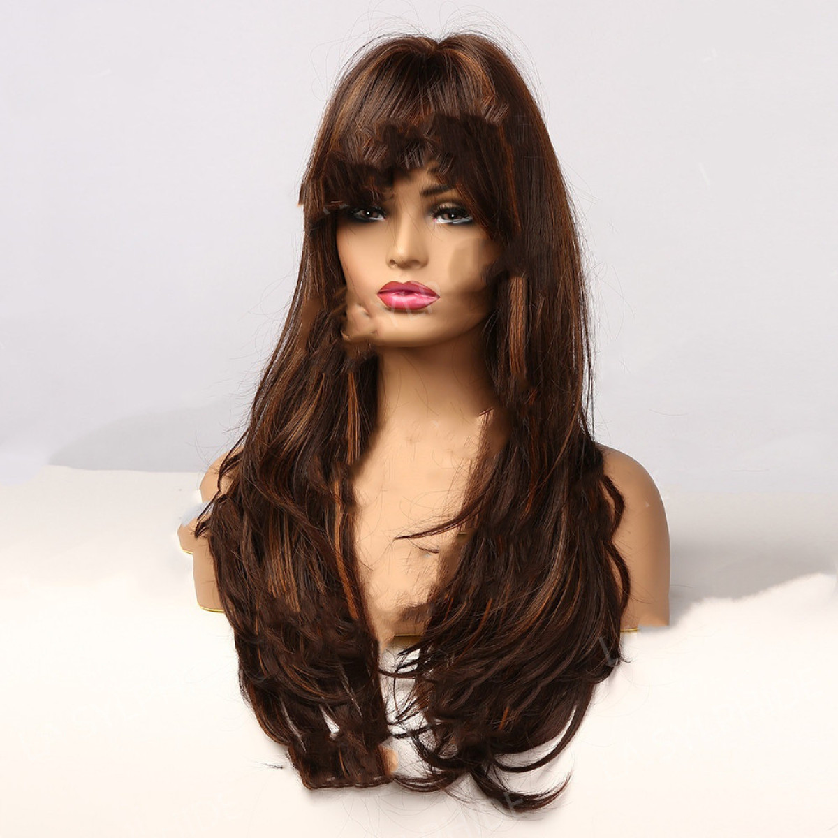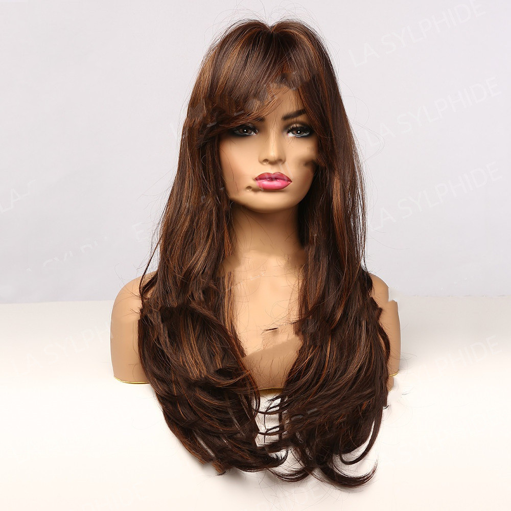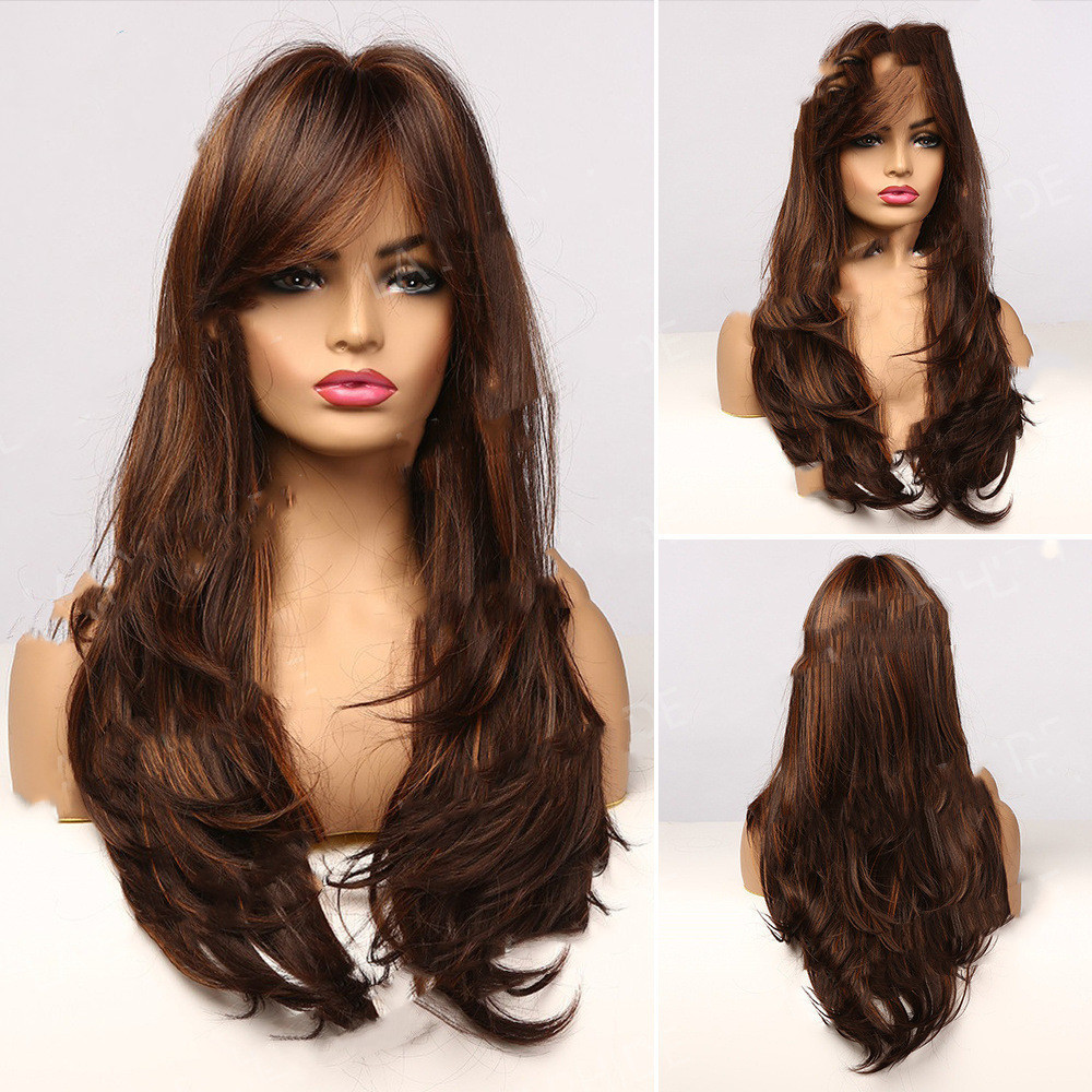 Wig hairstyle: long curly hair with oblique bangs