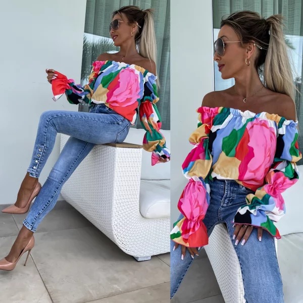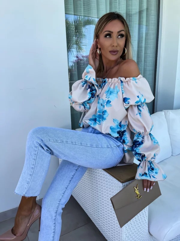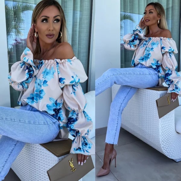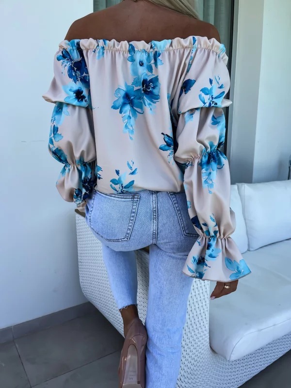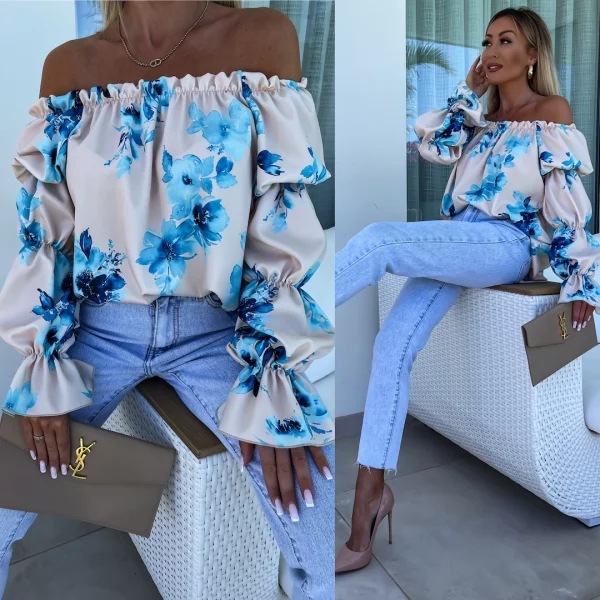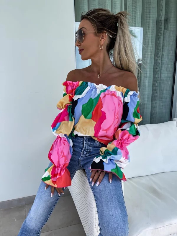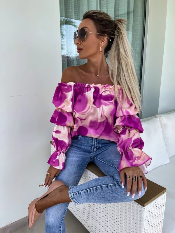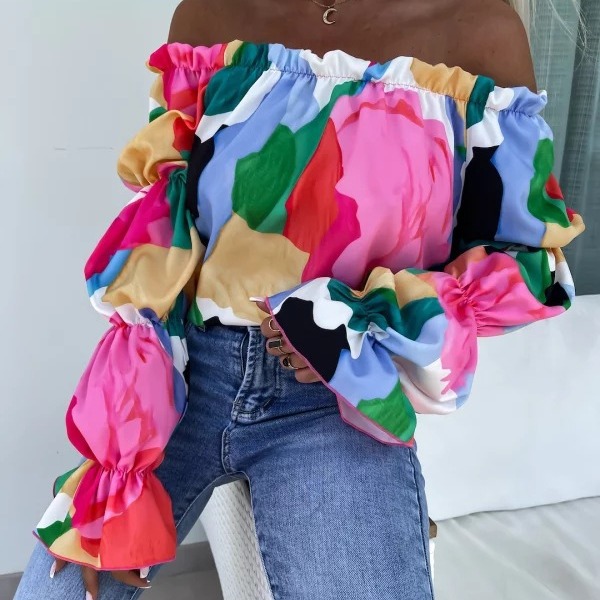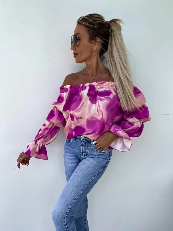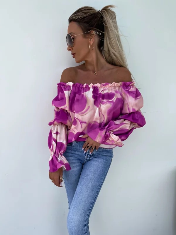 Elastic One Shoulder Lantern Lotus Leaf Sleeve Printed Shirt With Long Sleeves