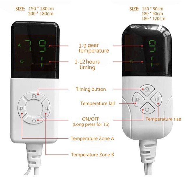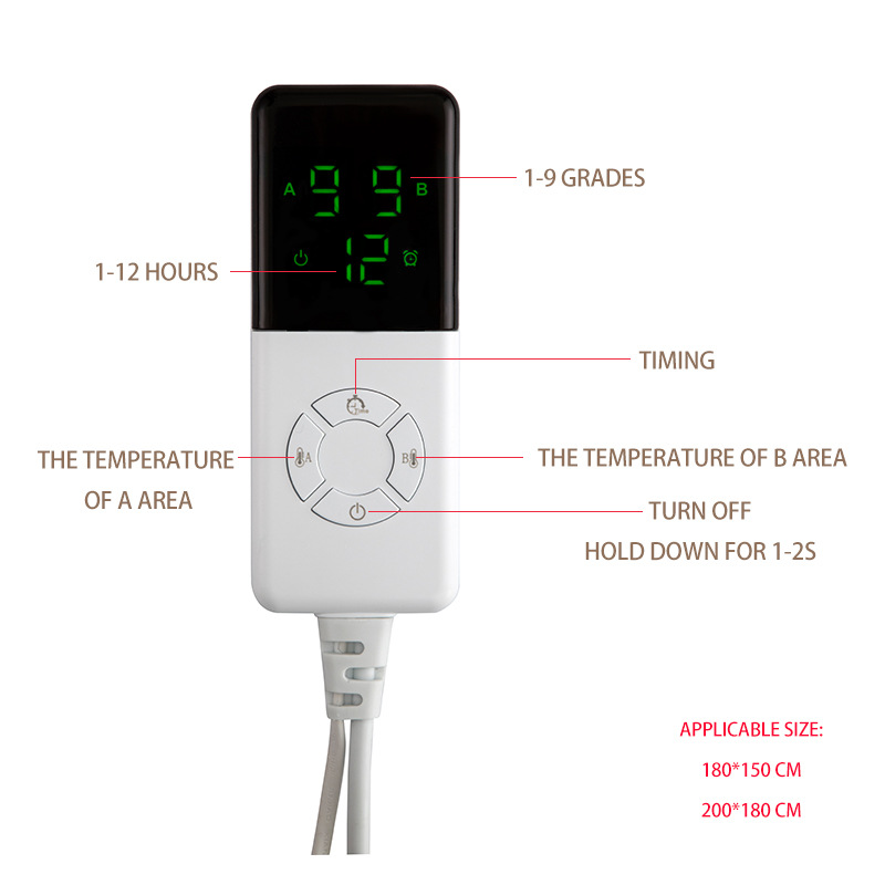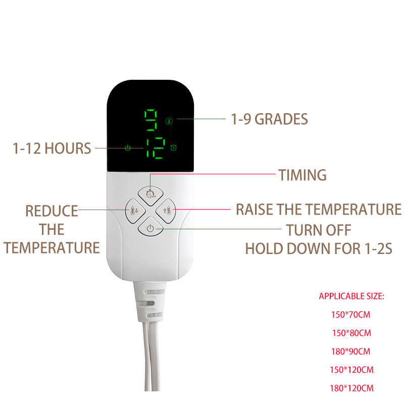 Dimensions:150*70 cm single-person, single-control temperature-adjustable switch,150*80 cm single-person, single-control temperature-adjustable switch,150*120 cm double-person, single-control temperature-adjustable switch,180*120 cm double-person, single-control temperature-adjustable switch,180*150 cm double-person, dual-control temperature-adjustable switch,200*180 cm double-person, dual-control temperature-adjustable switch