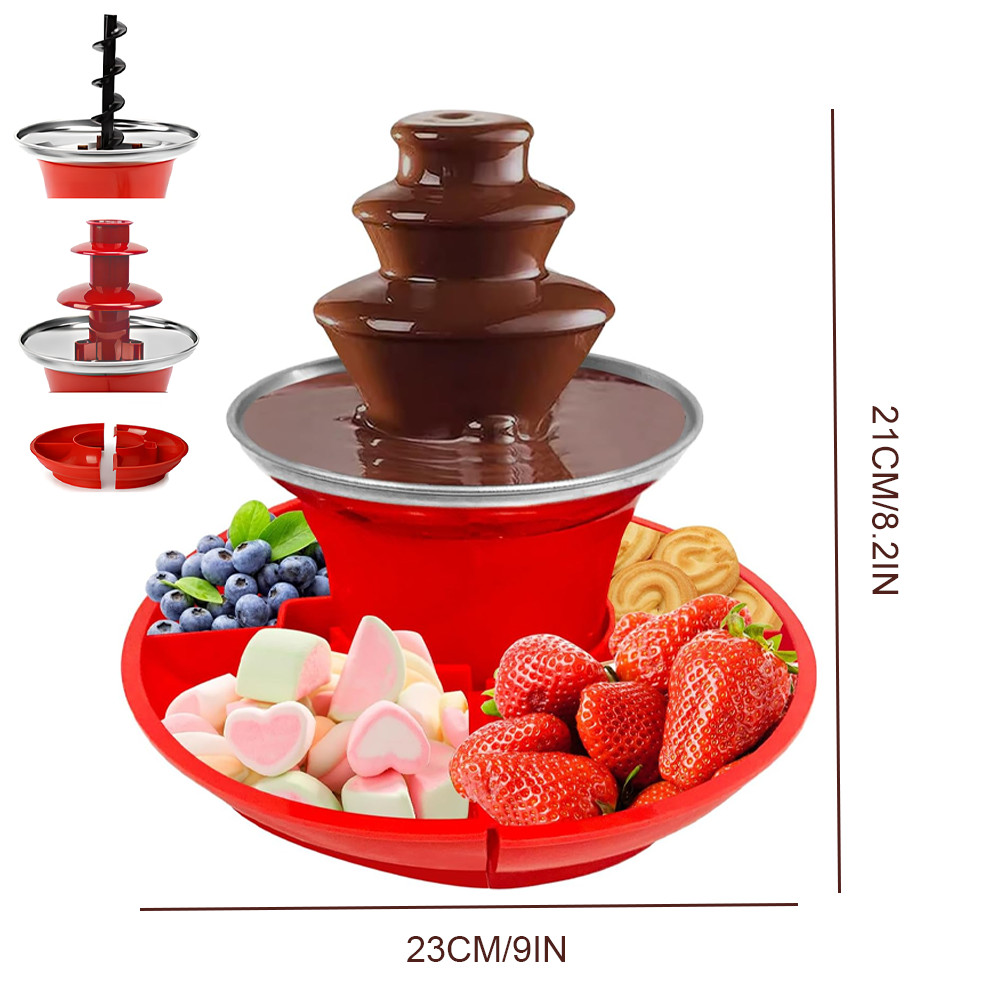 [THREE-TIERS OF CHOCOLATE HEAVEN] - Crafted from stainless steel and housed inside a solid plastic case, this three-tier fountain is simple to assemble and easy to clean | 350 ml capacity. Fun party size Height 21cm, Width 23 cm Depth 23cm (including tray)
