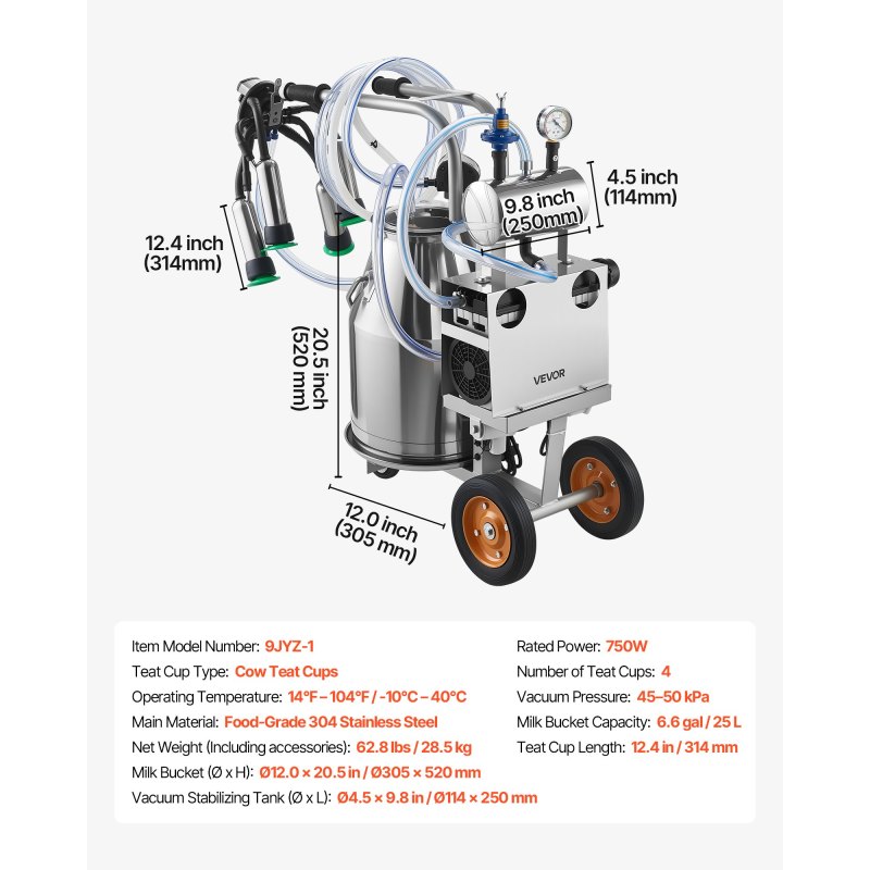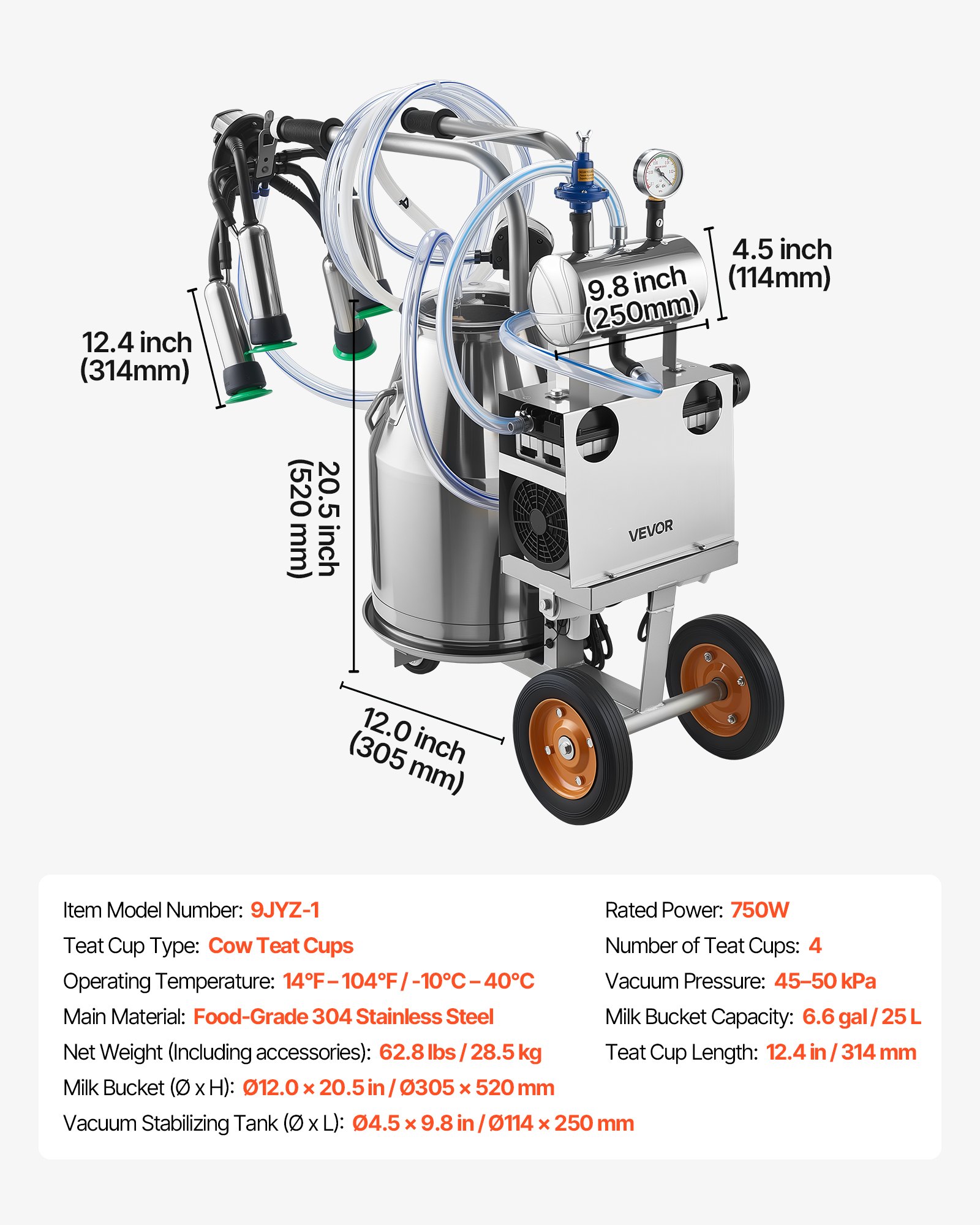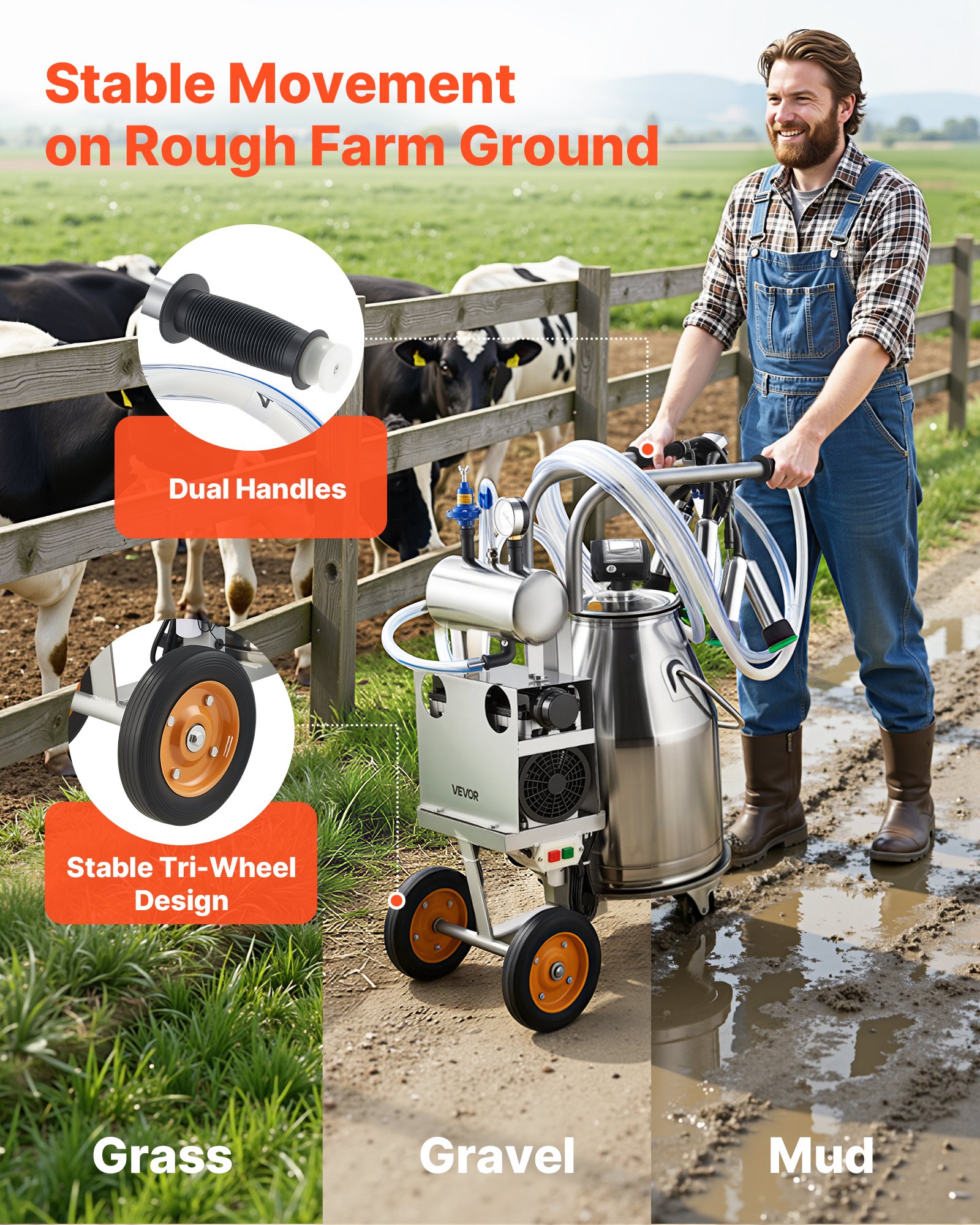 Food-Grade Materials You Can Trust: This electric milking machine for cow features a 6.6-gallon / 25L food-grade 304 stainless steel milk bucket and food-grade silicone hoses, helping keep milk clean and pure