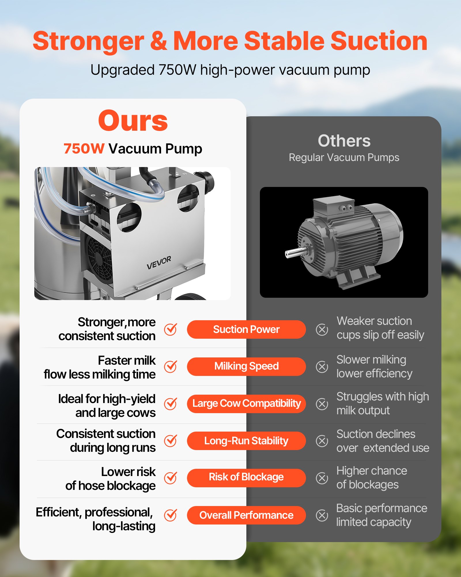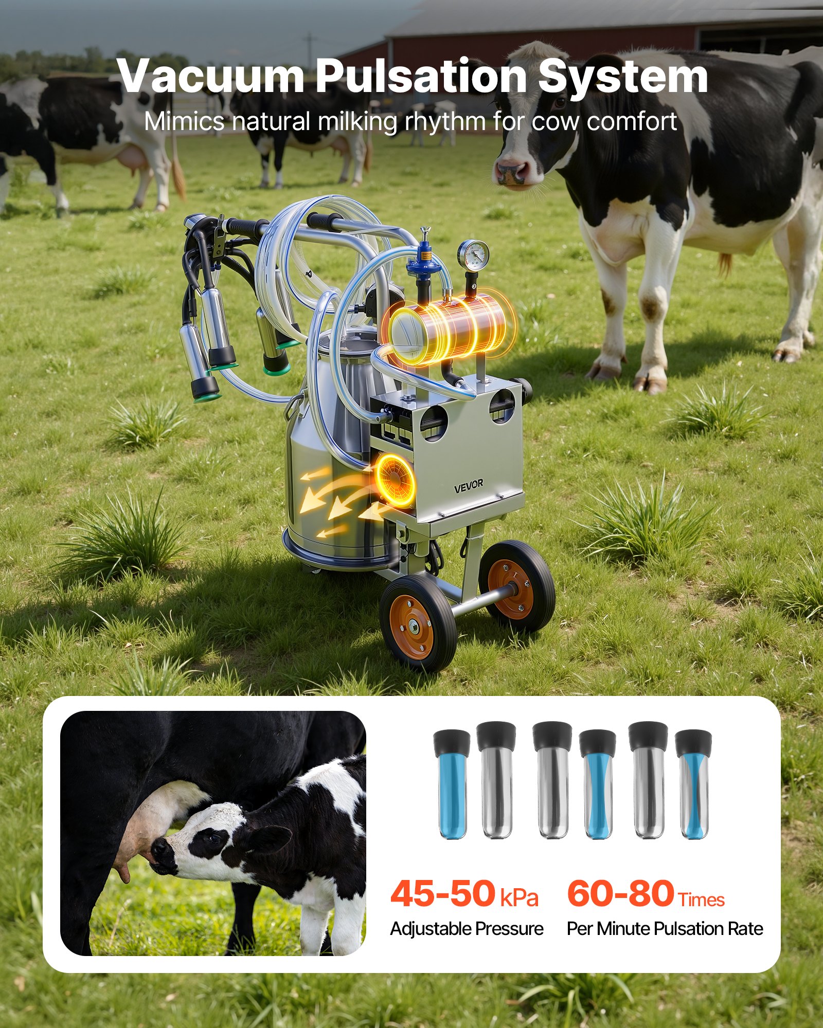 Faster Milking Efficiency: Equipped with an upgraded 750W vacuum pump, this electric cow milking machine delivers strong, stable suction for faster milking. The adjustable 45-50 kPa vacuum level supports flexible control across different milking stages.
