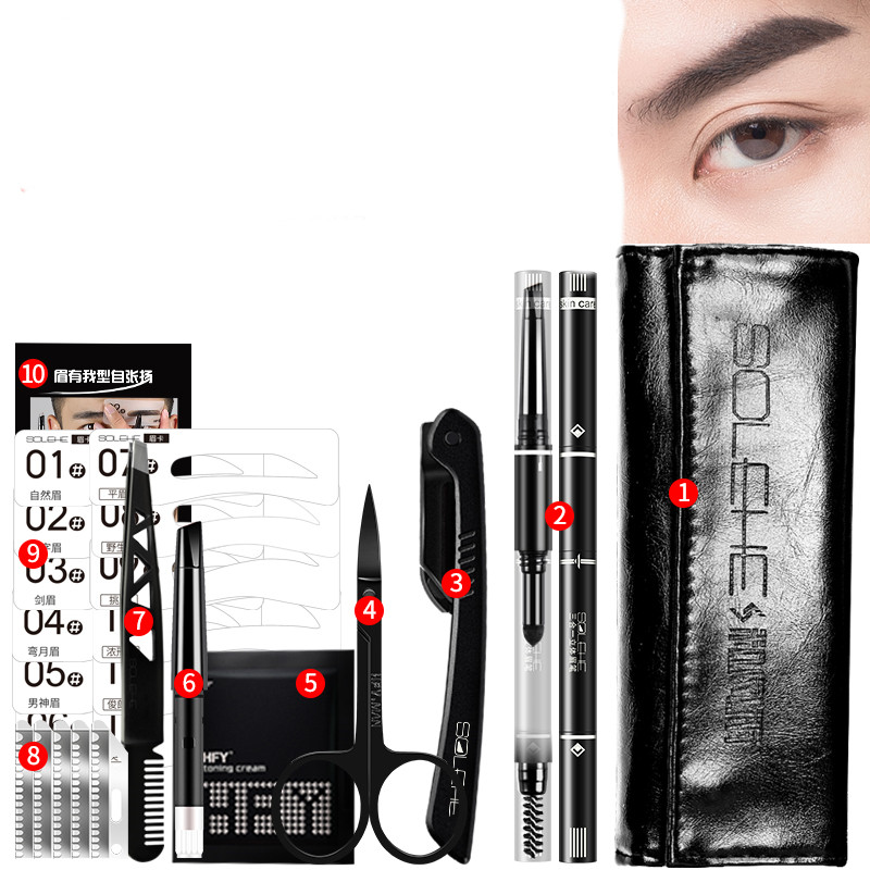 A:Electric black eyebrow pencil eyebrow trimming set(1. Leather eyebrow bag 6. Eyebrow pencil replacement core 11. Electric eyebrow trimming body 2. Three-in-one eyebrow pencil 7. Eyebrow trimming clip