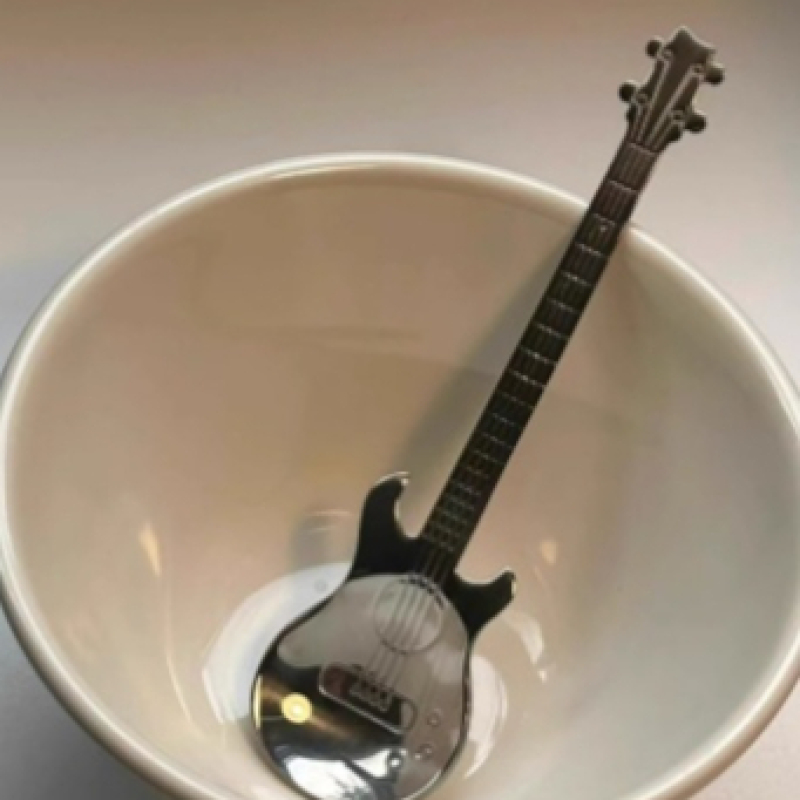 A stainless steel spoon with an electric guitar look