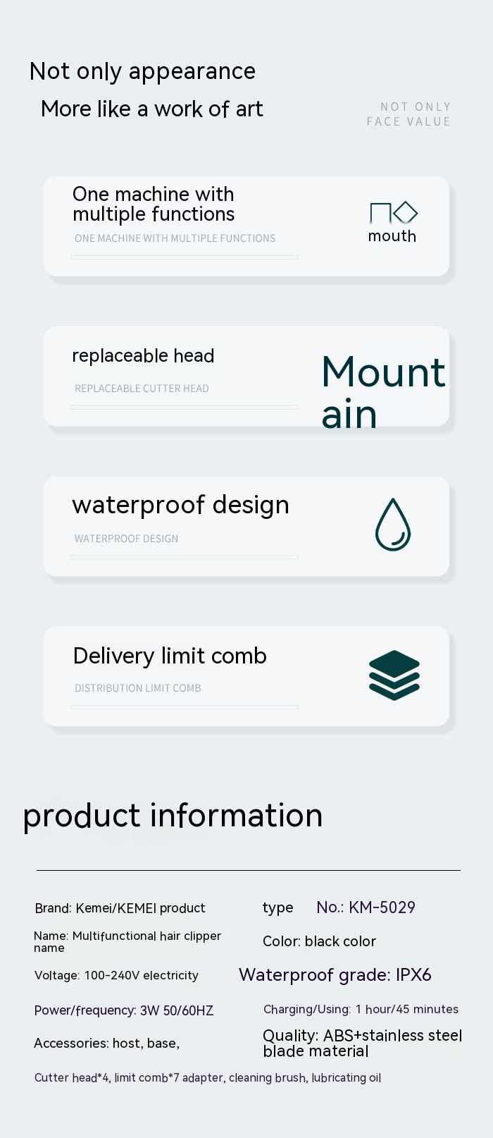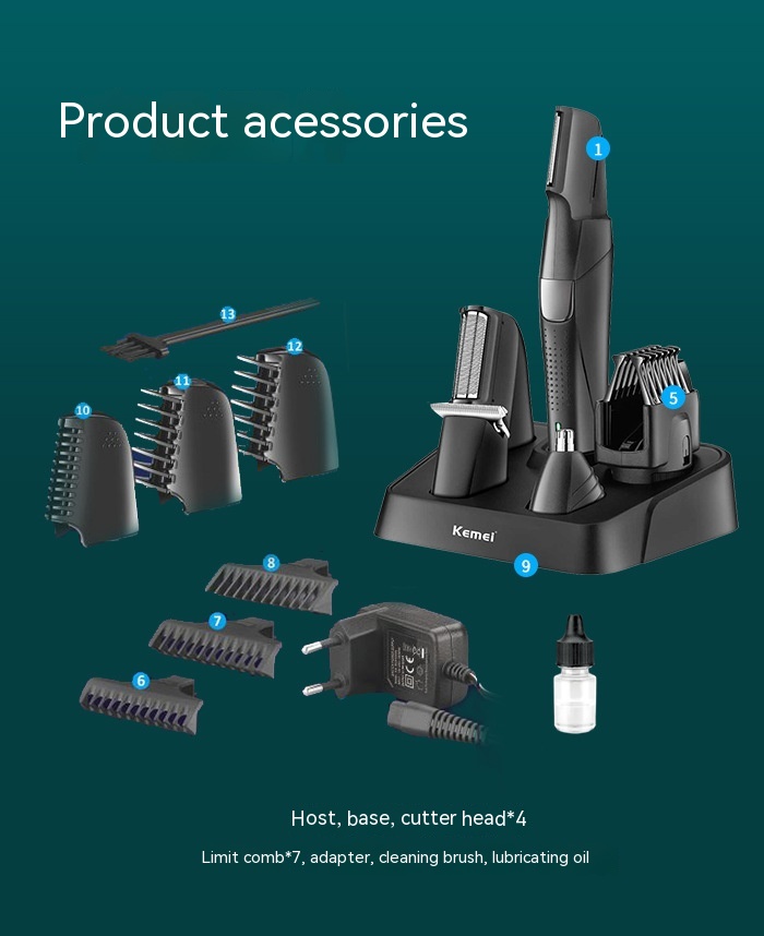 Barber, base, blade * 4, limit comb * 7 adapter, cleaning brush, lubricating oil