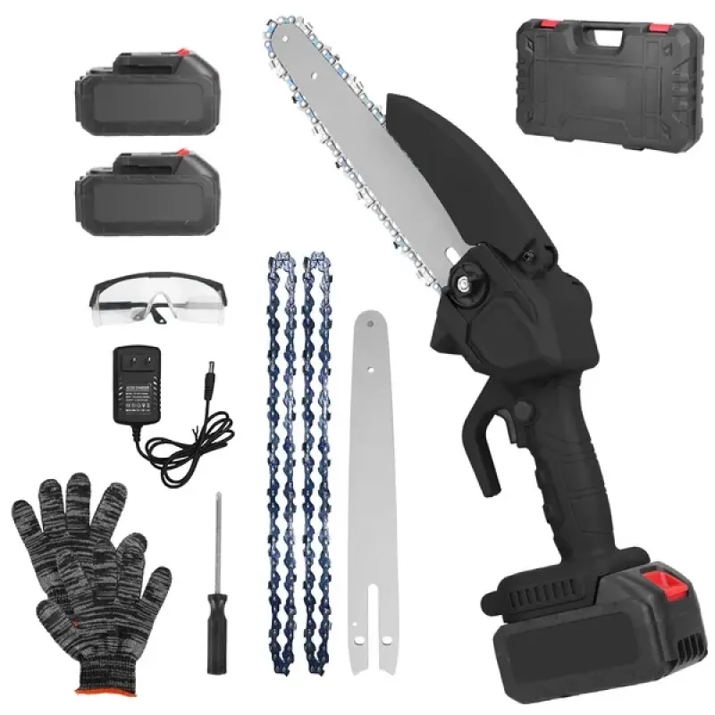 1 x Electric Chainsaw 2 x 21V Batteries 1 x Battery Charger Adapter 2 x 8In Saw Chains 1Pair x Gloves 1 x 8In Saw Chain Guide Board 1 x Screwdriver 1 x Goggles 1 x Storage Box 1 x User Manual