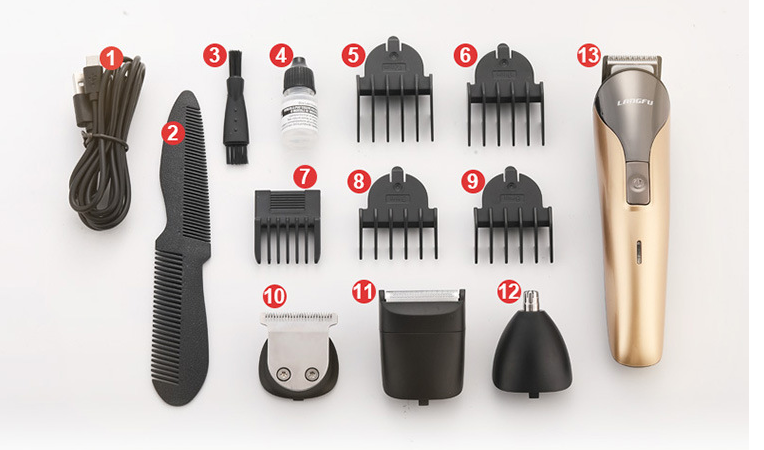 ♥ Standard list: 1 main unit, 1 razor head, 1 haircut head, 1 sideburn head, 1 nose hair head, 1 sideburner 1-4 gear adjustment positioning comb, 1 haircut knife 3 / 6/9/12 mm 4 positioning combs, 1 comb on both sides, 1 cleaning brush, 1 vial of lubricating oil, 1 storage base, 1 USB power cord, packaging box, instruction manual (Chinese and English); (Remarks : Need to contact the customer service consultation with cloth and sponge);