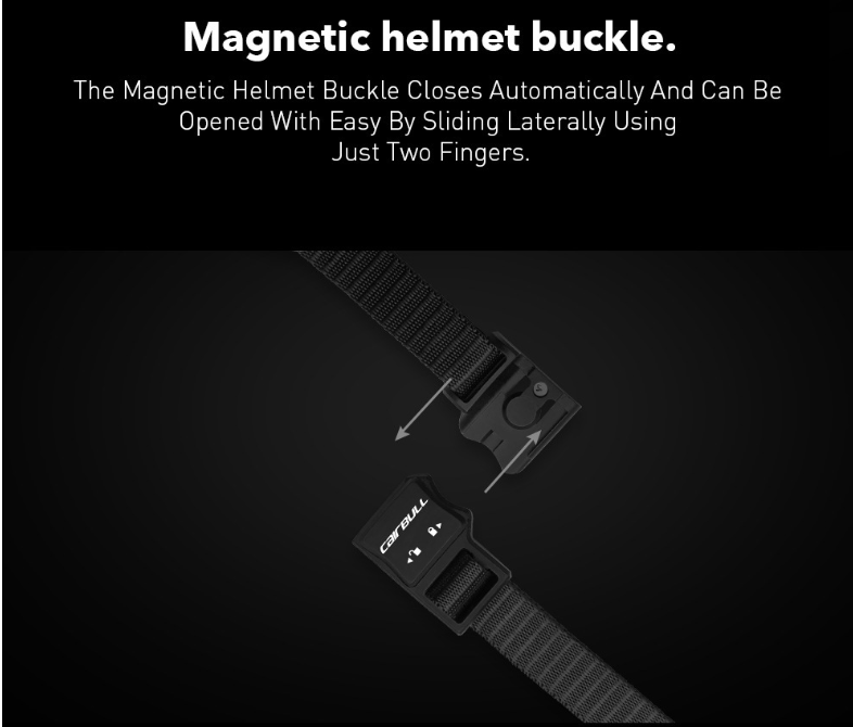 ■ The magnetic helmet buckle closes automatically and can be opened with easy by sliding laterally using just two fingers