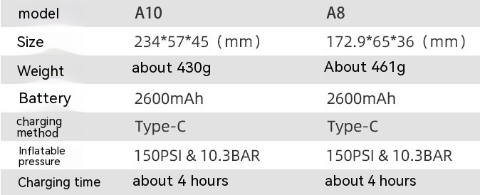 Product information:Color: A10,A8 Material: tire pump Size; 234*57 * 45mm Battery: 2600AH