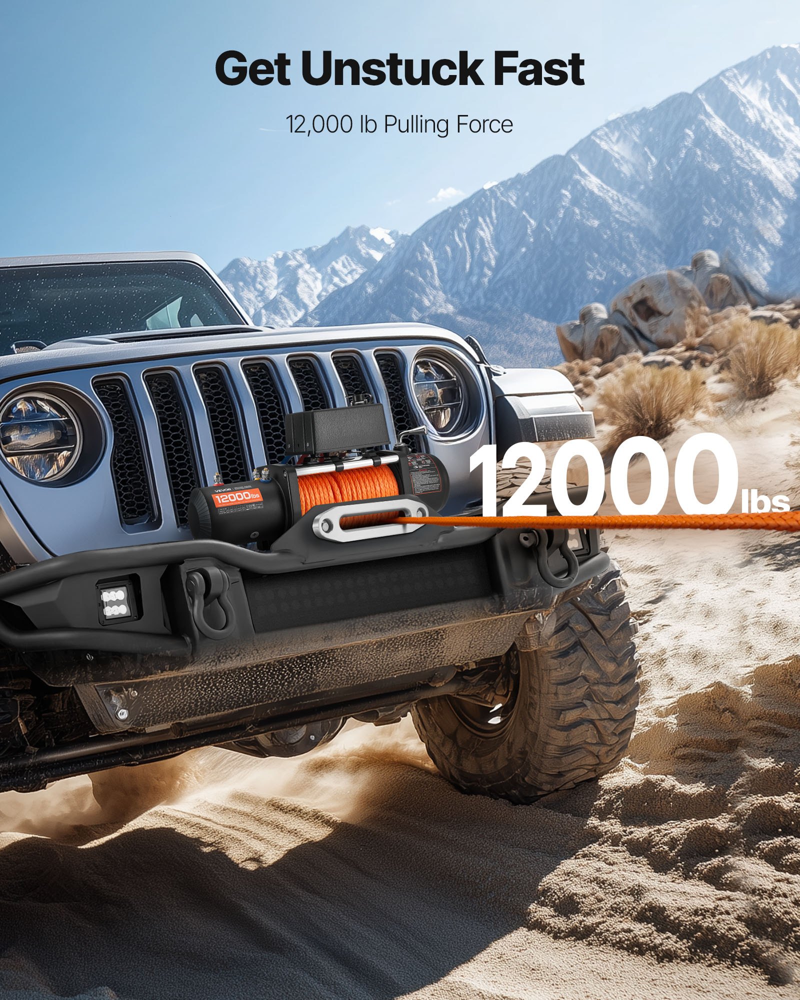 12000 lbs Strong Pull: This electric winch delivers 12,000 lbs pulling force, making SUV or pickup recovery from mud or sand quick and stress-free without gear distortion worries