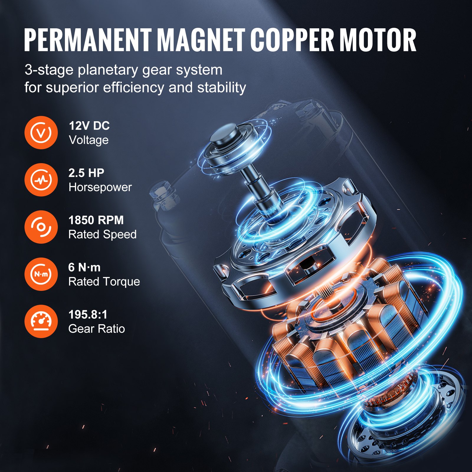 Power that Gets You Out of Any Jam: Our truck winch is driven by a 12V DC/2.5HP permanent magnet copper motor, delivering consistent power when you need it most. Featuring an advanced 3-stage planetary gear system and a 195.8:1 gear ratio, this winch ensures powerful pulling capacity, even in harsh weather and the deep mud. Get ready to tackle any challenge with confidence!