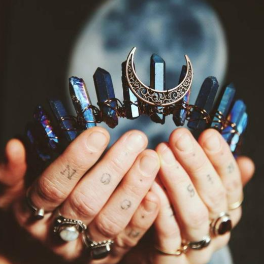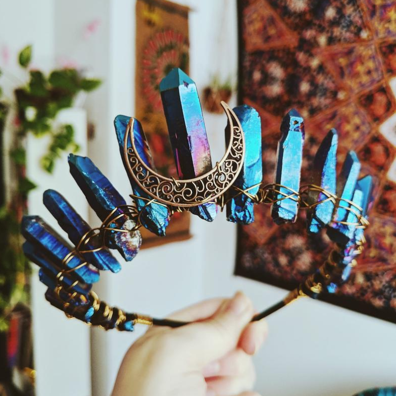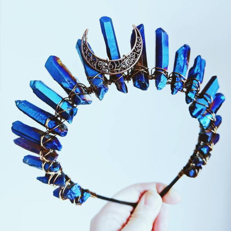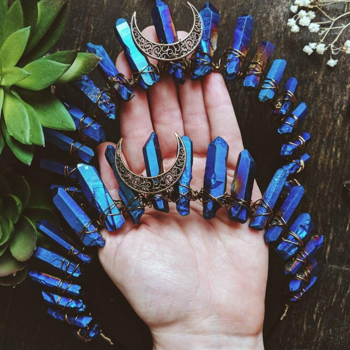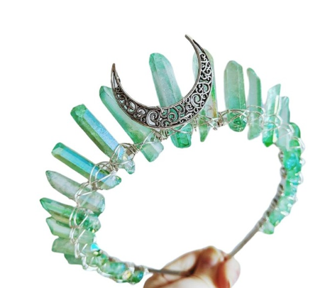 Handmade contrast color raw crystal quartz, hollow out metal alloy crescent moon center decoration, winding with wire.