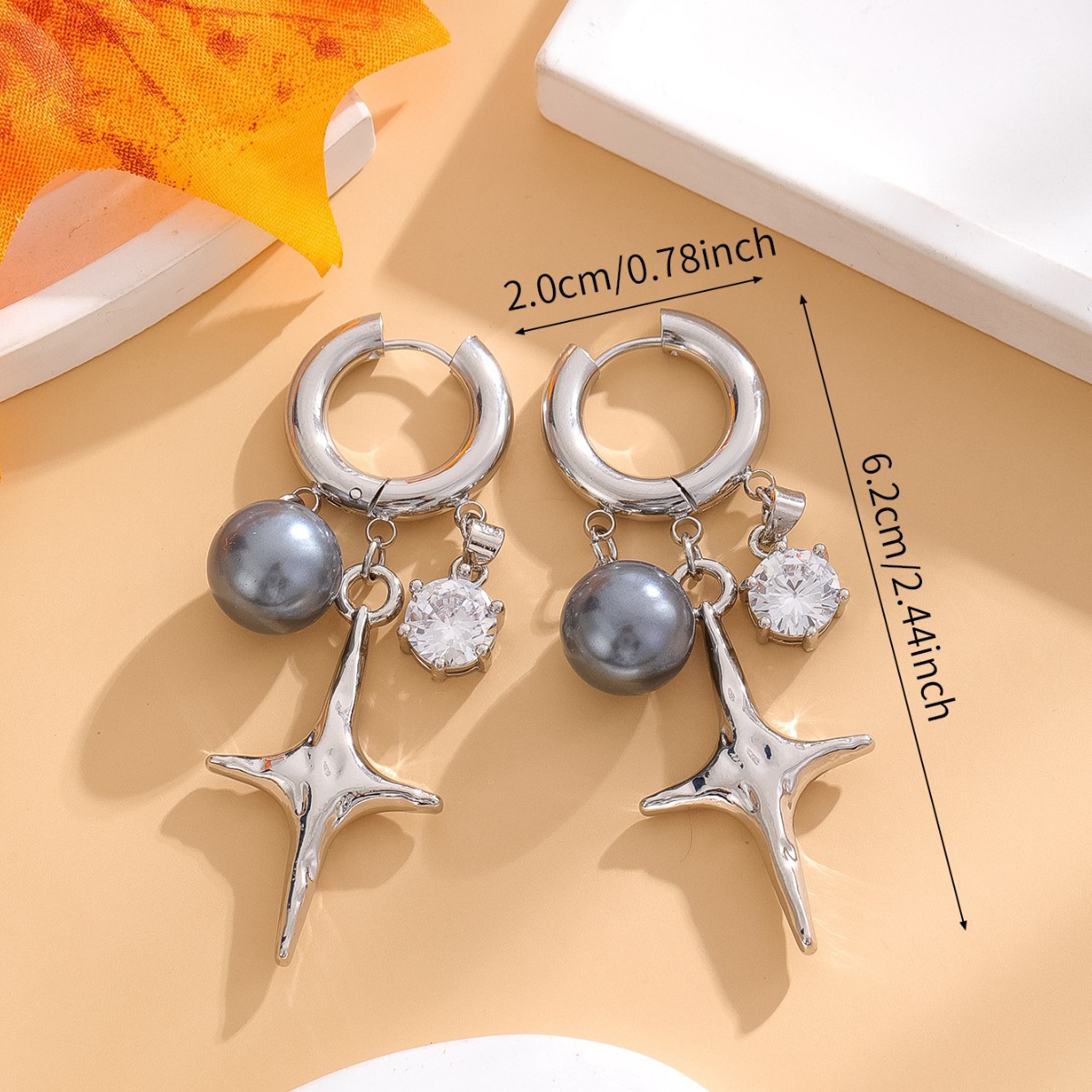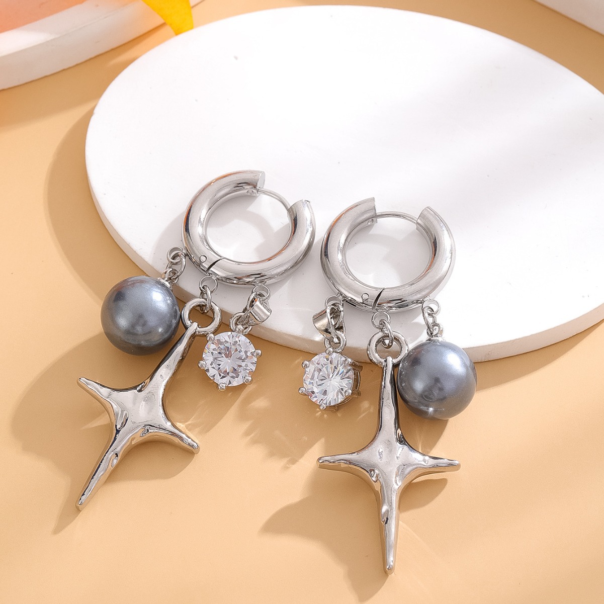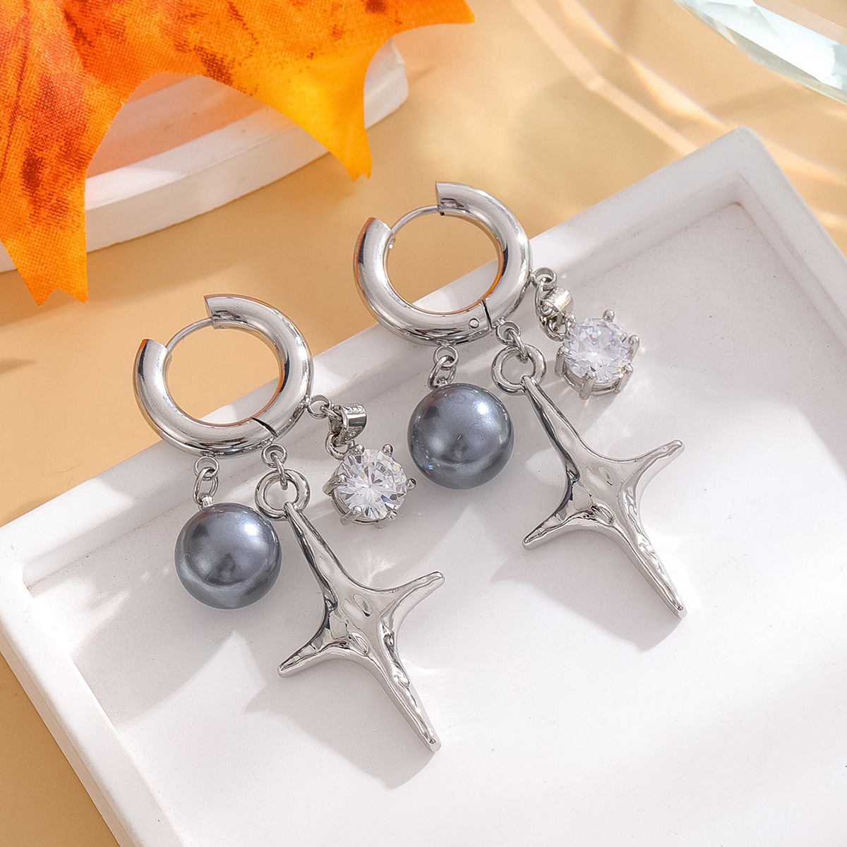Elegant And Luxurious Gray Pearl Four Pointed Star Earrings
