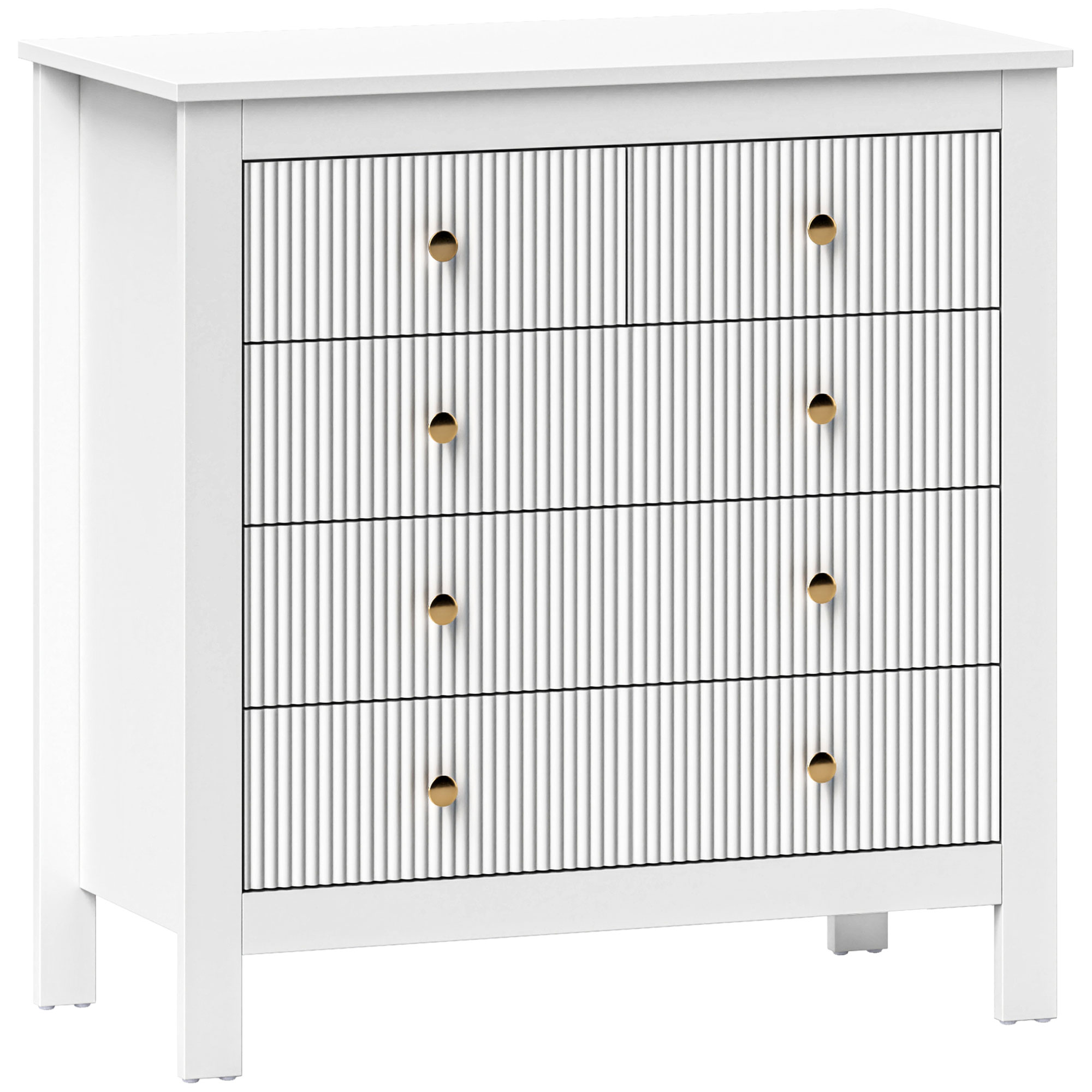 Simple elegance comes with this five drawer chest of drawers. A clean design, with ridged drawer fronts for a touch of texture, plus gold coloured handles for some elegance. With two small drawers and three large, there's plenty of room for clothing and more. Bedroom drawers complete with anti-tipping design for safety.