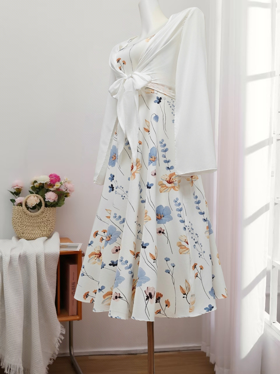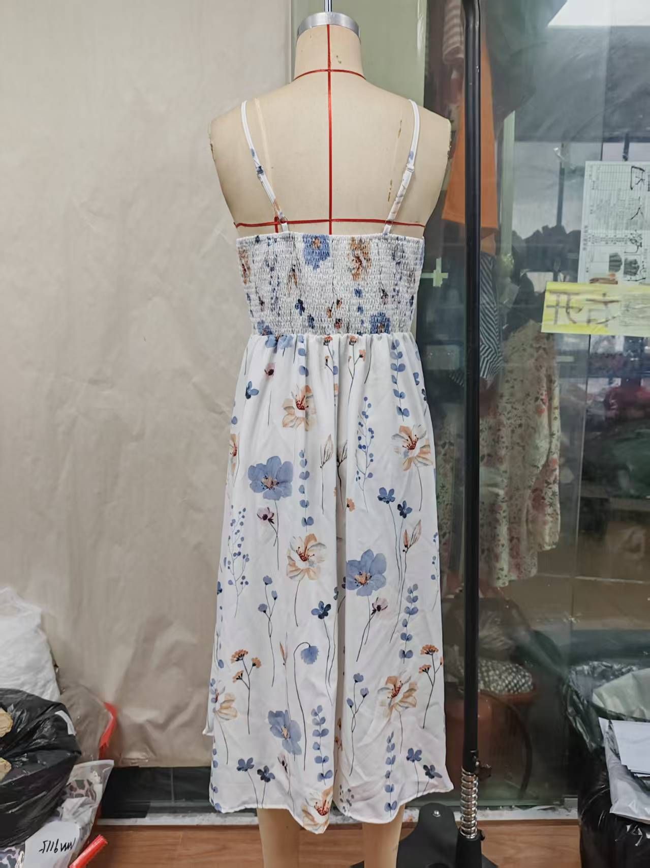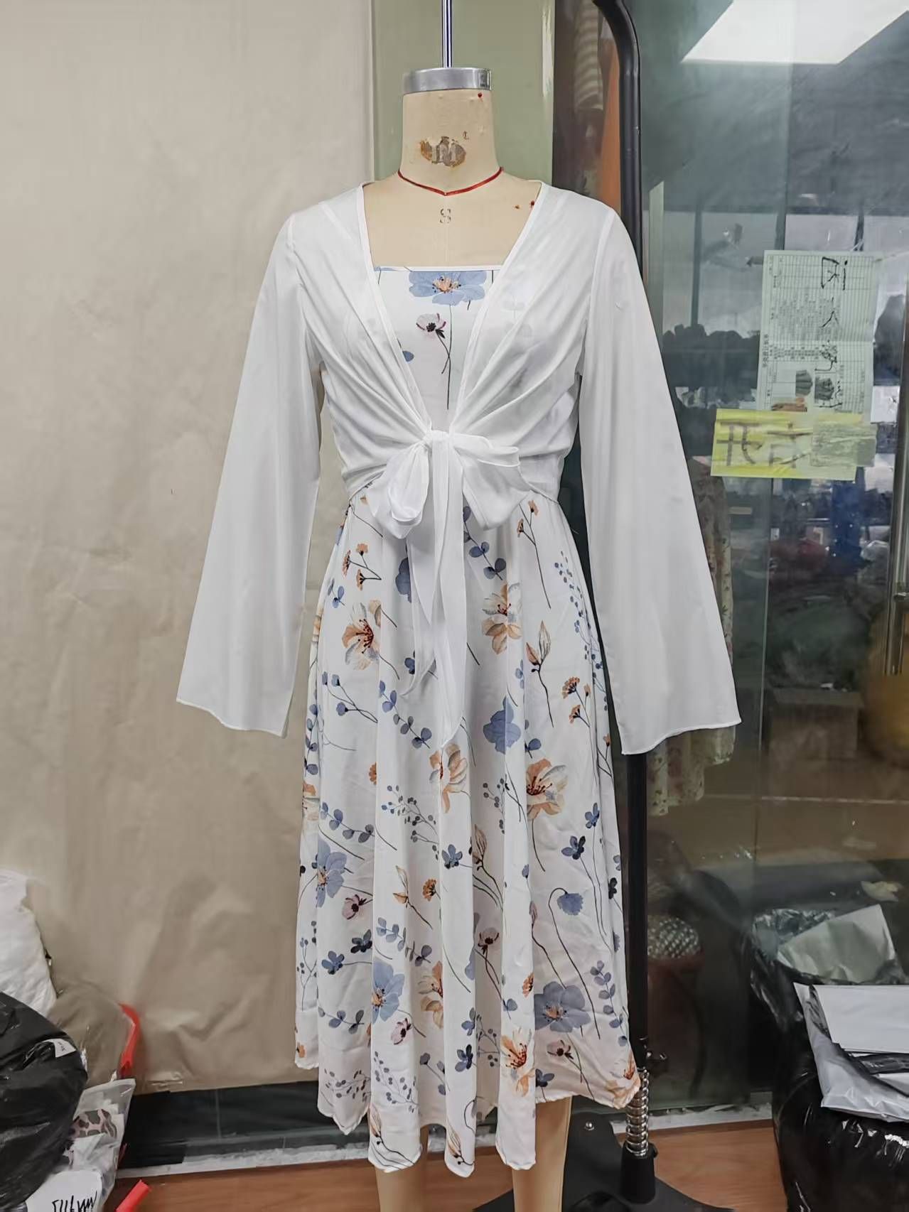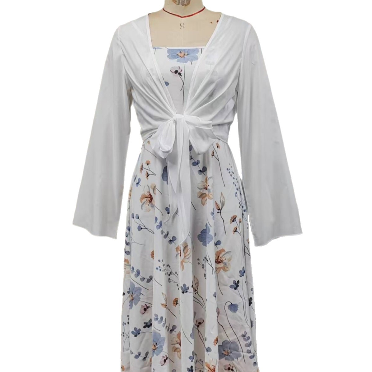 Elegant Floral Spaghetti Strap Dress Slim White Floral Pure Print Set